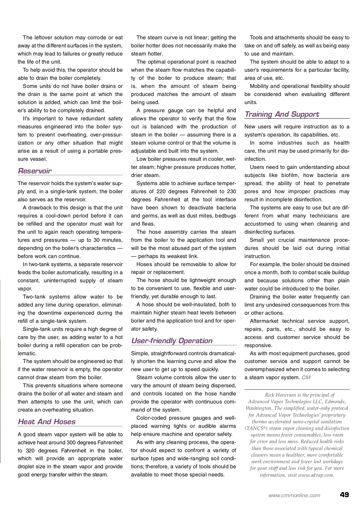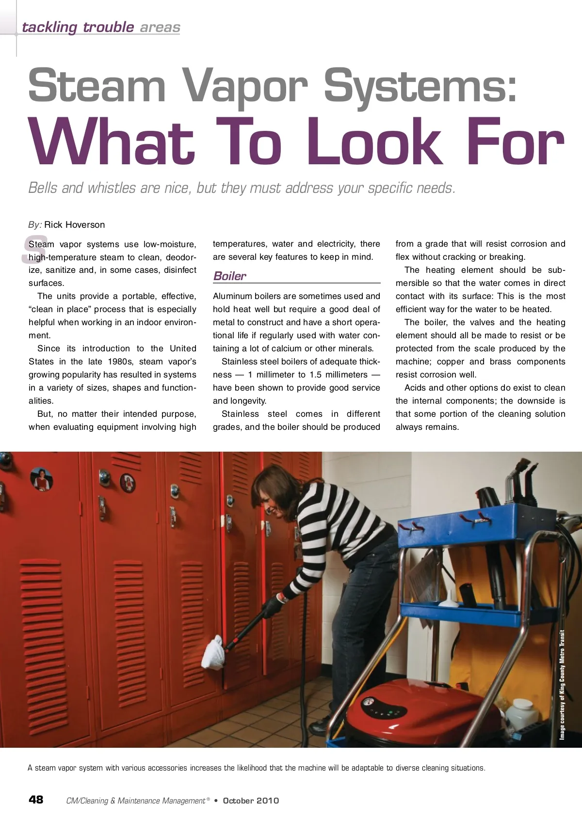 tackling trouble areas Steam Vapor Systems: What To Look For Bells and whistles are nice, but they must address your specific needs. By: Rick Hoverson S Steam vapor systems use low-moisture, high-temperature steam to clean, deodor-ize, sanitize and, in some cases, disinfect surfaces. The units provide a portable, effective, “clean in place” process that is especially helpful when working in an indoor environ-ment. Since its introduction to the United States in the late 1980s, steam vapor’s growing popularity has resulted in systems in a variety of sizes, shapes and function-alities. But, no matter their intended purpose, when evaluating equipment involving high temperatures, water and electricity, there are several key features to keep in mind. Boiler Aluminum boilers are sometimes used and hold heat well but require a good deal of metal to construct and have a short opera-tional life if regularly used with water con-taining a lot of calcium or other minerals. Stainless steel boilers of adequate thick-ness — 1 millimeter to 1.5 millimeters — have been shown to provide good service and longevity. Stainless steel comes in different grades, and the boiler should be produced from a grade that will resist corrosion and flex without cracking or breaking. The heating element should be sub-mersible so that the water comes in direct contact with its surface: This is the most efficient way for the water to be heated. The boiler, the valves and the heating element should all be made to resist or be protected from the scale produced by the machine; copper and brass components resist corrosion well. Acids and other options do exist to clean the internal components; the downside is that some portion of the cleaning solution always remains. A steam vapor system with various accessories increases the likelihood that the machine will be adaptable to diverse cleaning situations. 48 CM/Cleaning & Maintenance Management ® • October 2010 Image courtesy of King County Metro Transit