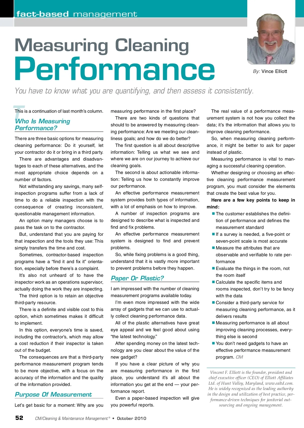 fact-based management Measuring Cleaning Performance T This is a continuation of last month’s column. By: Vince Elliott You have to know what you are quantifying, and then assess it consistently. measuring performance in the first place? There are two kinds of questions that should to be answered by measuring clean-ing performance: Are we meeting our clean-liness goals; and how do we do better? The first question is all about descriptive information: Telling us what we see and where we are on our journey to achieve our cleaning goals. The second is about actionable informa-tion: Telling us how to constantly improve our performance. An effective performance measurement system provides both types of information, with a lot of emphasis on how to improve. A number of inspection programs are designed to describe what is inspected and find and fix problems. An effective performance measurement system is designed to find and prevent problems. So, while fixing problems is a good thing, understand that it is vastly more important to prevent problems before they happen. The real value of a performance meas-urement system is not how you collect the data; it’s the information that allows you to improve cleaning performance. So, when measuring cleaning perform-ance, it might be better to ask for paper instead of plastic. Measuring performance is vital to man-aging a successful cleaning operation. Whether designing or choosing an effec-tive cleaning performance measurement program, you must consider the elements that create the best value for you. Here are a few key points to keep in mind: The customer establishes the defini-tion of performance and defines the measurement standard If a survey is needed, a five-point or seven-point scale is most accurate Measure the attributes that are observable and verifiable to rate per-formance Evaluate the things in the room, not the room itself Calculate the specific items and rooms inspected, don’t try to be fancy with the data Consider a third-party service for measuring cleaning performance, as it delivers results Measuring performance is all about improving cleaning processes, every-thing else is second You don’t need gadgets to have an effective performance measurement program. CM Vincent F. Elliott is the founder, president and chief executive officer (CEO) of Elliott Affiliates Ltd. of Hunt Valley, Maryland, www.ealtd.com. He is widely recognized as the leading authority in the design and utilization of best practice, per-formance-driven techniques for janitorial out-sourcing and ongoing management. Who Is Measuring Performance? There are three basic options for measuring cleaning performance: Do it yourself, let your contractor do it or bring in a third party. There are advantages and disadvan-tages to each of these alternatives, and the most appropriate choice depends on a number of factors. Not withstanding any savings, many self-inspection programs suffer from a lack of time to do a reliable inspection with the consequence of creating inconsistent, questionable management information. An option many managers choose is to pass the task on to the contractor. But, understand that you are paying for that inspection and the tools they use: This simply transfers the time and cost. Sometimes, contractor-based inspection programs have a “find it and fix it” orienta-tion, especially before there’s a complaint. It’s also not unheard of to have the inspector work as an operations supervisor, actually doing the work they are inspecting. The third option is to retain an objective third-party resource. There is a definite and visible cost to this option, which sometimes makes it difficult to implement. In this option, everyone’s time is saved, including the contractor’s, which may allow a cost reduction if their inspector is taken out of the budget. The consequences are that a third-party performance measurement program tends to be more objective, with a focus on the accuracy of the information and the quality of the information provided. Paper Or Plastic? I am impressed with the number of cleaning measurement programs available today. I’m even more impressed with the wide array of gadgets that we can use to actual-ly collect cleaning performance data. All of the plastic alternatives have great eye appeal and we feel good about using “the latest technology.” After spending money on the latest tech-nology are you clear about the value of the new gadget? If you have a clear picture of why you are measuring performance in the first place, you understand it’s all about the information you get at the end — your per-formance report. Even a paper-based inspection will give you powerful reports. Purpose Of Measurement Let’s get basic for a moment: Why are you 52 CM/Cleaning & Maintenance Management ® • October 2010