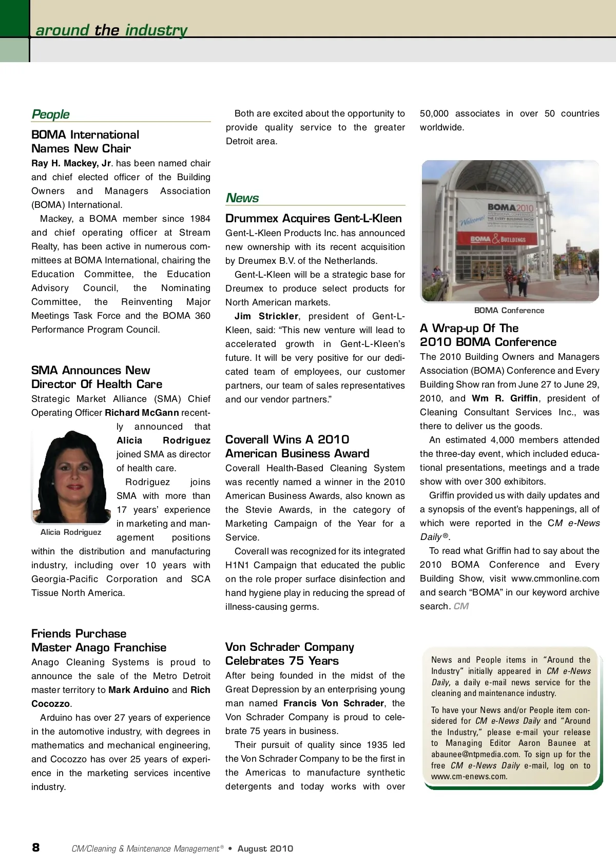 around the industry People BOMA International Names New Chair Ray H. Mackey, Jr . has been named chair and chief elected officer of the Building Owners and Managers Association (BOMA) International. Mackey, a BOMA member since 1984 and chief operating officer at Stream Realty, has been active in numerous com-mittees at BOMA International, chairing the Education Committee, the Education Advisory Council, the Nominating Committee, the Reinventing Major Meetings Task Force and the BOMA 360 Performance Program Council. Both are excited about the opportunity to provide quality service to the greater Detroit area. 50,000 associates in over 50 countries worldwide. News Drummex Acquires Gent-L-Kleen Gent-L-Kleen Products Inc. has announced new ownership with its recent acquisition by Dreumex B.V. of the Netherlands. Gent-L-Kleen will be a strategic base for Dreumex to produce select products for North American markets. Jim Strickler , president of Gent-L-Kleen, said: “This new venture will lead to accelerated growth in Gent-L-Kleen’s future. It will be very positive for our dedi-cated team of employees, our customer partners, our team of sales representatives and our vendor partners.” BOMA Conference A Wrap-up Of The 2010 BOMA Conference The 2010 Building Owners and Managers Association (BOMA) Conference and Every Building Show ran from June 27 to June 29, 2010, and Wm R. Griffin , president of Cleaning Consultant Services Inc., was there to deliver us the goods. An estimated 4,000 members attended the three-day event, which included educa-tional presentations, meetings and a trade show with over 300 exhibitors. Griffin provided us with daily updates and a synopsis of the event’s happenings, all of which were reported in the C M e-News Daily ® . To read what Griffin had to say about the 2010 BOMA Conference and Every Building Show, visit www.cmmonline.com and search “BOMA” in our keyword archive search. CM SMA Announces New Director Of Health Care Strategic Market Alliance (SMA) Chief Operating Officer Richard McGann recent-ly announced that Alicia Rodriguez joined SMA as director of health care. Rodriguez joins SMA with more than 17 years’ experience in marketing and man-Alicia Rodriguez agement positions within the distribution and manufacturing industry, including over 10 years with Georgia-Pacific Corporation and SCA Tissue North America. Coverall Wins A 2010 American Business Award Coverall Health-Based Cleaning System was recently named a winner in the 2010 American Business Awards, also known as the Stevie Awards, in the category of Marketing Campaign of the Year for a Service. Coverall was recognized for its integrated H1N1 Campaign that educated the public on the role proper surface disinfection and hand hygiene play in reducing the spread of illness-causing germs. Friends Purchase Master Anago Franchise Anago Cleaning Systems is proud to announce the sale of the Metro Detroit master territory to Mark Arduino and Rich Cocozzo . Arduino has over 27 years of experience in the automotive industry, with degrees in mathematics and mechanical engineering, and Cocozzo has over 25 years of experi-ence in the marketing services incentive industry. Von Schrader Company Celebrates 75 Years After being founded in the midst of the Great Depression by an enterprising young man named Francis Von Schrader , the Von Schrader Company is proud to cele-brate 75 years in business. Their pursuit of quality since 1935 led the Von Schrader Company to be the first in the Americas to manufacture synthetic detergents and today works with over News and People items in “Around the Industry” initially appeared in CM e-News Daily , a daily e-mail news service for the cleaning and maintenance industry. To have your News and/or People item con-sidered for CM e-News Daily and “Around the Industry,” please e-mail your release to Managing Editor Aaron Baunee at [email protected]. To sign up for the free CM e-News Daily e-mail, log on to www.cm-enews.com. 8 CM/Cleaning & Maintenance Management ® • August 2010