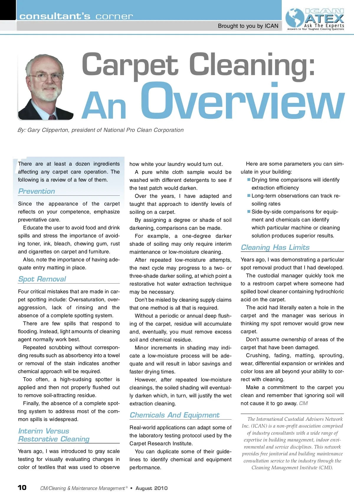 consultant’s corner Brought to you by ICAN Carpet Cleaning: An T There are at least a dozen ingredients affecting any carpet care operation. The following is a review of a few of them. By: Gary Clipperton, president of National Pro Clean Corporation Overview Here are some parameters you can sim-ulate in your building: Drying time comparisons will identify extraction efficiency Long-term observations can track re-soiling rates Side-by-side comparisons for equip-ment and chemicals can identify which particular machine or cleaning solution produces superior results. Prevention Since the appearance of the carpet reflects on your competence, emphasize preventative care. Educate the user to avoid food and drink spills and stress the importance of avoid-ing toner, ink, bleach, chewing gum, rust and cigarettes on carpet and furniture. Also, note the importance of having ade-quate entry matting in place. Spot Removal Four critical mistakes that are made in car-pet spotting include: Oversaturation, over-aggression, lack of rinsing and the absence of a complete spotting system. There are few spills that respond to flooding. Instead, light amounts of cleaning agent normally work best. Repeated scrubbing without correspon-ding results such as absorbency into a towel or removal of the stain indicates another chemical approach will be required. Too often, a high-sudsing spotter is applied and then not properly flushed out to remove soil-attracting residue. Finally, the absence of a complete spot-ting system to address most of the com-mon spills is widespread. how white your laundry would turn out. A pure white cloth sample would be washed with different detergents to see if the test patch would darken. Over the years, I have adapted and taught that approach to identify levels of soiling on a carpet. By assigning a degree or shade of soil darkening, comparisons can be made. For example, a one-degree darker shade of soiling may only require interim maintenance or low-moisture cleaning. After repeated low-moisture attempts, the next cycle may progress to a two-or three-shade darker soiling, at which point a restorative hot water extraction technique may be necessary. Don’t be misled by cleaning supply claims that one method is all that is required. Without a periodic or annual deep flush-ing of the carpet, residue will accumulate and, eventually, you must remove excess soil and chemical residue. Minor increments in shading may indi-cate a low-moisture process will be ade-quate and will result in labor savings and faster drying times. However, after repeated low-moisture cleanings, the soiled shading will eventual-ly darken which, in turn, will justify the wet extraction cleaning. Cleaning Has Limits Years ago, I was demonstrating a particular spot removal product that I had developed. The custodial manager quickly took me to a restroom carpet where someone had spilled bowl cleaner containing hydrochloric acid on the carpet. The acid had literally eaten a hole in the carpet and the manager was serious in thinking my spot remover would grow new carpet. Don’t assume ownership of areas of the carpet that have been damaged. Crushing, fading, matting, sprouting, wear, differential expansion or wrinkles and color loss are all beyond your ability to cor-rect with cleaning. Make a commitment to the carpet you clean and remember that ignoring soil will not cause it to go away. CM The International Custodial Advisors Network Inc. (ICAN) is a non-profit association comprised of industry consultants with a wide range of expertise in building management, indoor envi-ronmental and service disciplines. This network provides free janitorial and building maintenance consultation service to the industry through the Cleaning Management Institute (CMI). Chemicals And Equipment Real-world applications can adapt some of the laboratory testing protocol used by the Carpet Research Institute. You can duplicate some of their guide-lines to identify chemical and equipment performance. Interim Versus Restorative Cleaning Years ago, I was introduced to gray scale testing for visually evaluating changes in color of textiles that was used to observe 10 CM/Cleaning & Maintenance Management ® • August 2010