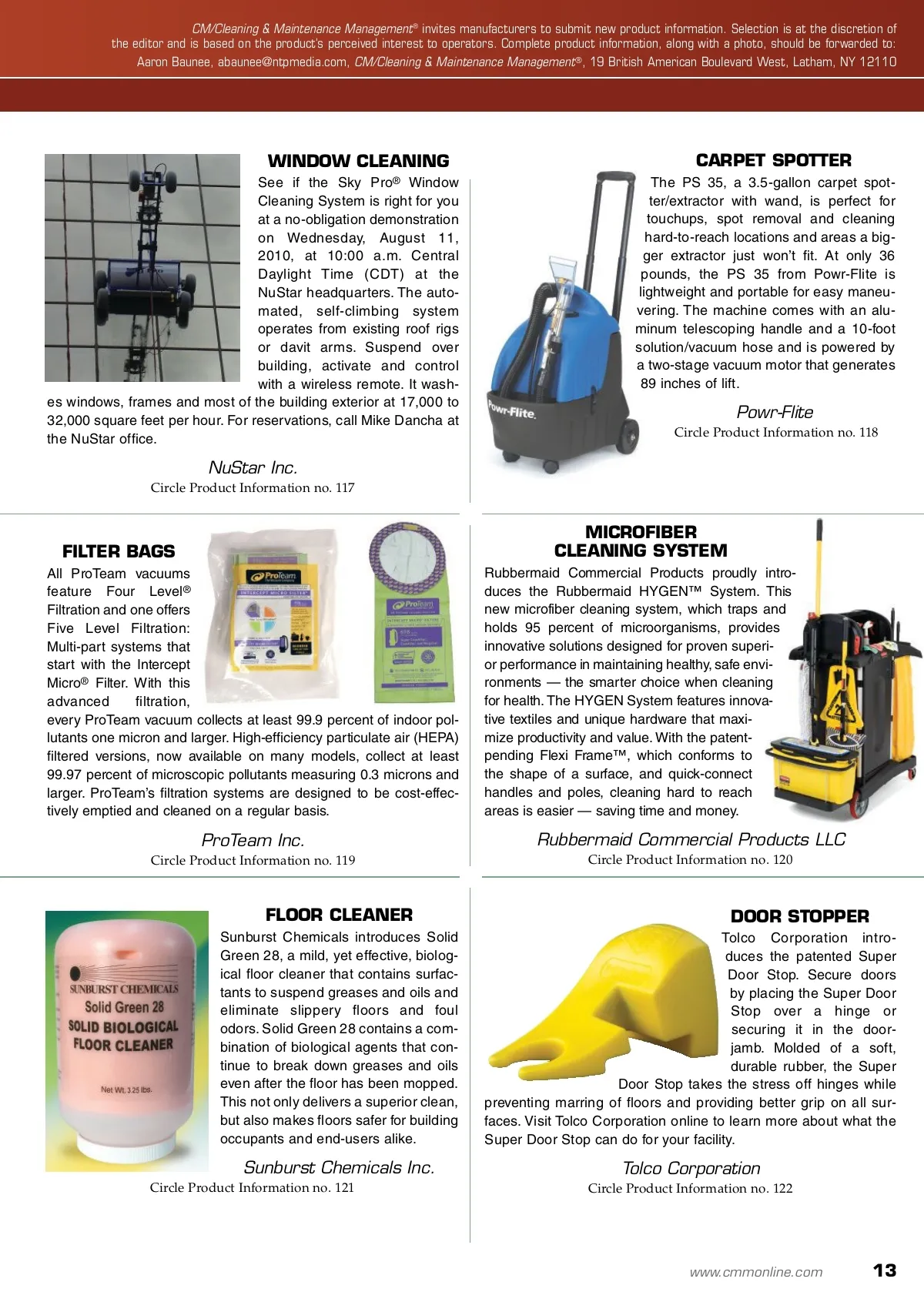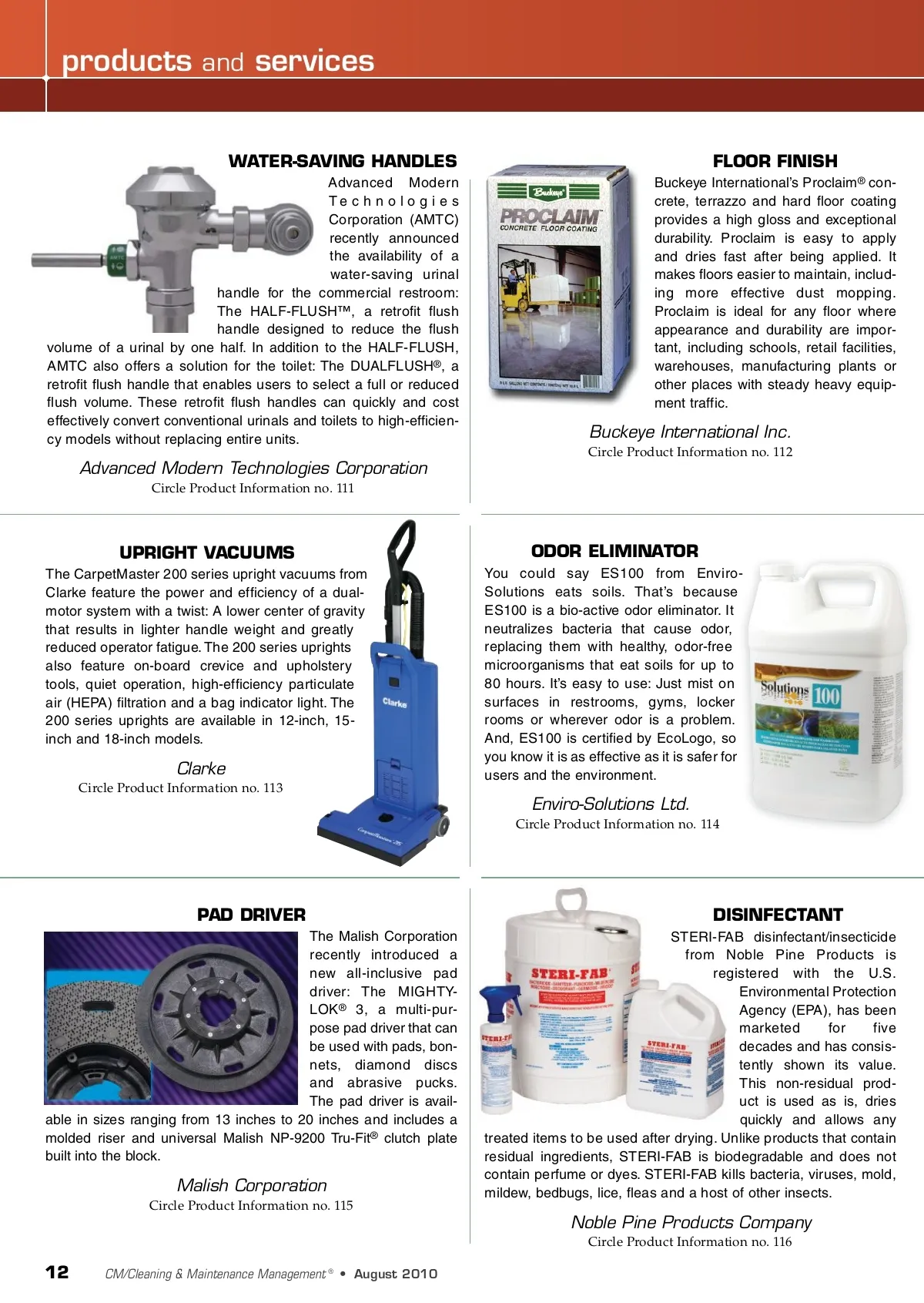 products and services WATER-SAVING HANDLES Advanced Modern Te c h n o l o g i e s Corporation (AMTC) recently announced the availability of a water-saving urinal handle for the commercial restroom: The HALF-FLUSH™, a retrofit flush handle designed to reduce the flush volume of a urinal by one half. In addition to the HALF-FLUSH, AMTC also offers a solution for the toilet: The DUALFLUSH ® , a retrofit flush handle that enables users to select a full or reduced flush volume. These retrofit flush handles can quickly and cost effectively convert conventional urinals and toilets to high-efficien-cy models without replacing entire units. FLOOR FINISH Buckeye International’s Proclaim ® con-crete, terrazzo and hard floor coating provides a high gloss and exceptional durability. Proclaim is easy to apply and dries fast after being applied. It makes floors easier to maintain, includ-ing more effective dust mopping. Proclaim is ideal for any floor where appearance and durability are impor-tant, including schools, retail facilities, warehouses, manufacturing plants or other places with steady heavy equip-ment traffic. Buckeye International Inc. Circle Product Information no. 112 Advanced Modern Technologies Corporation Circle Product Information no. 111 UPRIGHT VACUUMS The CarpetMaster 200 series upright vacuums from Clarke feature the power and efficiency of a dual-motor system with a twist: A lower center of gravity that results in lighter handle weight and greatly reduced operator fatigue. The 200 series uprights also feature on-board crevice and upholstery tools, quiet operation, high-efficiency particulate air (HEPA) filtration and a bag indicator light. The 200 series uprights are available in 12-inch, 15-inch and 18-inch models. ODOR ELIMINATOR You could say ES100 from Enviro-Solutions eats soils. That’s because ES100 is a bio-active odor eliminator. It neutralizes bacteria that cause odor, replacing them with healthy, odor-free microorganisms that eat soils for up to 80 hours. It’s easy to use: Just mist on surfaces in restrooms, gyms, locker rooms or wherever odor is a problem. And, ES100 is certified by EcoLogo, so you know it is as effective as it is safer for users and the environment. Clarke Circle Product Information no. 113 Enviro-Solutions Ltd. Circle Product Information no. 114 PAD DRIVER The Malish Corporation recently introduced a new all-inclusive pad driver: The MIGHTY-LOK ® 3, a multi-pur-pose pad driver that can be used with pads, bon-nets, diamond discs and abrasive pucks. The pad driver is avail-able in sizes ranging from 13 inches to 20 inches and includes a molded riser and universal Malish NP-9200 Tru-Fit ® clutch plate built into the block. DISINFECTANT STERI-FAB disinfectant/insecticide from Noble Pine Products is registered with the U.S. Environmental Protection Agency (EPA), has been marketed for five decades and has consis-tently shown its value. This non-residual prod-uct is used as is, dries quickly and allows any treated items to be used after drying. Unlike products that contain residual ingredients, STERI-FAB is biodegradable and does not contain perfume or dyes. STERI-FAB kills bacteria, viruses, mold, mildew, bedbugs, lice, fleas and a host of other insects. Malish Corporation Circle Product Information no. 115 Noble Pine Products Company Circle Product Information no. 116 12 CM/Cleaning & Maintenance Management ® • August 2010