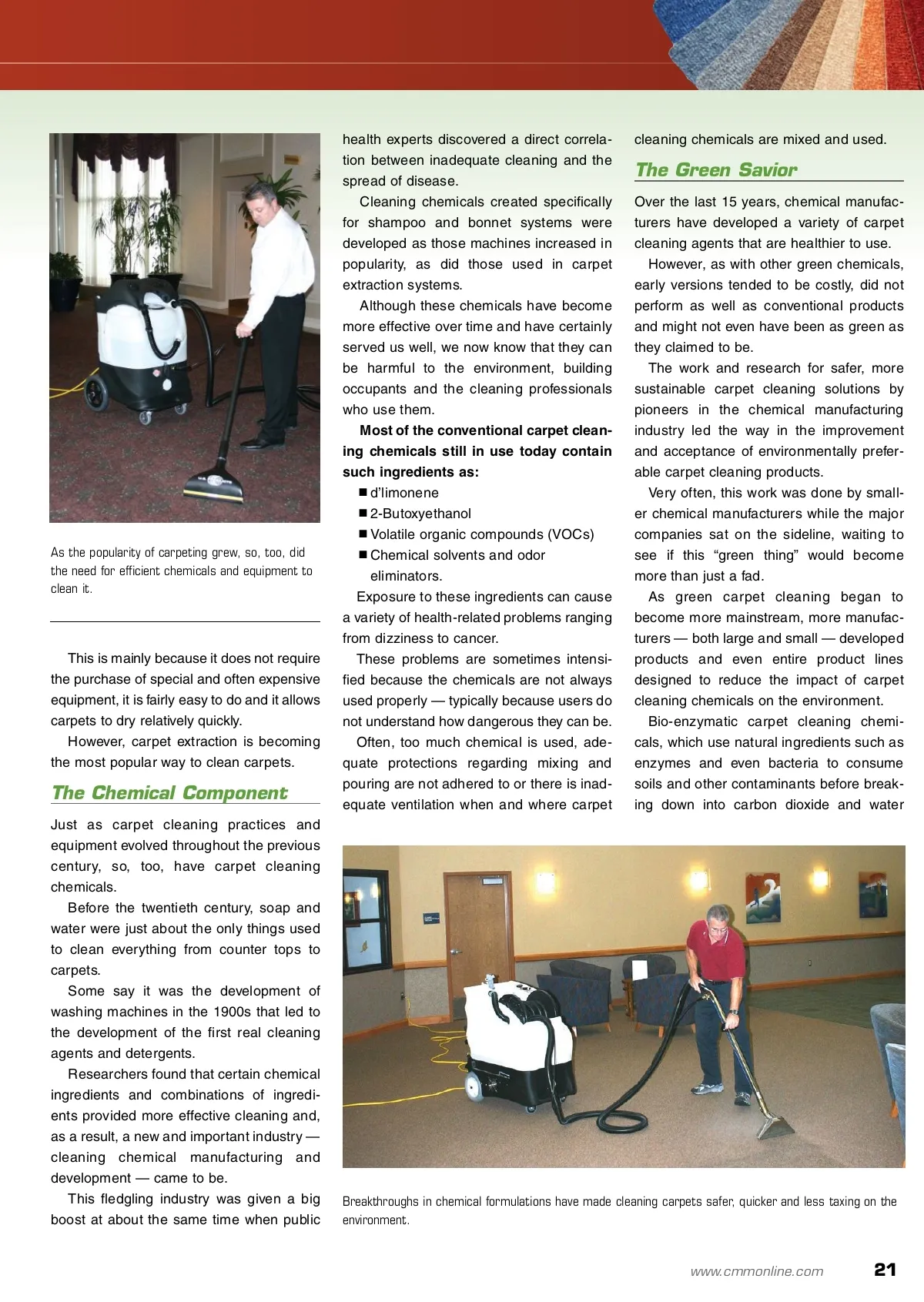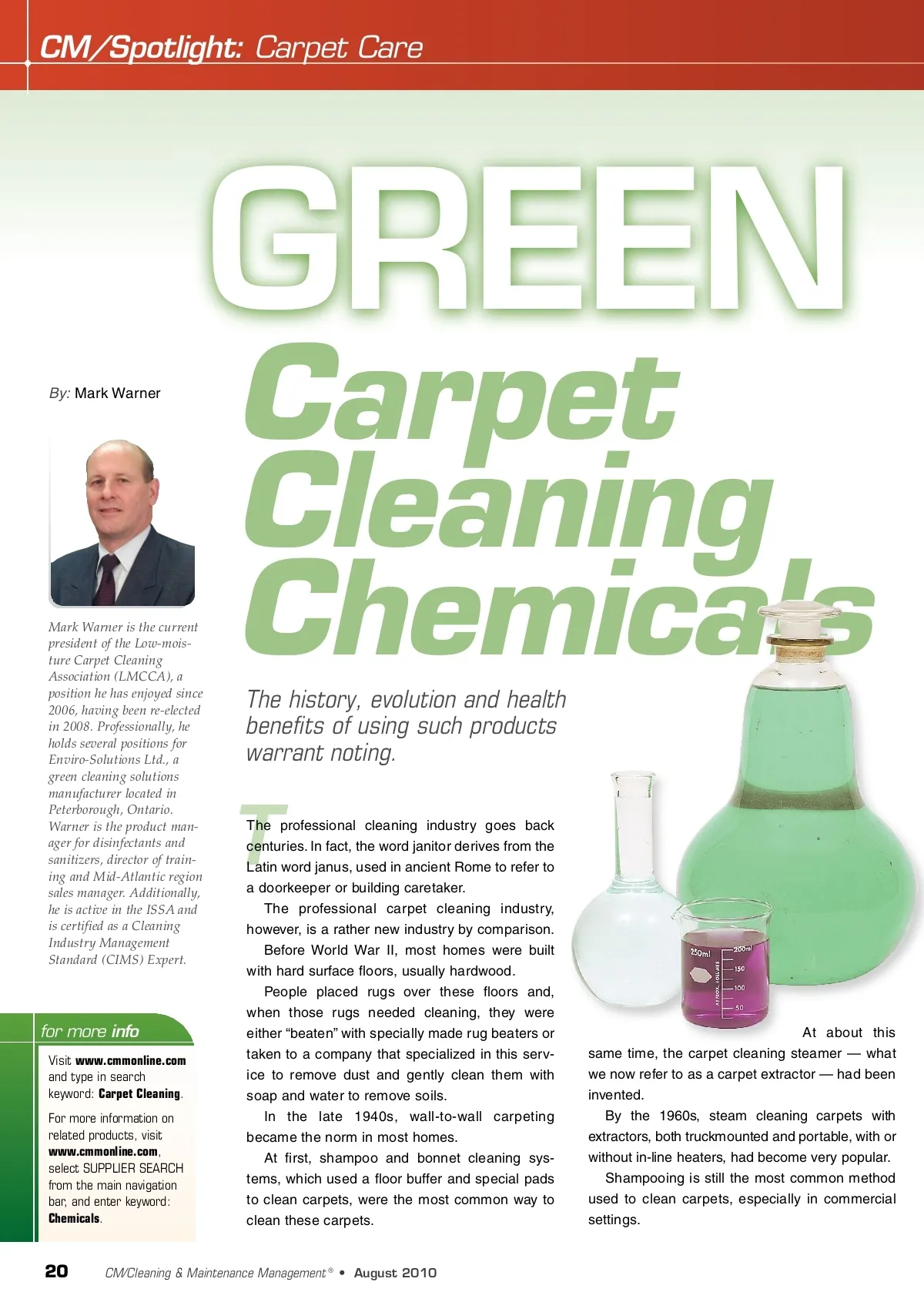 GREEN By: Mark Warner Mark Warner is the current president of the Low-mois-ture Carpet Cleaning Association (LMCCA), a position he has enjoyed since 2006, having been re-elected in 2008. Professionally, he holds several positions for Enviro-Solutions Ltd., a green cleaning solutions manufacturer located in Peterborough, Ontario. Warner is the product man-ager for disinfectants and sanitizers, director of train-ing and Mid-Atlantic region sales manager. Additionally, he is active in the ISSA and is certified as a Cleaning Industry Management Standard (CIMS) Expert. Carpet Cleaning Chemicals The professional cleaning industry goes back centuries. In fact, the word janitor derives from the Latin word janus, used in ancient Rome to refer to a doorkeeper or building caretaker. The professional carpet cleaning industry, however, is a rather new industry by comparison. Before World War II, most homes were built with hard surface floors, usually hardwood. People placed rugs over these floors and, when those rugs needed cleaning, they were either “beaten” with specially made rug beaters or taken to a company that specialized in this serv-ice to remove dust and gently clean them with soap and water to remove soils. In the late 1940s, wall-to-wall carpeting became the norm in most homes. At first, shampoo and bonnet cleaning sys-tems, which used a floor buffer and special pads to clean carpets, were the most common way to clean these carpets. T for more info Visit www.cmmonline.com and type in search keyword: Carpet Cleaning . For more information on related products, visit www.cmmonline.com , select SUPPLIER SEARCH from the main navigation bar, and enter keyword: Chemicals . At about this same time, the carpet cleaning steamer — what we now refer to as a carpet extractor — had been invented. By the 1960s, steam cleaning carpets with extractors, both truckmounted and portable, with or without in-line heaters, had become very popular. Shampooing is still the most common method used to clean carpets, especially in commercial settings. 20 CM/Cleaning & Maintenance Management ® • August 2010