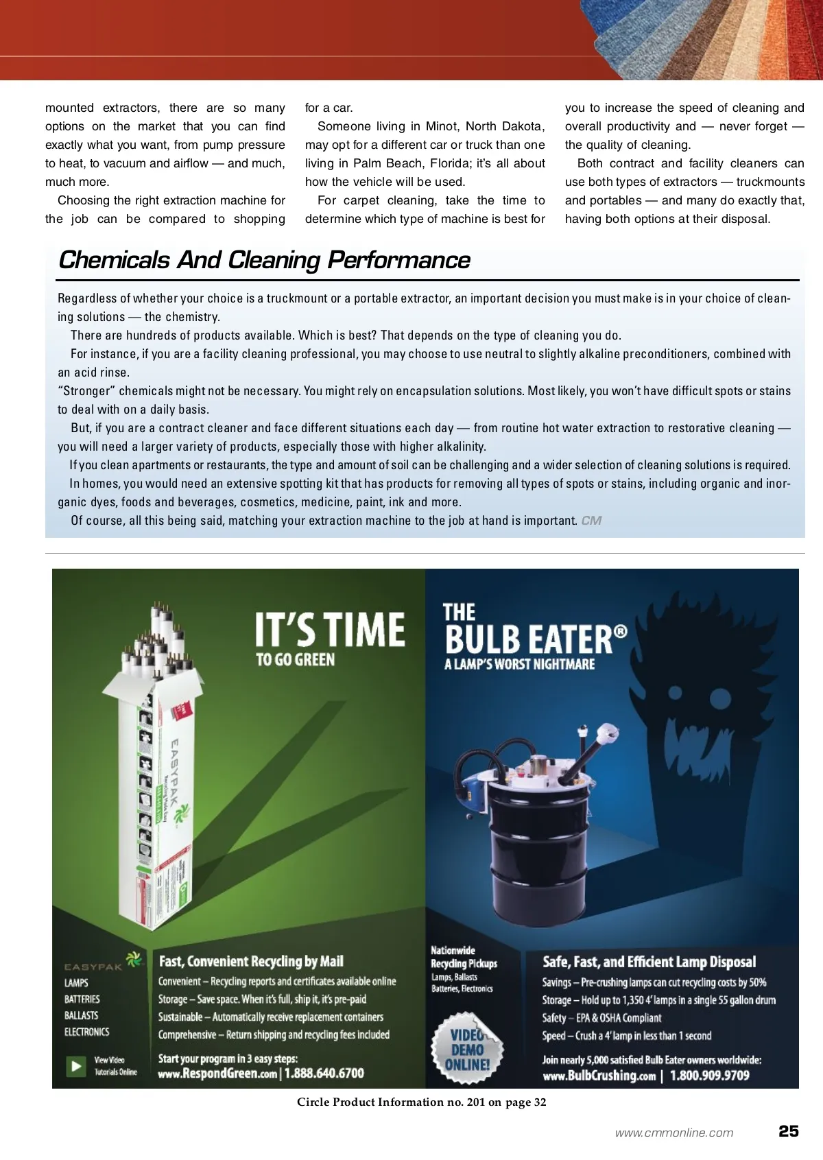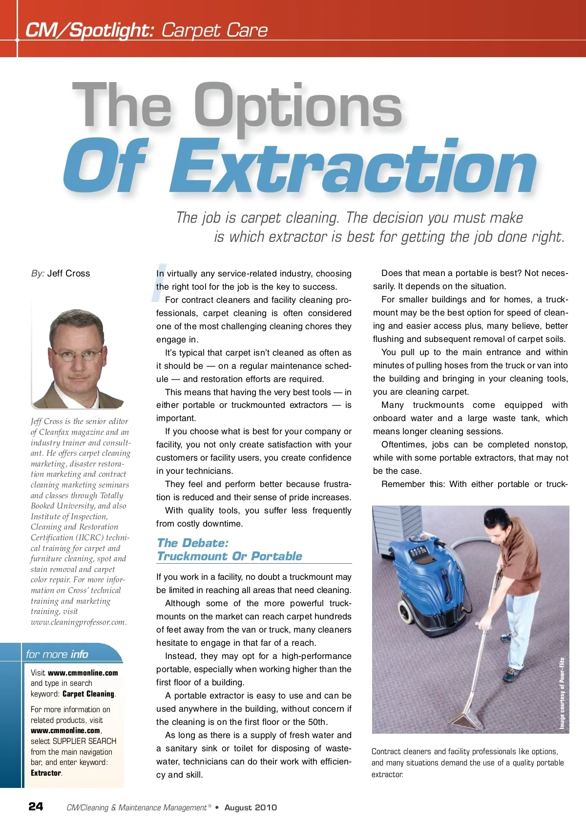 Of Extraction The job is carpet cleaning. The decision you must make is which extractor is best for getting the job done right. By: Jeff Cross The Options I In virtually any service-related industry, choosing the right tool for the job is the key to success. For contract cleaners and facility cleaning pro-fessionals, carpet cleaning is often considered one of the most challenging cleaning chores they engage in. It’s typical that carpet isn’t cleaned as often as it should be — on a regular maintenance sched-ule — and restoration efforts are required. This means that having the very best tools — in either portable or truckmounted extractors — is important. If you choose what is best for your company or facility, you not only create satisfaction with your customers or facility users, you create confidence in your technicians. They feel and perform better because frustra-tion is reduced and their sense of pride increases. With quality tools, you suffer less frequently from costly downtime. Jeff Cross is the senior editor of Cleanfax magazine and an industry trainer and consult-ant. He offers carpet cleaning marketing, disaster restora-tion marketing and contract cleaning marketing seminars and classes through Totally Booked University, and also Institute of Inspection, Cleaning and Restoration Certification (IICRC) techni-cal training for carpet and furniture cleaning, spot and stain removal and carpet color repair. For more infor-mation on Cross’ technical training and marketing training, visit www.cleaningprofessor.com. Does that mean a portable is best? Not neces-sarily. It depends on the situation. For smaller buildings and for homes, a truck-mount may be the best option for speed of clean-ing and easier access plus, many believe, better flushing and subsequent removal of carpet soils. You pull up to the main entrance and within minutes of pulling hoses from the truck or van into the building and bringing in your cleaning tools, you are cleaning carpet. Many truckmounts come equipped with onboard water and a large waste tank, which means longer cleaning sessions. Oftentimes, jobs can be completed nonstop, while with some portable extractors, that may not be the case. Remember this: With either portable or truck-The Debate: Truckmount Or Portable If you work in a facility, no doubt a truckmount may be limited in reaching all areas that need cleaning. Although some of the more powerful truck-mounts on the market can reach carpet hundreds of feet away from the van or truck, many cleaners hesitate to engage in that far of a reach. Instead, they may opt for a high-performance portable, especially when working higher than the first floor of a building. A portable extractor is easy to use and can be used anywhere in the building, without concern if the cleaning is on the first floor or the 50th. As long as there is a supply of fresh water and a sanitary sink or toilet for disposing of waste-water, technicians can do their work with efficien-cy and skill. for more info Visit www.cmmonline.com and type in search keyword: Carpet Cleaning . For more information on related products, visit www.cmmonline.com , select SUPPLIER SEARCH from the main navigation bar, and enter keyword: Extractor . Contract cleaners and facility professionals like options, and many situations demand the use of a quality portable extractor. 24 CM/Cleaning & Maintenance Management ® • August 2010
