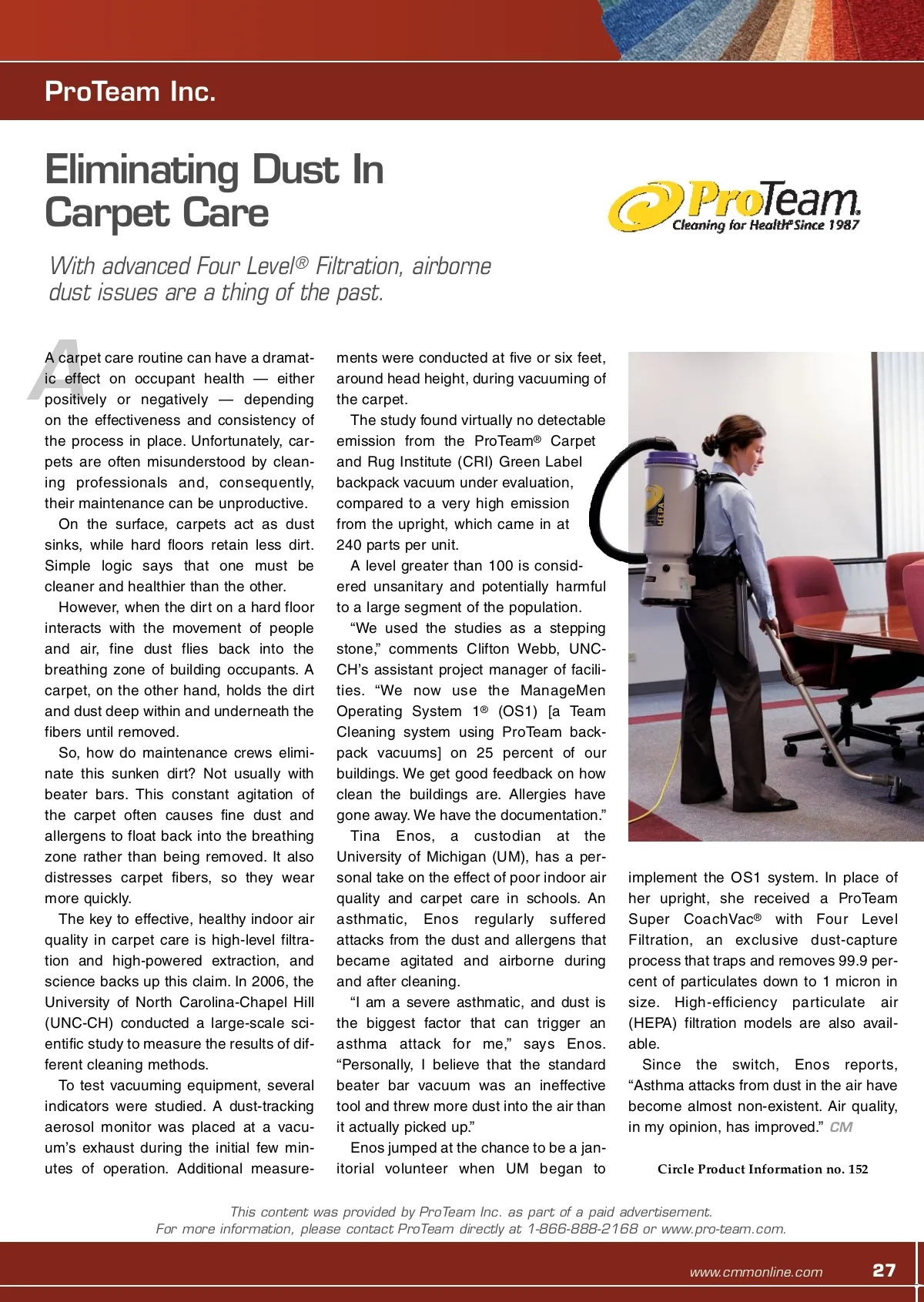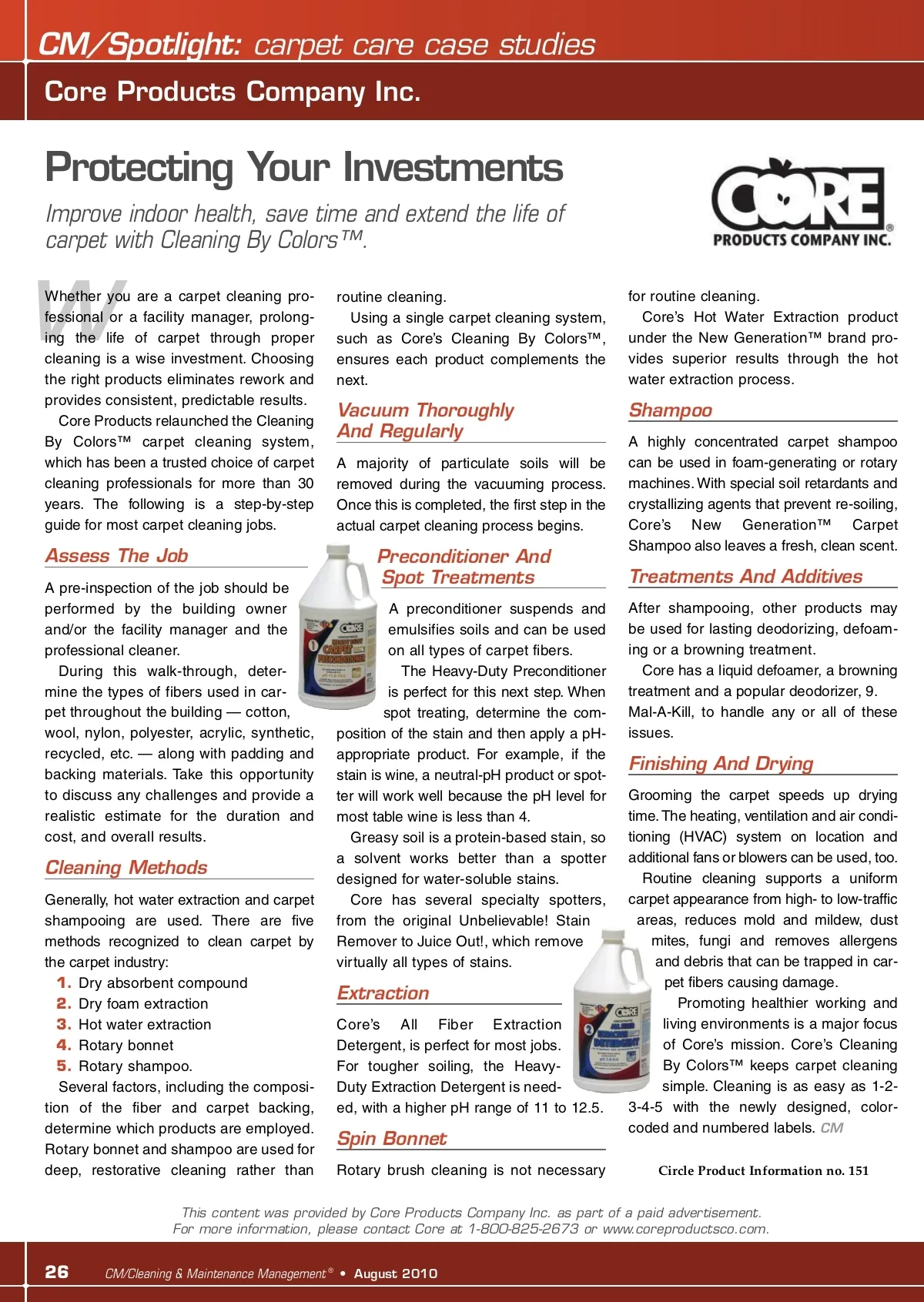 CM/Spotlight: carpet care case studies Core Products Company Inc. Protecting Your Investments Improve indoor health, save time and extend the life of carpet with Cleaning By Colors™. W Whether you are a carpet cleaning pro-fessional or a facility manager, prolong-ing the life of carpet through proper cleaning is a wise investment. Choosing the right products eliminates rework and provides consistent, predictable results. Core Products relaunched the Cleaning By Colors™ carpet cleaning system, which has been a trusted choice of carpet cleaning professionals for more than 30 years. The following is a step-by-step guide for most carpet cleaning jobs. routine cleaning. Using a single carpet cleaning system, such as Core’s Cleaning By Colors™, ensures each product complements the next. for routine cleaning. Core’s Hot Water Extraction product under the New Generation™ brand pro-vides superior results through the hot water extraction process. Vacuum Thoroughly And Regularly A majority of particulate soils will be removed during the vacuuming process. Once this is completed, the first step in the actual carpet cleaning process begins. Shampoo A highly concentrated carpet shampoo can be used in foam-generating or rotary machines. With special soil retardants and crystallizing agents that prevent re-soiling, Core’s New Generation™ Carpet Shampoo also leaves a fresh, clean scent. Assess The Job A pre-inspection of the job should be performed by the building owner and/or the facility manager and the professional cleaner. During this walk-through, deter-mine the types of fibers used in car-pet throughout the building — cotton, wool, nylon, polyester, acrylic, synthetic, recycled, etc. — along with padding and backing materials. Take this opportunity to discuss any challenges and provide a realistic estimate for the duration and cost, and overall results. Preconditioner And Spot Treatments A preconditioner suspends and emulsifies soils and can be used on all types of carpet fibers. The Heavy-Duty Preconditioner is perfect for this next step. When spot treating, determine the com-position of the stain and then apply a pH-appropriate product. For example, if the stain is wine, a neutral-pH product or spot-ter will work well because the pH level for most table wine is less than 4. Greasy soil is a protein-based stain, so a solvent works better than a spotter designed for water-soluble stains. Core has several specialty spotters, from the original Unbelievable! Stain Remover to Juice Out!, which remove virtually all types of stains. Treatments And Additives After shampooing, other products may be used for lasting deodorizing, defoam-ing or a browning treatment. Core has a liquid defoamer, a browning treatment and a popular deodorizer, 9. Mal-A-Kill, to handle any or all of these issues. Finishing And Drying Grooming the carpet speeds up drying time. The heating, ventilation and air condi-tioning (HVAC) system on location and additional fans or blowers can be used, too. Routine cleaning supports a uniform carpet appearance from high-to low-traffic areas, reduces mold and mildew, dust mites, fungi and removes allergens and debris that can be trapped in car-pet fibers causing damage. Promoting healthier working and living environments is a major focus of Core’s mission. Core’s Cleaning By Colors™ keeps carpet cleaning simple. Cleaning is as easy as 1-2-3-4-5 with the newly designed, color-coded and numbered labels. CM Circle Product Information no. 151 Cleaning Methods Generally, hot water extraction and carpet shampooing are used. There are five methods recognized to clean carpet by the carpet industry: 1. Dry absorbent compound 2. Dry foam extraction 3. Hot water extraction 4. Rotary bonnet 5. Rotary shampoo. Several factors, including the composi-tion of the fiber and carpet backing, determine which products are employed. Rotary bonnet and shampoo are used for deep, restorative cleaning rather than Extraction Core’s All Fiber Extraction Detergent, is perfect for most jobs. For tougher soiling, the Heavy-Duty Extraction Detergent is need-ed, with a higher pH range of 11 to 12.5. Spin Bonnet Rotary brush cleaning is not necessary This content was provided by Core Products Company Inc. as part of a paid advertisement. For more information, please contact Core at 1-800-825-2673 or www.coreproductsco.com. 26 CM/Cleaning & Maintenance Management ® • August 2010