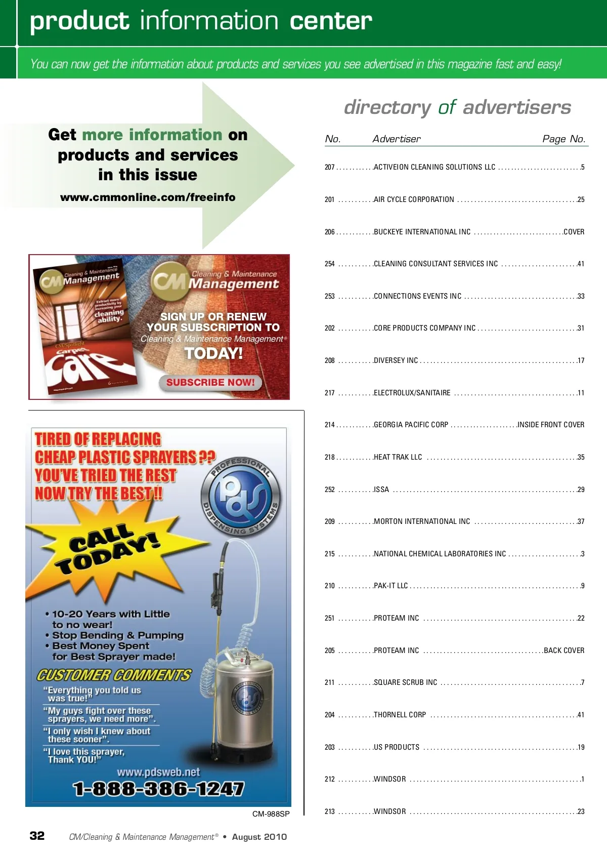 product information center You can now get the information about products and services you see advertised in this magazine fast and easy! directory of advertisers Get more information on products and services in this issue www.cmmonline.com/freeinfo No. Advertiser Page No. 207 . . . . . . . . . . . .ACTIVEION CLEANING SOLUTIONS LLC . . . . . . . . . . . . . . . . . . . . . . . . . .5 201 . . . . . . . . . . .AIR CYCLE CORPORATION . . . . . . . . . . . . . . . . . . . . . . . . . . . . . . . . . . . .25 206 . . . . . . . . . . . .BUCKEYE INTERNATIONAL INC . . . . . . . . . . . . . . . . . . . . . . . . . . . .COVER August 2010 254 . . . . . . . . . . .CLEANING CONSULTANT SERVICES INC . . . . . . . . . . . . . . . . . . . . . . .41 253 . . . . . . . . . . .CONNECTIONS EVENTS INC . . . . . . . . . . . . . . . . . . . . . . . . . . . . . . . . . .33 SIGN UP OR RENEW YOUR SUBSCRIPTION TO Cleaning & Maintenance Management ® 202 . . . . . . . . . . .CORE PRODUCTS COMPANY INC . . . . . . . . . . . . . . . . . . . . . . . . . . . . . .31 TODAY! V G GRAND EDIA VIEW M GROUP 208 . . . . . . . . . . .DIVERSEY INC . . . . . . . . . . . . . . . . . . . . . . . . . . . . . . . . . . . . . . . . . . . . . . .17 SUBSCRIBE NOW! 217 . . . . . . . . . . .ELECTROLUX/SANITAIRE . . . . . . . . . . . . . . . . . . . . . . . . . . . . . . . . . . . . .11 nline.com www.cmmo 214 . . . . . . . . . . . .GEORGIA PACIFIC CORP . . . . . . . . . . . . . . . . . . . . .INSIDE FRONT COVER 218 . . . . . . . . . . . .HEAT TRAK LLC . . . . . . . . . . . . . . . . . . . . . . . . . . . . . . . . . . . . . . . . . . . . .35 252 . . . . . . . . . . .ISSA . . . . . . . . . . . . . . . . . . . . . . . . . . . . . . . . . . . . . . . . . . . . . . . . . . . . . . .29 209 . . . . . . . . . . .MORTON INTERNATIONAL INC . . . . . . . . . . . . . . . . . . . . . . . . . . . . . . .37 215 . . . . . . . . . . .NATIONAL CHEMICAL LABORATORIES INC . . . . . . . . . . . . . . . . . . . . . .3 210 . . . . . . . . . . .PAK-IT LLC . . . . . . . . . . . . . . . . . . . . . . . . . . . . . . . . . . . . . . . . . . . . . . . . . . .9 251 . . . . . . . . . . .PROTEAM INC . . . . . . . . . . . . . . . . . . . . . . . . . . . . . . . . . . . . . . . . . . . . . .22 205 . . . . . . . . . . .PROTEAM INC . . . . . . . . . . . . . . . . . . . . . . . . . . . . . . . . . . . .BACK COVER 211 . . . . . . . . . . .SQUARE SCRUB INC . . . . . . . . . . . . . . . . . . . . . . . . . . . . . . . . . . . . . . . . . .7 204 . . . . . . . . . . .THORNELL CORP . . . . . . . . . . . . . . . . . . . . . . . . . . . . . . . . . . . . . . . . . . . .41 203 . . . . . . . . . . .US PRODUCTS . . . . . . . . . . . . . . . . . . . . . . . . . . . . . . . . . . . . . . . . . . . . . .19 212 . . . . . . . . . . .WINDSOR . . . . . . . . . . . . . . . . . . . . . . . . . . . . . . . . . . . . . . . . . . . . . . . . . . .1 CM-988SP 213 . . . . . . . . . . .WINDSOR . . . . . . . . . . . . . . . . . . . . . . . . . . . . . . . . . . . . . . . . . . . . . . . . . .23 32 CM/Cleaning & Maintenance Management ® • August 2010
