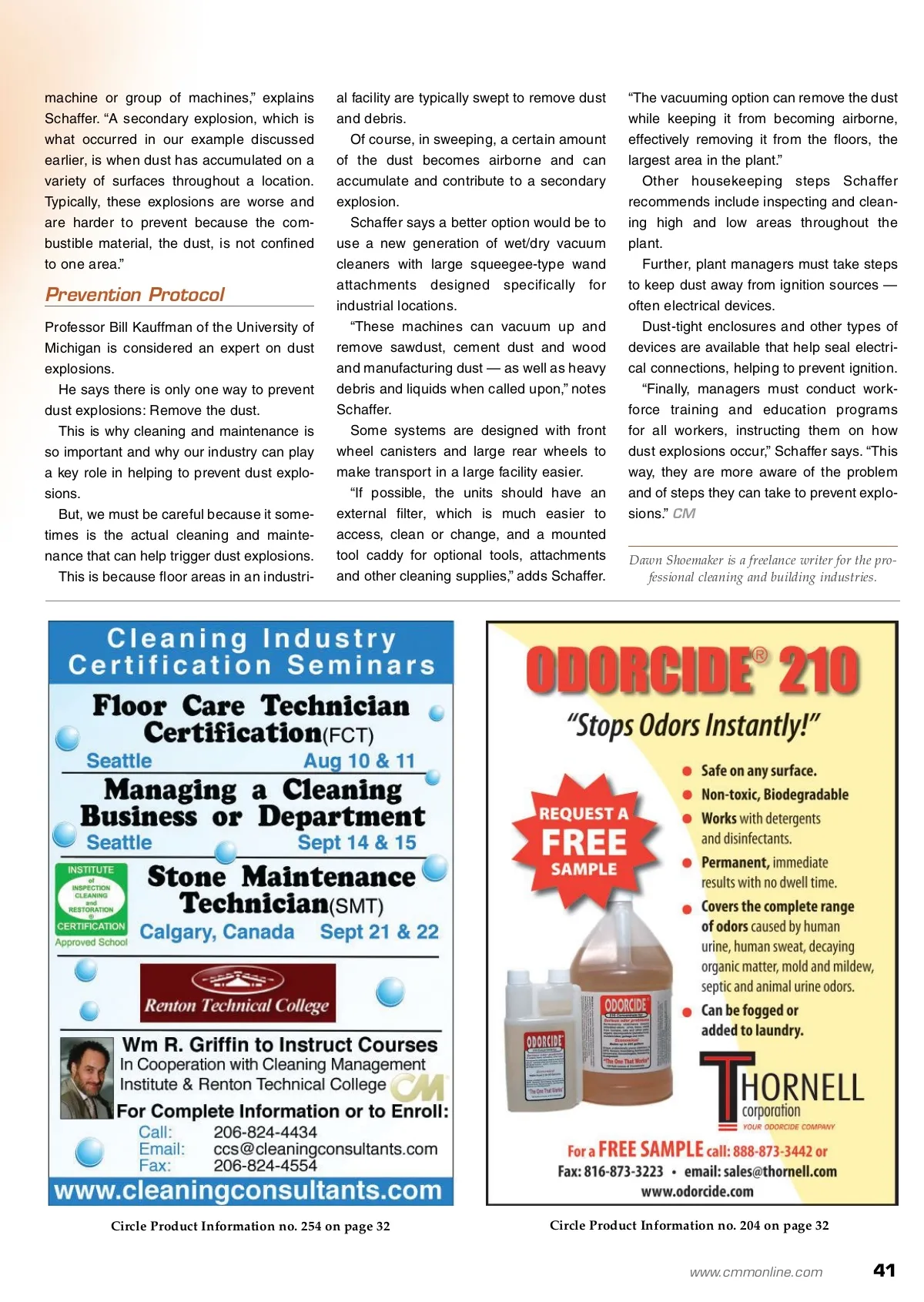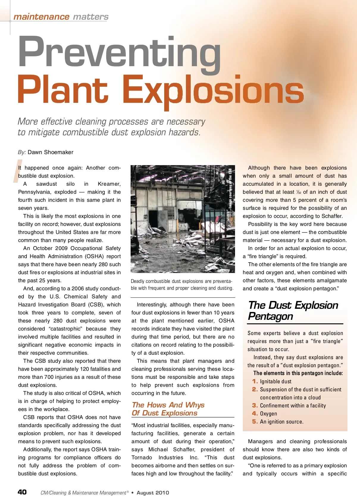 maintenance matters Plant Explosions More effective cleaning processes are necessary to mitigate combustible dust explosion hazards. By: Dawn Shoemaker Image courtesy of the CSB Preventing It happened once again: Another com-bustible dust explosion. A sawdust silo in Kreamer, Pennsylvania, exploded — making it the fourth such incident in this same plant in seven years. This is likely the most explosions in one facility on record; however, dust explosions throughout the United States are far more common than many people realize. An October 2009 Occupational Safety and Health Administration (OSHA) report says that there have been nearly 280 such dust fires or explosions at industrial sites in the past 25 years. And, according to a 2006 study conduct-ed by the U.S. Chemical Safety and Hazard Investigation Board (CSB), which took three years to complete, seven of these nearly 280 dust explosions were considered “catastrophic” because they involved multiple facilities and resulted in significant negative economic impacts in their respective communities. The CSB study also reported that there have been approximately 120 fatalities and more than 700 injuries as a result of these dust explosions. The study is also critical of OSHA, which is in charge of helping to protect employ-ees in the workplace. CSB reports that OSHA does not have standards specifically addressing the dust explosion problem, nor has it developed means to prevent such explosions. Additionally, the report says OSHA train-ing programs for compliance officers do not fully address the problem of com-bustible dust explosions. I Deadly combustible dust explosions are preventa-ble with frequent and proper cleaning and dusting. Although there have been explosions when only a small amount of dust has accumulated in a location, it is generally believed that at least 1 ⁄ 32 of an inch of dust covering more than 5 percent of a room’s surface is required for the possibility of an explosion to occur, according to Schaffer. Possibility is the key word here because dust is just one element — the combustible material — necessary for a dust explosion. In order for an actual explosion to occur, a “fire triangle” is required. The other elements of the fire triangle are heat and oxygen and, when combined with other factors, these elements amalgamate and create a “dust explosion pentagon.” Interestingly, although there have been four dust explosions in fewer than 10 years at the plant mentioned earlier, OSHA records indicate they have visited the plant during that time period, but there are no citations on record relating to the possibili-ty of a dust explosion. This means that plant managers and cleaning professionals serving these loca-tions must be responsible and take steps to help prevent such explosions from occurring in the future. The Dust Explosion Pentagon Some experts believe a dust explosion requires more than just a “fire triangle” situation to occur. Instead, they say dust explosions are the result of a “dust explosion pentagon.” T h e e l e m e n t s i n t h i s p e n t a g o n i n c l u d e : 1. Ignitable dust 2. Suspension of the dust in sufficient concentration into a cloud 3. Confinement within a facility 4. Oxygen 5. An ignition source. Managers and cleaning professionals should know there are also two kinds of dust explosions. “One is referred to as a primary explosion and typically occurs within a specific The Hows And Whys Of Dust Explosions “Most industrial facilities, especially manu-facturing facilities, generate a certain amount of dust during their operation,” says Michael Schaffer, president of Tornado Industries Inc. “This dust becomes airborne and then settles on sur-faces high and low throughout the facility.” 40 CM/Cleaning & Maintenance Management ® • August 2010