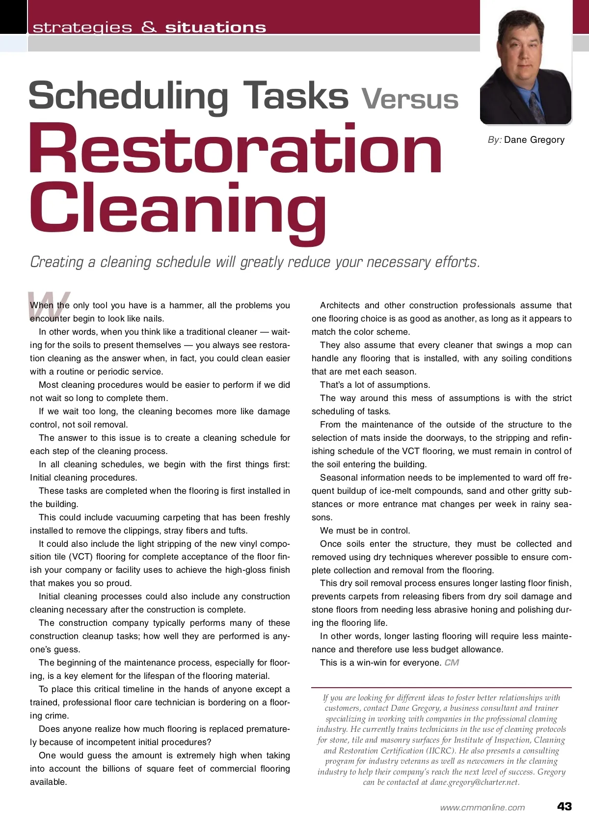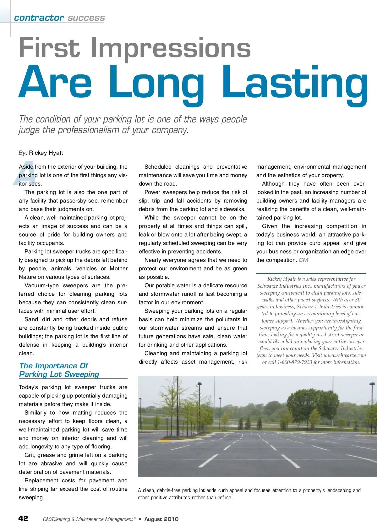 contractor success First Impressions Are Long Lasting The condition of your parking lot is one of the ways people judge the professionalism of your company. By: Rickey Hyatt A Aside from the exterior of your building, the parking lot is one of the first things any vis-itor sees. The parking lot is also the one part of any facility that passersby see, remember and base their judgments on. A clean, well-maintained parking lot proj-ects an image of success and can be a source of pride for building owners and facility occupants. Parking lot sweeper trucks are specifical-ly designed to pick up the debris left behind by people, animals, vehicles or Mother Nature on various types of surfaces. Vacuum-type sweepers are the pre-ferred choice for cleaning parking lots because they can consistently clean sur-faces with minimal user effort. Sand, dirt and other debris and refuse are constantly being tracked inside public buildings; the parking lot is the first line of defense in keeping a building’s interior clean. The Importance Of Parking Lot Sweeping Today’s parking lot sweeper trucks are capable of picking up potentially damaging materials before they make it inside. Similarly to how matting reduces the necessary effort to keep floors clean, a well-maintained parking lot will save time and money on interior cleaning and will add longevity to any type of flooring. Grit, grease and grime left on a parking lot are abrasive and will quickly cause deterioration of pavement materials. Replacement costs for pavement and line striping far exceed the cost of routine sweeping. Scheduled cleanings and preventative maintenance will save you time and money down the road. Power sweepers help reduce the risk of slip, trip and fall accidents by removing debris from the parking lot and sidewalks. While the sweeper cannot be on the property at all times and things can spill, leak or blow onto a lot after being swept, a regularly scheduled sweeping can be very effective in preventing accidents. Nearly everyone agrees that we need to protect our environment and be as green as possible. Our potable water is a delicate resource and stormwater runoff is fast becoming a factor in our environment. Sweeping your parking lots on a regular basis can help minimize the pollutants in our stormwater streams and ensure that future generations have safe, clean water for drinking and other applications. Cleaning and maintaining a parking lot directly affects asset management, risk management, environmental management and the esthetics of your property. Although they have often been over-looked in the past, an increasing number of building owners and facility managers are realizing the benefits of a clean, well-main-tained parking lot. Given the increasing competition in today’s business world, an attractive park-ing lot can provide curb appeal and give your business or organization an edge over the competition. CM Rickey Hyatt is a sales representative for Schwarze Industries Inc., manufacturers of power sweeping equipment to clean parking lots, side-walks and other paved surfaces. With over 30 years in business, Schwarze Industries is commit-ted to providing an extraordinary level of cus-tomer support. Whether you are investigating sweeping as a business opportunity for the first time, looking for a quality used street sweeper or would like a bid on replacing your entire sweeper fleet, you can count on the Schwarze Industries team to meet your needs. Visit www.schwarze.com or call 1-800-879-7933 for more information. A clean, debris-free parking lot adds curb appeal and focuses attention to a property's landscaping and other positive attributes rather than refuse. 42 CM/Cleaning & Maintenance Management ® • August 2010