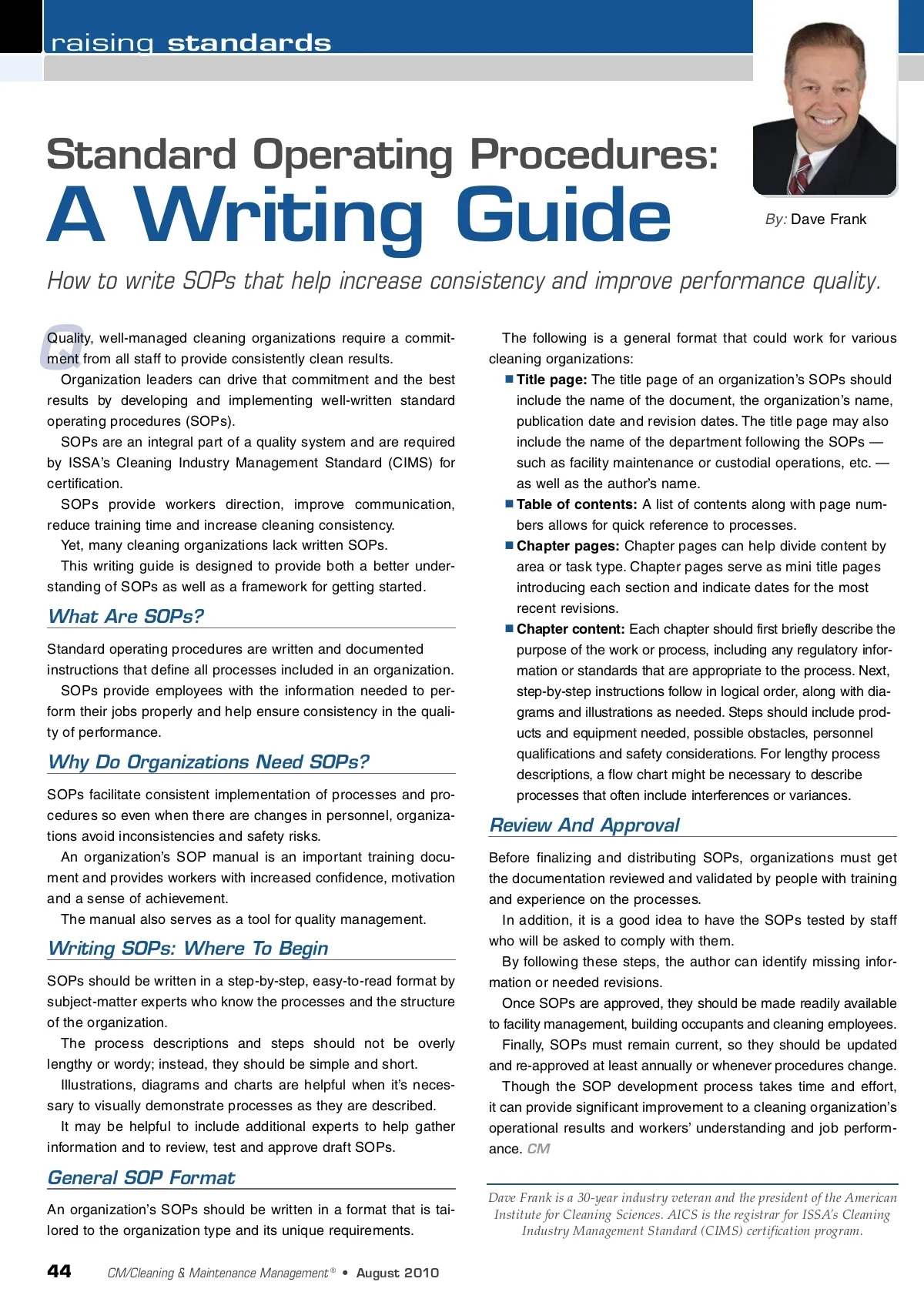 raising standards Standard Operating Procedures: A Writing Guide Q Quality, well-managed cleaning organizations require a commit-ment from all staff to provide consistently clean results. Organization leaders can drive that commitment and the best results by developing and implementing well-written standard operating procedures (SOPs). SOPs are an integral part of a quality system and are required by ISSA’s Cleaning Industry Management Standard (CIMS) for certification. SOPs provide workers direction, improve communication, reduce training time and increase cleaning consistency. Yet, many cleaning organizations lack written SOPs. This writing guide is designed to provide both a better under-standing of SOPs as well as a framework for getting started. By: Dave Frank How to write SOPs that help increase consistency and improve performance quality. The following is a general format that could work for various cleaning organizations: Title page: The title page of an organization’s SOPs should include the name of the document, the organization’s name, publication date and revision dates. The title page may also include the name of the department following the SOPs — such as facility maintenance or custodial operations, etc. — as well as the author’s name. Table of contents: A list of contents along with page num-bers allows for quick reference to processes. Chapter pages: Chapter pages can help divide content by area or task type. Chapter pages serve as mini title pages introducing each section and indicate dates for the most recent revisions. Chapter content: Each chapter should first briefly describe the purpose of the work or process, including any regulatory infor-mation or standards that are appropriate to the process. Next, step-by-step instructions follow in logical order, along with dia-grams and illustrations as needed. Steps should include prod-ucts and equipment needed, possible obstacles, personnel qualifications and safety considerations. For lengthy process descriptions, a flow chart might be necessary to describe processes that often include interferences or variances. What Are SOPs? Standard operating procedures are written and documented instructions that define all processes included in an organization. SOPs provide employees with the information needed to per-form their jobs properly and help ensure consistency in the quali-ty of performance. Why Do Organizations Need SOPs? SOPs facilitate consistent implementation of processes and pro-cedures so even when there are changes in personnel, organiza-tions avoid inconsistencies and safety risks. An organization’s SOP manual is an important training docu-ment and provides workers with increased confidence, motivation and a sense of achievement. The manual also serves as a tool for quality management. Review And Approval Before finalizing and distributing SOPs, organizations must get the documentation reviewed and validated by people with training and experience on the processes. In addition, it is a good idea to have the SOPs tested by staff who will be asked to comply with them. By following these steps, the author can identify missing infor-mation or needed revisions. Once SOPs are approved, they should be made readily available to facility management, building occupants and cleaning employees. Finally, SOPs must remain current, so they should be updated and re-approved at least annually or whenever procedures change. Though the SOP development process takes time and effort, it can provide significant improvement to a cleaning organization’s operational results and workers’ understanding and job perform-ance. CM Writing SOPs: Where To Begin SOPs should be written in a step-by-step, easy-to-read format by subject-matter experts who know the processes and the structure of the organization. The process descriptions and steps should not be overly lengthy or wordy; instead, they should be simple and short. Illustrations, diagrams and charts are helpful when it’s neces-sary to visually demonstrate processes as they are described. It may be helpful to include additional experts to help gather information and to review, test and approve draft SOPs. General SOP Format An organization’s SOPs should be written in a format that is tai-lored to the organization type and its unique requirements. Dave Frank is a 30-year industry veteran and the president of the American Institute for Cleaning Sciences. AICS is the registrar for ISSA’s Cleaning Industry Management Standard (CIMS) certification program. 44 CM/Cleaning & Maintenance Management ® • August 2010