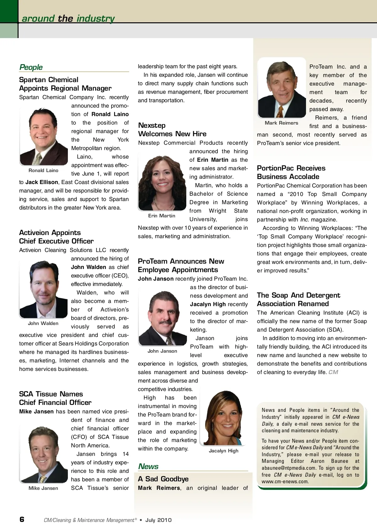 around the industry People Spartan Chemical Appoints Regional Manager Spartan Chemical Company Inc. recently announced the promo-tion of Ronald Laino to the position of regional manager for the New York Metropolitan region. Laino, whose appointment was effec-Ronald Laino tive June 1, will report to Jack Ellison , East Coast divisional sales manager, and will be responsible for provid-ing service, sales and support to Spartan distributors in the greater New York area. leadership team for the past eight years. In his expanded role, Jansen will continue to direct many supply chain functions such as revenue management, fiber procurement and transportation. Nexstep Welcomes New Hire Nexstep Commercial Products recently announced the hiring of Erin Martin as the new sales and market-ing administrator. Martin, who holds a Bachelor of Science Degree in Marketing from Wright State Erin Martin University, joins Nexstep with over 10 years of experience in sales, marketing and administration. ProTeam Inc. and a key member of the executive manage-ment team for decades, recently passed away. Reimers, a friend Mark Reimers first and a business-man second, most recently served as ProTeam’s senior vice president. PortionPac Receives Business Accolade PortionPac Chemical Corporation has been named a “2010 Top Small Company Workplace” by Winning Workplaces, a national non-profit organization, working in partnership with Inc. magazine. According to Winning Workplaces: “The ‘Top Small Company Workplace’ recogni-tion project highlights those small organiza-tions that engage their employees, create great work environments and, in turn, deliv-er improved results.” Activeion Appoints Chief Executive Officer Activeion Cleaning Solutions LLC recently announced the hiring of John Walden as chief executive officer (CEO), effective immediately. Walden, who will also become a mem-ber of Activeion’s board of directors, pre-John Walden viously served as executive vice president and chief cus-tomer officer at Sears Holdings Corporation where he managed its hardlines business-es, marketing, Internet channels and the home services businesses. ProTeam Announces New Employee Appointments John Janson recently joined ProTeam Inc. as the director of busi-ness development and Jacalyn High recently received a promotion to the director of mar-keting. Janson joins ProTeam with high-John Janson level executive experience in logistics, growth strategies, sales management and business develop-ment across diverse and competitive industries. High has been instrumental in moving the ProTeam brand for-ward in the market-place and expanding the role of marketing within the company. Jacalyn High The Soap And Detergent Association Renamed The American Cleaning Institute (ACI) is officially the new name of the former Soap and Detergent Association (SDA). In addition to moving into an environmen-tally friendly building, the ACI introduced its new name and launched a new website to demonstrate the benefits and contributions of cleaning to everyday life. CM SCA Tissue Names Chief Financial Officer Mike Jansen has been named vice presi-dent of finance and chief financial officer (CFO) of SCA Tissue North America. Jansen brings 14 years of industry expe-rience to this role and has been a member of Mike Jansen SCA Tissue’s senior News and People items in “Around the Industry” initially appeared in CM e-News Daily , a daily e-mail news service for the cleaning and maintenance industry. To have your News and/or People item con-sidered for CM e-News Daily and “Around the Industry,” please e-mail your release to Managing Editor Aaron Baunee at [email protected]. To sign up for the free CM e-News Daily e-mail, log on to www.cm-enews.com. News A Sad Goodbye Mark Reimers , an original leader of 6 CM/Cleaning & Maintenance Management ® • July 2010