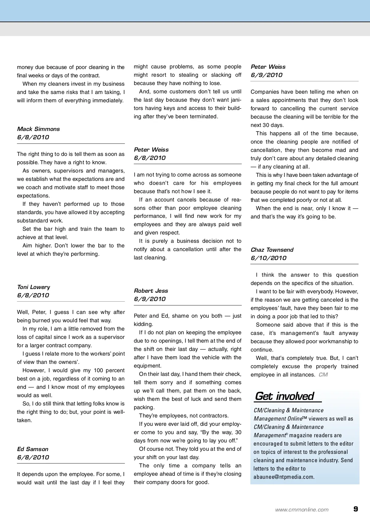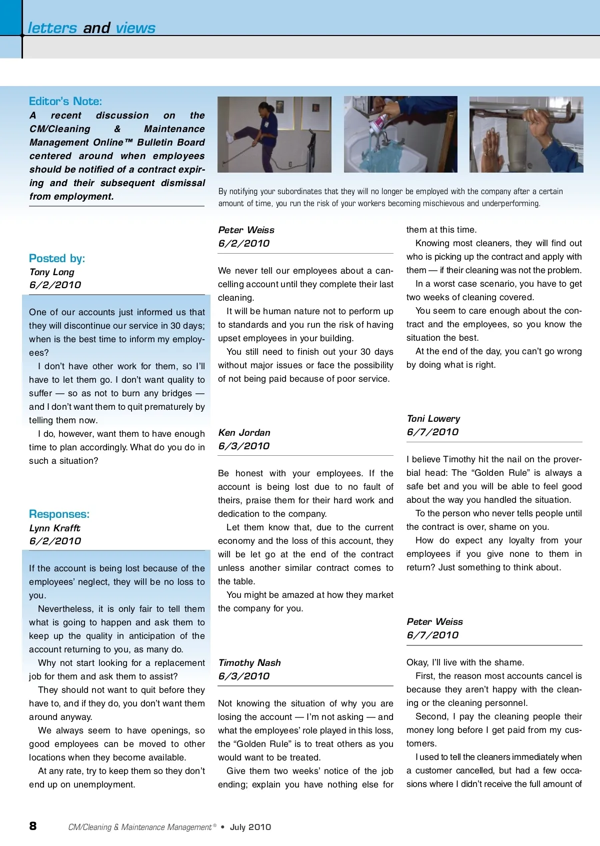 letters and views Editor’s Note: A recent discussion on the CM/Cleaning & Maintenance Management Online™ Bulletin Board centered around when employees should be notified of a contract expir-ing and their subsequent dismissal from employment. By notifying your subordinates that they will no longer be employed with the company after a certain amount of time, you run the risk of your workers becoming mischievous and underperforming. Peter Weiss 6/2/2010 Posted by: Tony Long 6/2/2010 One of our accounts just informed us that they will discontinue our service in 30 days; when is the best time to inform my employ-ees? I don’t have other work for them, so I’ll have to let them go. I don’t want quality to suffer — so as not to burn any bridges — and I don’t want them to quit prematurely by telling them now. I do, however, want them to have enough time to plan accordingly. What do you do in such a situation? We never tell our employees about a can-celling account until they complete their last cleaning. It will be human nature not to perform up to standards and you run the risk of having upset employees in your building. You still need to finish out your 30 days without major issues or face the possibility of not being paid because of poor service. them at this time. Knowing most cleaners, they will find out who is picking up the contract and apply with them — if their cleaning was not the problem. In a worst case scenario, you have to get two weeks of cleaning covered. You seem to care enough about the con-tract and the employees, so you know the situation the best. At the end of the day, you can’t go wrong by doing what is right. Ken Jordan 6/3/2010 Be honest with your employees. If the account is being lost due to no fault of theirs, praise them for their hard work and dedication to the company. Let them know that, due to the current economy and the loss of this account, they will be let go at the end of the contract unless another similar contract comes to the table. You might be amazed at how they market the company for you. Toni Lowery 6/7/2010 I believe Timothy hit the nail on the prover-bial head: The “Golden Rule” is always a safe bet and you will be able to feel good about the way you handled the situation. To the person who never tells people until the contract is over, shame on you. How do expect any loyalty from your employees if you give none to them in return? Just something to think about. Responses: Lynn Krafft 6/2/2010 If the account is being lost because of the employees’ neglect, they will be no loss to you. Nevertheless, it is only fair to tell them what is going to happen and ask them to keep up the quality in anticipation of the account returning to you, as many do. Why not start looking for a replacement job for them and ask them to assist? They should not want to quit before they have to, and if they do, you don’t want them around anyway. We always seem to have openings, so good employees can be moved to other locations when they become available. At any rate, try to keep them so they don’t end up on unemployment. Peter Weiss 6/7/2010 Timothy Nash 6/3/2010 Not knowing the situation of why you are losing the account — I’m not asking — and what the employees’ role played in this loss, the “Golden Rule” is to treat others as you would want to be treated. Give them two weeks’ notice of the job ending; explain you have nothing else for Okay, I’ll live with the shame. First, the reason most accounts cancel is because they aren’t happy with the clean-ing or the cleaning personnel. Second, I pay the cleaning people their money long before I get paid from my cus-tomers. I used to tell the cleaners immediately when a customer cancelled, but had a few occa-sions where I didn’t receive the full amount of 8 CM/Cleaning & Maintenance Management ® • July 2010