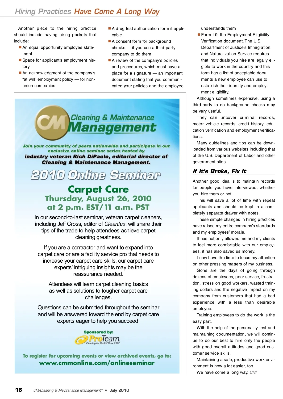 Hiring Practices Have Come A Long Way Another piece to the hiring practice should include having hiring packets that include: An equal opportunity employee state-ment Space for applicant’s employment his-tory An acknowledgment of the company’s “at will” employment policy — for non-union companies A drug test authorization form if appli-cable A consent form for background checks — if you use a third-party company to do them A review of the company’s policies and procedures, which must have a place for a signature — an important document stating that you communi-cated your policies and the employee understands them Form I-9, the Employment Eligibility Verification document. The U.S. Department of Justice’s Immigration and Naturalization Service requires that individuals you hire are legally eli-gible to work in the country and this form has a list of acceptable docu-ments a new employee can use to establish their identity and employ-ment eligibility. Although sometimes expensive, using a third-party to do background checks may be very useful. They can uncover criminal records, motor vehicle records, credit history, edu-cation verification and employment verifica-tions. Many guidelines and tips can be down-loaded from various websites including that of the U.S. Department of Labor and other government sites. If It’s Broke, Fix It Carpet Care Thursday, August 26, 2010 at 2 p.m. EST/1 1 a.m. PST In our second-to-last seminar, veteran carpet cleaners, including Jeff Cross, editor of Cleanfax , will share their tips of the trade to help attendees achieve carpet cleaning greatness. If you are a contractor and want to expand into carpet care or are a facility service pro that needs to increase your carpet care skills, our carpet care experts' intriguing insights may be the reassurance needed. Attendees will learn carpet cleaning basics as well as solutions to tougher carpet care challenges. Questions can be submitted throughout the seminar and will be answered toward the end by carpet care experts eager to help you succeed. T o r e g i s t e r f o r u p c o m i n g e v e n t s o r v i e w a r c h i v e d e v e n t s , g o t o : www.cmmonline.com/onlineseminar Another good idea is to maintain records for people you have interviewed, whether you hire them or not. This will save a lot of time with repeat applicants and should be kept in a com-pletely separate drawer with notes. These simple changes in hiring practices have raised my entire company’s standards and my employees’ morale. It has not only allowed me and my clients to feel more comfortable with our employ-ees, it has also saved us money. I now have the time to focus my attention on other pressing matters of my business. Gone are the days of going through dozens of employees, poor service, frustra-tion, stress on good workers, wasted train-ing dollars and the negative impact on my company from customers that had a bad experience with a less than desirable employee. Training employees to do the work is the easy part. With the help of the personality test and maintaining documentation, we will contin-ue to do our best to hire only the people with good overall attitudes and good cus-tomer service skills. Maintaining a safe, productive work envi-ronment is now a lot easier, too. We have come a long way. CM 16 CM/Cleaning & Maintenance Management ® • July 2010