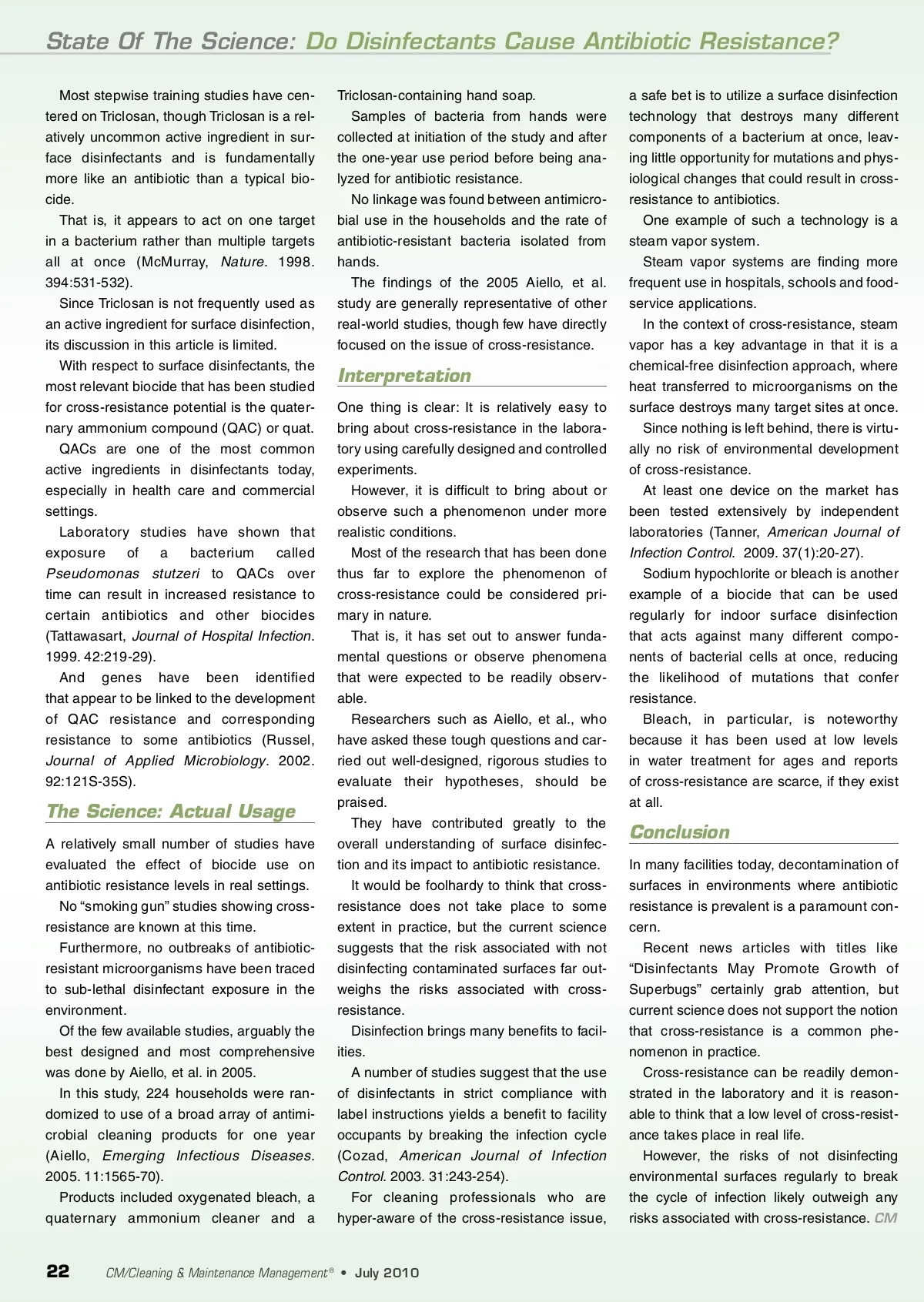 State Of The Science: Do Disinfectants Cause Antibiotic Resistance? Most stepwise training studies have cen-tered on Triclosan, though Triclosan is a rel-atively uncommon active ingredient in sur-face disinfectants and is fundamentally more like an antibiotic than a typical bio-cide. That is, it appears to act on one target in a bacterium rather than multiple targets all at once (McMurray, Nature . 1998. 394:531-532). Since Triclosan is not frequently used as an active ingredient for surface disinfection, its discussion in this article is limited. With respect to surface disinfectants, the most relevant biocide that has been studied for cross-resistance potential is the quater-nary ammonium compound (QAC) or quat. QACs are one of the most common active ingredients in disinfectants today, especially in health care and commercial settings. Laboratory studies have shown that exposure of a bacterium called Pseudomonas stutzeri to QACs over time can result in increased resistance to certain antibiotics and other biocides (Tattawasart, Journal of Hospital Infection . 1999. 42:219-29). And genes have been identified that appear to be linked to the development of QAC resistance and corresponding resistance to some antibiotics (Russel, Journal of Applied Microbiology . 2002. 92:121S-35S). Triclosan-containing hand soap. Samples of bacteria from hands were collected at initiation of the study and after the one-year use period before being ana-lyzed for antibiotic resistance. No linkage was found between antimicro-bial use in the households and the rate of antibiotic-resistant bacteria isolated from hands. The findings of the 2005 Aiello, et al. study are generally representative of other real-world studies, though few have directly focused on the issue of cross-resistance. a safe bet is to utilize a surface disinfection technology that destroys many different components of a bacterium at once, leav-ing little opportunity for mutations and phys-iological changes that could result in cross-resistance to antibiotics. One example of such a technology is a steam vapor system. Steam vapor systems are finding more frequent use in hospitals, schools and food-service applications. In the context of cross-resistance, steam vapor has a key advantage in that it is a chemical-free disinfection approach, where heat transferred to microorganisms on the surface destroys many target sites at once. Since nothing is left behind, there is virtu-ally no risk of environmental development of cross-resistance. At least one device on the market has been tested extensively by independent laboratories (Tanner, American Journal of Infection Control . 2009. 37(1):20-27). Sodium hypochlorite or bleach is another example of a biocide that can be used regularly for indoor surface disinfection that acts against many different compo-nents of bacterial cells at once, reducing the likelihood of mutations that confer resistance. Bleach, in particular, is noteworthy because it has been used at low levels in water treatment for ages and reports of cross-resistance are scarce, if they exist at all. Interpretation One thing is clear: It is relatively easy to bring about cross-resistance in the labora-tory using carefully designed and controlled experiments. However, it is difficult to bring about or observe such a phenomenon under more realistic conditions. Most of the research that has been done thus far to explore the phenomenon of cross-resistance could be considered pri-mary in nature. That is, it has set out to answer funda-mental questions or observe phenomena that were expected to be readily observ-able. Researchers such as Aiello, et al., who have asked these tough questions and car-ried out well-designed, rigorous studies to evaluate their hypotheses, should be praised. They have contributed greatly to the overall understanding of surface disinfec-tion and its impact to antibiotic resistance. It would be foolhardy to think that cross-resistance does not take place to some extent in practice, but the current science suggests that the risk associated with not disinfecting contaminated surfaces far out-weighs the risks associated with cross-resistance. Disinfection brings many benefits to facil-ities. A number of studies suggest that the use of disinfectants in strict compliance with label instructions yields a benefit to facility occupants by breaking the infection cycle (Cozad, American Journal of Infection Control . 2003. 31:243-254). For cleaning professionals who are hyper-aware of the cross-resistance issue, The Science: Actual Usage A relatively small number of studies have evaluated the effect of biocide use on antibiotic resistance levels in real settings. No “smoking gun” studies showing cross-resistance are known at this time. Furthermore, no outbreaks of antibiotic-resistant microorganisms have been traced to sub-lethal disinfectant exposure in the environment. Of the few available studies, arguably the best designed and most comprehensive was done by Aiello, et al. in 2005. In this study, 224 households were ran-domized to use of a broad array of antimi-crobial cleaning products for one year (Aiello, Emerging Infectious Diseases . 2005. 11:1565-70). Products included oxygenated bleach, a quaternary ammonium cleaner and a Conclusion In many facilities today, decontamination of surfaces in environments where antibiotic resistance is prevalent is a paramount con-cern. Recent news articles with titles like “Disinfectants May Promote Growth of Superbugs” certainly grab attention, but current science does not support the notion that cross-resistance is a common phe-nomenon in practice. Cross-resistance can be readily demon-strated in the laboratory and it is reason-able to think that a low level of cross-resist-ance takes place in real life. However, the risks of not disinfecting environmental surfaces regularly to break the cycle of infection likely outweigh any risks associated with cross-resistance. CM 22 CM/Clean