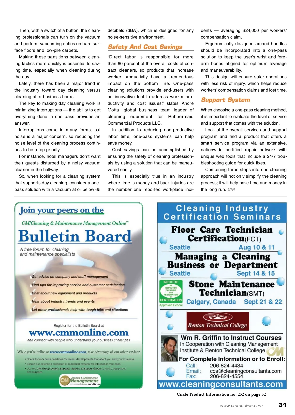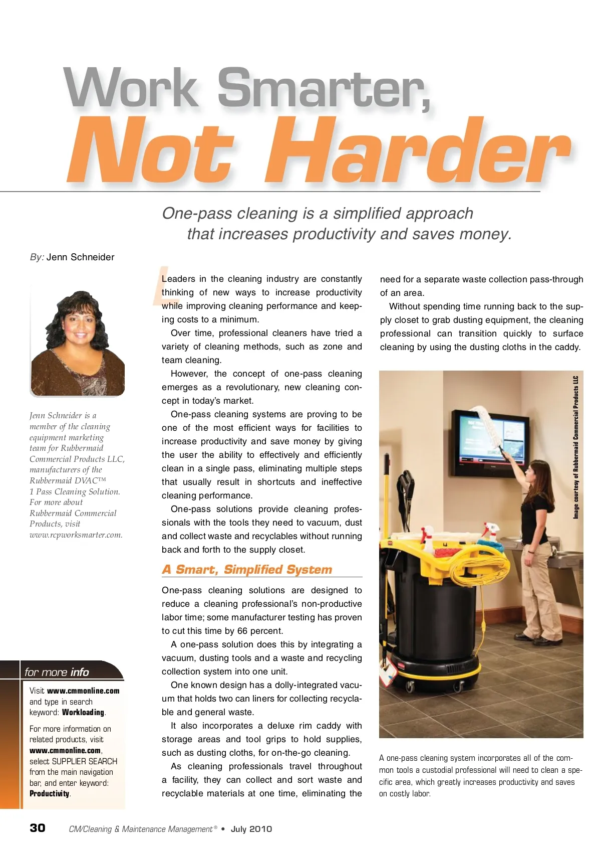 Not Harder One-pass cleaning is a simplified approach that increases productivity and saves money. By: Jenn Schneider Work Smarter, L Jenn Schneider is a member of the cleaning equipment marketing team for Rubbermaid Commercial Products LLC, manufacturers of the Rubbermaid DV AC™ 1 Pass Cleaning Solution. For more about Rubbermaid Commercial Products, visit www.rcpworksmarter.com. Leaders in the cleaning industry are constantly thinking of new ways to increase productivity while improving cleaning performance and keep-ing costs to a minimum. Over time, professional cleaners have tried a variety of cleaning methods, such as zone and team cleaning. However, the concept of one-pass cleaning emerges as a revolutionary, new cleaning con-cept in today’s market. One-pass cleaning systems are proving to be one of the most efficient ways for facilities to increase productivity and save money by giving the user the ability to effectively and efficiently clean in a single pass, eliminating multiple steps that usually result in shortcuts and ineffective cleaning performance. One-pass solutions provide cleaning profes-sionals with the tools they need to vacuum, dust and collect waste and recyclables without running back and forth to the supply closet. need for a separate waste collection pass-through of an area. Without spending time running back to the sup-ply closet to grab dusting equipment, the cleaning professional can transition quickly to surface cleaning by using the dusting cloths in the caddy. A Smart, Simplified System One-pass cleaning solutions are designed to reduce a cleaning professional’s non-productive labor time; some manufacturer testing has proven to cut this time by 66 percent. A one-pass solution does this by integrating a vacuum, dusting tools and a waste and recycling collection system into one unit. One known design has a dolly-integrated vacu-um that holds two can liners for collecting recycla-ble and general waste. It also incorporates a deluxe rim caddy with storage areas and tool grips to hold supplies, such as dusting cloths, for on-the-go cleaning. As cleaning professionals travel throughout a facility, they can collect and sort waste and recyclable materials at one time, eliminating the for more info Visit www.cmmonline.com and type in search keyword: Workloading . For more information on related products, visit www.cmmonline.com , select SUPPLIER SEARCH from the main navigation bar, and enter keyword: Productivity . A one-pass cleaning system incorporates all of the com-mon tools a custodial professional will need to clean a spe-cific area, which greatly increases productivity and saves on costly labor. 30 CM/Cleaning & Maintenance Management ® • July 2010 Image courtesy of Rubbermaid Commercial Products LLC