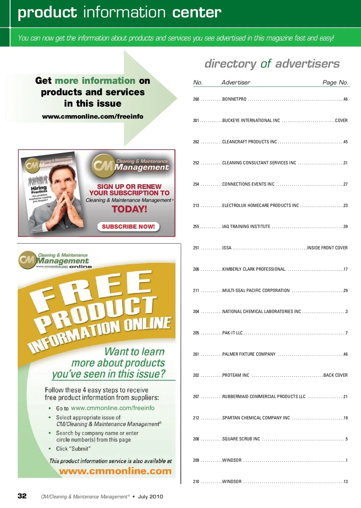 product information center You can now get the information about products and services you see advertised in this magazine fast and easy! directory of advertisers Get more information on products and services in this issue www.cmmonline.com/freeinfo No. Advertiser Page No. 260 . . . . . . . . . . .BONNETPRO . . . . . . . . . . . . . . . . . . . . . . . . . . . . . . . . . . . . . . . . . . . . . . . .46 201 . . . . . . . . . . . .BUCKEYE INTERNATIONAL INC . . . . . . . . . . . . . . . . . . . . . . . . . . . .COVER 262 . . . . . . . . . . .CLEANCRAFT PRODUCTS INC . . . . . . . . . . . . . . . . . . . . . . . . . . . . . . . . .45 July 2010 252 . . . . . . . . . . .CLEANING CONSULTANT SERVICES INC . . . . . . . . . . . . . . . . . . . . . . .31 SIGN UP OR RENEW YOUR SUBSCRIPTION TO Cleaning & Maintenance Management ® 254 . . . . . . . . . . .CONNECTIONS EVENTS INC . . . . . . . . . . . . . . . . . . . . . . . . . . . . . . . . . .27 TODAY! V G GRAND EDIA VIEW M GROUP 213 . . . . . . . . . . .ELECTROLUX HOMECARE PRODUCTS INC . . . . . . . . . . . . . . . . . . . . . .23 SUBSCRIBE NOW! 255 . . . . . . . . . . . .IAQ TRAINING INSTITUTE . . . . . . . . . . . . . . . . . . . . . . . . . . . . . . . . . . . .39 online.com www.cmm 251 . . . . . . . . . . .ISSA . . . . . . . . . . . . . . . . . . . . . . . . . . . . . . . . . . . . .INSIDE FRONT COVER 206 . . . . . . . . . . .KIMBERLY CLARK PROFESSIONAL. . . . . . . . . . . . . . . . . . . . . . . . . . . . .17 211 . . . . . . . . . . .MULTI-SEAL PACIFIC CORPORATION . . . . . . . . . . . . . . . . . . . . . . . . . .29 204 . . . . . . . . . . .NATIONAL CHEMICAL LABORATORIES INC . . . . . . . . . . . . . . . . . . . . . .3 205 . . . . . . . . . . .PAK-IT LLC . . . . . . . . . . . . . . . . . . . . . . . . . . . . . . . . . . . . . . . . . . . . . . . . . . .7 261 . . . . . . . . . . .PALMER FIXTURE COMPANY . . . . . . . . . . . . . . . . . . . . . . . . . . . . . . . . .46 202 . . . . . . . . . . .PROTEAM INC . . . . . . . . . . . . . . . . . . . . . . . . . . . . . . . . . . . .BACK COVER 207 . . . . . . . . . . .RUBBERMAID COMMERCIAL PRODUCTS LLC . . . . . . . . . . . . . . . . . .21 www.cmmonline.com/freeinfo 212 . . . . . . . . . . .SPARTAN CHEMICAL COMPANY INC . . . . . . . . . . . . . . . . . . . . . . . . . .19 208 . . . . . . . . . . .SQUARE SCRUB INC . . . . . . . . . . . . . . . . . . . . . . . . . . . . . . . . . . . . . . . . . .5 209 . . . . . . . . . . .WINDSOR . . . . . . . . . . . . . . . . . . . . . . . . . . . . . . . . . . . . . . . . . . . . . . . . . . .1 210 . . . . . . . . . . .WINDSOR . . . . . . . . . . . . . . . . . . . . . . . . . . . . . . . . . . . . . . . . . . . . . . . . . .13 32 CM/Cleaning & Maintenance Management ® • July 2010