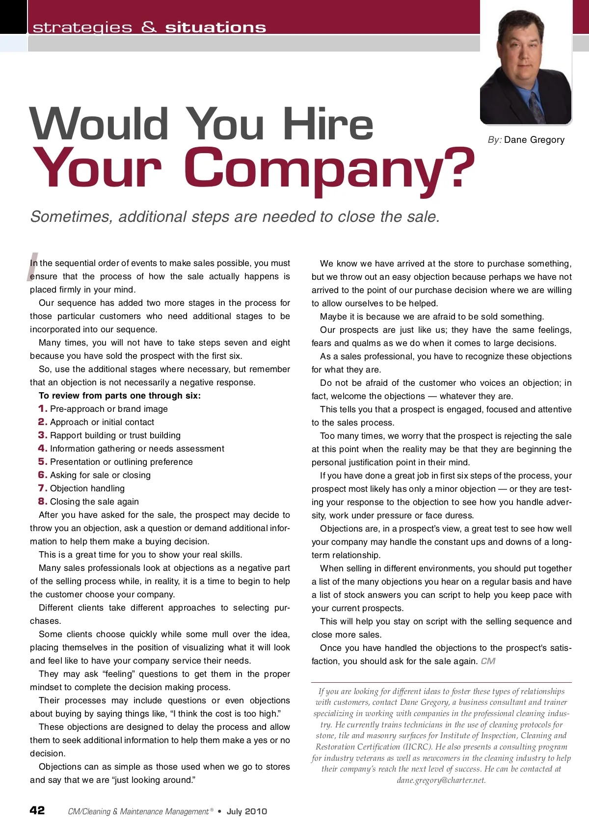 strategies & situations Would You Hire I By: Dane Gregory Your Company? We know we have arrived at the store to purchase something, but we throw out an easy objection because perhaps we have not arrived to the point of our purchase decision where we are willing to allow ourselves to be helped. Maybe it is because we are afraid to be sold something. Our prospects are just like us; they have the same feelings, fears and qualms as we do when it comes to large decisions. As a sales professional, you have to recognize these objections for what they are. Do not be afraid of the customer who voices an objection; in fact, welcome the objections — whatever they are. This tells you that a prospect is engaged, focused and attentive to the sales process. Too many times, we worry that the prospect is rejecting the sale at this point when the reality may be that they are beginning the personal justification point in their mind. If you have done a great job in first six steps of the process, your prospect most likely has only a minor objection — or they are test-ing your response to the objection to see how you handle adver-sity, work under pressure or face duress. Objections are, in a prospect’s view, a great test to see how well your company may handle the constant ups and downs of a long-term relationship. When selling in different environments, you should put together a list of the many objections you hear on a regular basis and have a list of stock answers you can script to help you keep pace with your current prospects. This will help you stay on script with the selling sequence and close more sales. Once you have handled the objections to the prospect's satis-faction, you should ask for the sale again. CM If you are looking for different ideas to foster these types of relationships with customers, contact Dane Gregory, a business consultant and trainer specializing in working with companies in the professional cleaning indus-try. He currently trains technicians in the use of cleaning protocols for stone, tile and masonry surfaces for Institute of Inspection, Cleaning and Restoration Certification (IICRC). He also presents a consulting program for industry veterans as well as newcomers in the cleaning industry to help their company’s reach the next level of success. He can be contacted at [email protected]. Sometimes, additional steps are needed to close the sale. In the sequential order of events to make sales possible, you must ensure that the process of how the sale actually happens is placed firmly in your mind. Our sequence has added two more stages in the process for those particular customers who need additional stages to be incorporated into our sequence. Many times, you will not have to take steps seven and eight because you have sold the prospect with the first six. So, use the additional stages where necessary, but remember that an objection is not necessarily a negative response. To review from parts one through six: 1. Pre-approach or brand image 2. Approach or initial contact 3. Rapport building or trust building 4. Information gathering or needs assessment 5. Presentation or outlining preference 6. Asking for sale or closing 7. Objection handling 8. Closing the sale again After you have asked for the sale, the prospect may decide to throw you an objection, ask a question or demand additional infor-mation to help them make a buying decision. This is a great time for you to show your real skills. Many sales professionals look at objections as a negative part of the selling process while, in reality, it is a time to begin to help the customer choose your company. Different clients take different approaches to selecting pur-chases. Some clients choose quickly while some mull over the idea, placing themselves in the position of visualizing what it will look and feel like to have your company service their needs. They may ask “feeling” questions to get them in the proper mindset to complete the decision making process. Their processes may include questions or even objections about buying by saying things like, “I think the cost is too high.” These objections are designed to delay the process and allow them to seek additional information to help them make a yes or no decision. Objections can as simple as those used when we go to stores and say that we are “just looking around.” 42 CM/Cleaning & Maintenance Management ® • July 2010