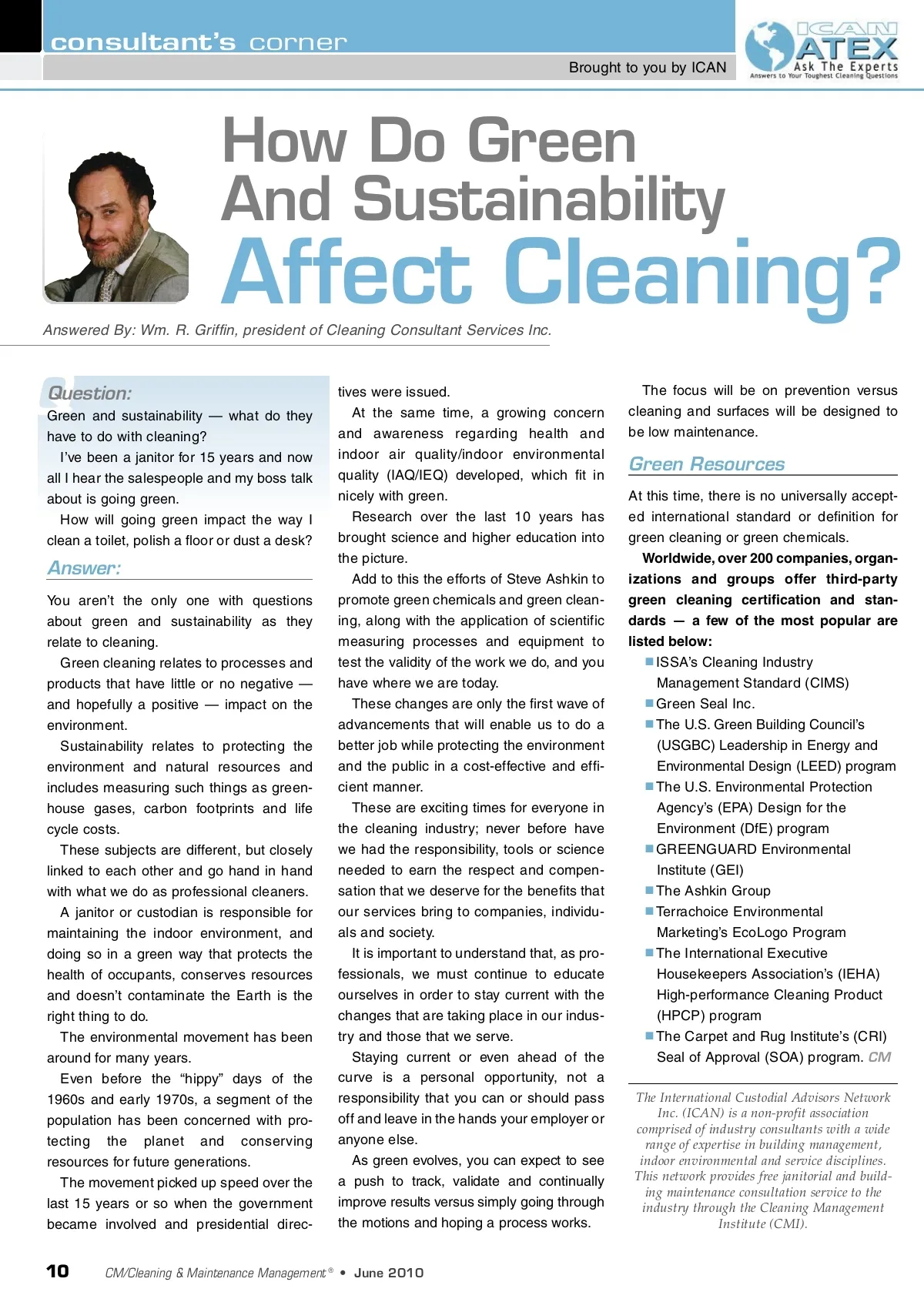 consultant’s corner Brought to you by ICAN How Do Green And Sustainability Affect Cleaning? Answered By: Wm. R. Griffin, president of Cleaning Consultant Services Inc. Q Question: Green and sustainability — what do they have to do with cleaning? I’ve been a janitor for 15 years and now all I hear the salespeople and my boss talk about is going green. How will going green impact the way I clean a toilet, polish a floor or dust a desk? Answer: You aren’t the only one with questions about green and sustainability as they relate to cleaning. Green cleaning relates to processes and products that have little or no negative — and hopefully a positive — impact on the environment. Sustainability relates to protecting the environment and natural resources and includes measuring such things as green-house gases, carbon footprints and life cycle costs. These subjects are different, but closely linked to each other and go hand in hand with what we do as professional cleaners. A janitor or custodian is responsible for maintaining the indoor environment, and doing so in a green way that protects the health of occupants, conserves resources and doesn’t contaminate the Earth is the right thing to do. The environmental movement has been around for many years. Even before the “hippy” days of the 1960s and early 1970s, a segment of the population has been concerned with pro-tecting the planet and conserving resources for future generations. The movement picked up speed over the last 15 years or so when the government became involved and presidential direc-tives were issued. At the same time, a growing concern and awareness regarding health and indoor air quality/indoor environmental quality (IAQ/IEQ) developed, which fit in nicely with green. Research over the last 10 years has brought science and higher education into the picture. Add to this the efforts of Steve Ashkin to promote green chemicals and green clean-ing, along with the application of scientific measuring processes and equipment to test the validity of the work we do, and you have where we are today. These changes are only the first wave of advancements that will enable us to do a better job while protecting the environment and the public in a cost-effective and effi-cient manner. These are exciting times for everyone in the cleaning industry; never before have we had the responsibility, tools or science needed to earn the respect and compen-sation that we deserve for the benefits that our services bring to companies, individu-als and society. It is important to understand that, as pro-fessionals, we must continue to educate ourselves in order to stay current with the changes that are taking place in our indus-try and those that we serve. Staying current or even ahead of the curve is a personal opportunity, not a responsibility that you can or should pass off and leave in the hands your employer or anyone else. As green evolves, you can expect to see a push to track, validate and continually improve results versus simply going through the motions and hoping a process works. The focus will be on prevention versus cleaning and surfaces will be designed to be low maintenance. Green Resources At this time, there is no universally accept-ed international standard or definition for green cleaning or green chemicals. Worldwide, over 200 companies, organ-izations and groups offer third-party green cleaning certification and stan-dards — a few of the most popular are listed below: ISSA’s Cleaning Industry Management Standard (CIMS) Green Seal Inc. The U.S. Green Building Council’s (USGBC) Leadership in Energy and Environmental Design (LEED) program The U.S. Environmental Protection Agency’s (EPA) Design for the Environment (DfE) program GREENGUARD Environmental Institute (GEI) The Ashkin Group Terrachoice Environmental Marketing’s EcoLogo Program The International Executive Housekeepers Association’s (IEHA) High-performance Cleaning Product (HPCP) program The Carpet and Rug Institute’s (CRI) Seal of Approval (SOA) program. CM The International Custodial Advisors Network Inc. (ICAN) is a non-profit association comprised of industry consultants with a wide range of expertise in building management, indoor environmental and service disciplines. This network provides free janitorial and build-ing maintenance consultation service to the industry through the Cleaning Management Institute (CMI). 10 CM/Cleaning & Maintenance Management ® • June 2010