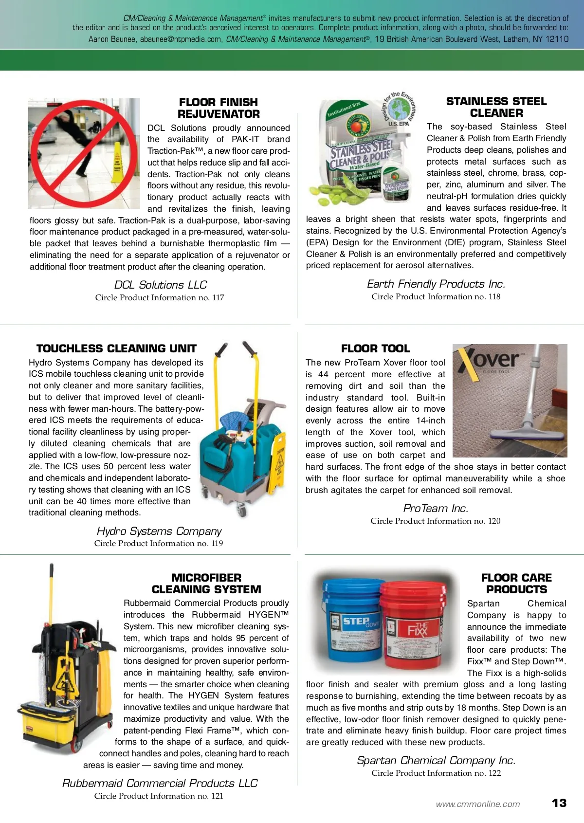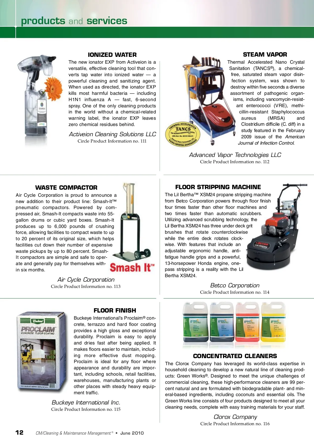 products and services IONIZED WATER The new ionator EXP from Activeion is a versatile, effective cleaning tool that con-verts tap water into ionized water — a powerful cleaning and sanitizing agent. When used as directed, the ionator EXP kills most harmful bacteria — including H1N1 influenza A — fast, 6-second spray. One of the only cleaning products in the world without a chemical-related warning label, the ionator EXP leaves zero chemical residues behind. STEAM VAPOR Thermal Accelerated Nano Crystal Sanitation (TANCS ® ), a chemical-free, saturated steam vapor disin-fection system, was shown to destroy within five seconds a diverse assortment of pathogenic organ-isms, including vancomycin-resist-ant enterococci (VRE), methi-cillin-resistant Staphylococcus aureus (MRSA) and Clostridium difficile (C. diff) in a study featured in the February 2009 issue of the American Journal of Infection Control . Activeion Cleaning Solutions LLC Circle Product Information no. 111 Advanced Vapor Technologies LLC Circle Product Information no. 112 WASTE COMPACTOR Air Cycle Corporation is proud to announce a new addition to their product line: Smash-It™ pneumatic compactors. Powered by com-pressed air, Smash-It compacts waste into 55-gallon drums or cubic yard boxes. Smash-It produces up to 6,000 pounds of crushing force, allowing facilities to compact waste to up to 20 percent of its original size, which helps facilities cut down their number of expensive waste pickups by up to 80 percent. Smash-It compactors are simple and safe to oper-ate and generally pay for themselves with-in six months. FLOOR STRIPPING MACHINE The Lil Bertha™ XSM24 propane stripping machine from Betco Corporation powers through floor finish four times faster than other floor machines and two times faster than automatic scrubbers. Utilizing advanced scrubbing technology, the Lil Bertha XSM24 has three under deck grit brushes that rotate counterclockwise while the entire deck rotates clock-wise. With features that include an adjustable ergonomic handle, anti-fatigue handle grips and a powerful, 13-horsepower Honda engine, one-pass stripping is a reality with the Lil Bertha XSM24. Air Cycle Corporation Circle Product Information no. 113 Betco Corporation Circle Product Information no. 114 FLOOR FINISH Buckeye International’s Proclaim ® con-crete, terrazzo and hard floor coating provides a high gloss and exceptional durability. Proclaim is easy to apply and dries fast after being applied. It makes floors easier to maintain, includ-ing more effective dust mopping. Proclaim is ideal for any floor where appearance and durability are impor-tant, including schools, retail facilities, warehouses, manufacturing plants or other places with steady heavy equip-ment traffic. CONCENTRATED CLEANERS The Clorox Company has leveraged its world-class expertise in household cleaning to develop a new natural line of cleaning prod-ucts: Green Works ® . Designed to meet the unique challenges of commercial cleaning, these high-performance cleaners are 99 per-cent natural and are formulated with biodegradable plant-and min-eral-based ingredients, including coconuts and essential oils. The Green Works line consists of four products designed to meet all your cleaning needs, complete with easy training materials for your staff. Buckeye International Inc. Circle Product Information no. 115 Clorox Company Circle Product Information no. 116 12 CM/Cleaning & Maintenance Management ® • June 2010