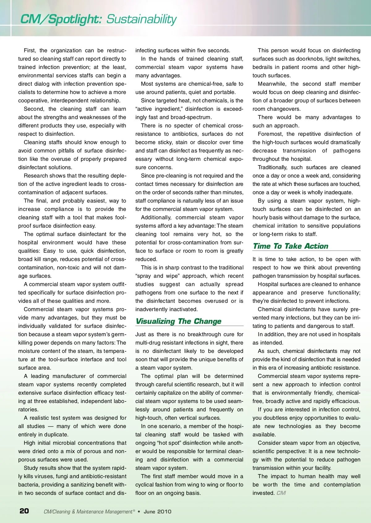 CM/Spotlight: Sustainability First, the organization can be restruc-tured so cleaning staff can report directly to trained infection prevention; at the least, environmental services staffs can begin a direct dialog with infection prevention spe-cialists to determine how to achieve a more cooperative, interdependent relationship. Second, the cleaning staff can learn about the strengths and weaknesses of the different products they use, especially with respect to disinfection. Cleaning staffs should know enough to avoid common pitfalls of surface disinfec-tion like the overuse of properly prepared disinfectant solutions. Research shows that the resulting deple-tion of the active ingredient leads to cross-contamination of adjacent surfaces. The final, and probably easiest, way to increase compliance is to provide the cleaning staff with a tool that makes fool-proof surface disinfection easy. The optimal surface disinfectant for the hospital environment would have these qualities: Easy to use, quick disinfection, broad kill range, reduces potential of cross-contamination, non-toxic and will not dam-age surfaces. A commercial steam vapor system outfit-ted specifically for surface disinfection pro-vides all of these qualities and more. Commercial steam vapor systems pro-vide many advantages, but they must be individually validated for surface disinfec-tion because a steam vapor system’s germ-killing power depends on many factors: The moisture content of the steam, its tempera-ture at the tool-surface interface and tool surface area. A leading manufacturer of commercial steam vapor systems recently completed extensive surface disinfection efficacy test-ing at three established, independent labo-ratories. A realistic test system was designed for all studies — many of which were done entirely in duplicate. High initial microbial concentrations that were dried onto a mix of porous and non-porous surfaces were used. Study results show that the system rapid-ly kills viruses, fungi and antibiotic-resistant bacteria, providing a sanitizing benefit with-in two seconds of surface contact and dis-infecting surfaces within five seconds. In the hands of trained cleaning staff, commercial steam vapor systems have many advantages. Most systems are chemical-free, safe to use around patients, quiet and portable. Since targeted heat, not chemicals, is the “active ingredient,” disinfection is exceed-ingly fast and broad-spectrum. There is no specter of chemical cross-resistance to antibiotics, surfaces do not become sticky, stain or discolor over time and staff can disinfect as frequently as nec-essary without long-term chemical expo-sure concerns. Since pre-cleaning is not required and the contact times necessary for disinfection are on the order of seconds rather than minutes, staff compliance is naturally less of an issue for the commercial steam vapor system. Additionally, commercial steam vapor systems afford a key advantage: The steam cleaning tool remains very hot, so the potential for cross-contamination from sur-face to surface or room to room is greatly reduced. This is in sharp contrast to the traditional “spray and wipe” approach, which recent studies suggest can actually spread pathogens from one surface to the next if the disinfectant becomes overused or is inadvertently inactivated. This person would focus on disinfecting surfaces such as doorknobs, light switches, bedrails in patient rooms and other high-touch surfaces. Meanwhile, the second staff member would focus on deep cleaning and disinfec-tion of a broader group of surfaces between room changeovers. There would be many advantages to such an approach. Foremost, the repetitive disinfection of the high-touch surfaces would dramatically decrease transmission of pathogens throughout the hospital. Traditionally, such surfaces are cleaned once a day or once a week and, considering the rate at which these surfaces are touched, once a day or week is wholly inadequate. By using a steam vapor system, high-touch surfaces can be disinfected on an hourly basis without damage to the surface, chemical irritation to sensitive populations or long-term risks to staff. Time To Take Action It is time to take action, to be open with respect to how we think about preventing pathogen transmission by hospital surfaces. Hospital surfaces are cleaned to enhance appearance and preserve functionality; they’re disinfected to prevent infections. Chemical disinfectants have surely pre-vented many infections, but they can be irri-tating to patients and dangerous to staff. In addition, they are not used in hospitals as intended. As such, chemical disinfectants may not provide the kind of disinfection that is needed in this era of increasing antibiotic resistance. Commercial steam vapor systems repre-sent a new approach to infection control that is environmentally friendly, chemical-free, broadly active and rapidly efficacious. If you are interested in infection control, you doubtless enjoy opportunities to evalu-ate new technologies as they become available. Consider steam vapor from an objective, scientific perspective: It is a new technolo-gy with the potential to reduce pathogen transmission within your facility. The impact to human health may well be worth the time and contemplation invested. CM Visualizing The Change Just as there is no breakthrough cure for multi-drug resistant infections in sight, there is no disinfectant likely to be developed soon that will provide the unique benefits of a steam vapor system. The optimal plan will be determined through careful scientific research, but it will certainly capitalize on the ability of commer-cial steam vapor systems to be used seam-lessly around patients and frequently on high-touch, often vertical surfaces. In one scenario, a member of the hospi-tal cleaning staff would be tasked with ongoing “hot spot” disinfection while anoth-er would be responsible for terminal clean-ing and disinfection with a c