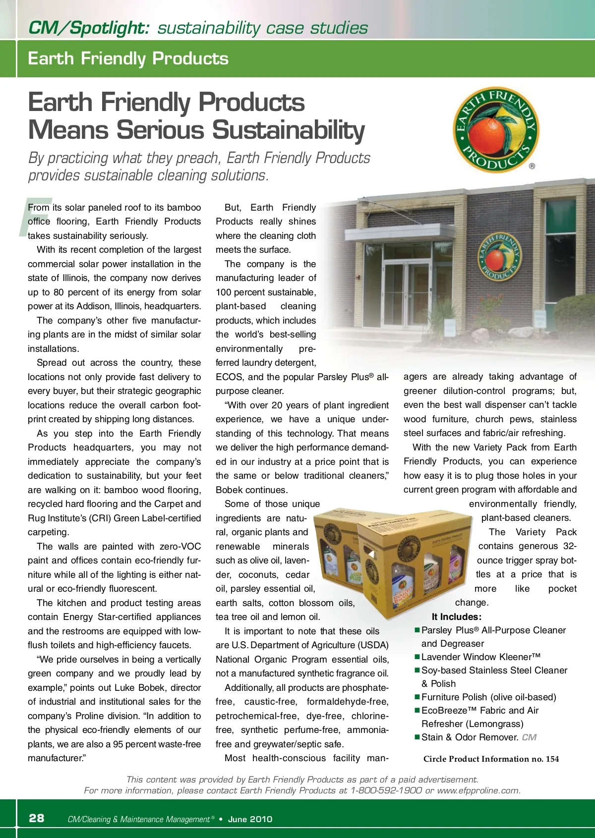 CM/Spotlight: sustainability case studies Earth Friendly Products Earth Friendly Products Means Serious Sustainability By practicing what they preach, Earth Friendly Products provides sustainable cleaning solutions. F From its solar paneled roof to its bamboo office flooring, Earth Friendly Products takes sustainability seriously. With its recent completion of the largest commercial solar power installation in the state of Illinois, the company now derives up to 80 percent of its energy from solar power at its Addison, Illinois, headquarters. The company’s other five manufactur-ing plants are in the midst of similar solar installations. Spread out across the country, these locations not only provide fast delivery to every buyer, but their strategic geographic locations reduce the overall carbon foot-print created by shipping long distances. As you step into the Earth Friendly Products headquarters, you may not immediately appreciate the company’s dedication to sustainability, but your feet are walking on it: bamboo wood flooring, recycled hard flooring and the Carpet and Rug Institute’s (CRI) Green Label-certified carpeting. The walls are painted with zero-VOC paint and offices contain eco-friendly fur-niture while all of the lighting is either nat-ural or eco-friendly fluorescent. The kitchen and product testing areas contain Energy Star-certified appliances and the restrooms are equipped with low-flush toilets and high-efficiency faucets. “We pride ourselves in being a vertically green company and we proudly lead by example,” points out Luke Bobek, director of industrial and institutional sales for the company’s Proline division. “In addition to the physical eco-friendly elements of our plants, we are also a 95 percent waste-free manufacturer.” But, Earth Friendly Products really shines where the cleaning cloth meets the surface. The company is the manufacturing leader of 100 percent sustainable, plant-based cleaning products, which includes the world’s best-selling environmentally pre-ferred laundry detergent, ECOS, and the popular Parsley Plus ® all-purpose cleaner. “With over 20 years of plant ingredient experience, we have a unique under-standing of this technology. That means we deliver the high performance demand-ed in our industry at a price point that is the same or below traditional cleaners,” Bobek continues. Some of those unique ingredients are natu-ral, organic plants and renewable minerals such as olive oil, laven-der, coconuts, cedar oil, parsley essential oil, earth salts, cotton blossom oils, tea tree oil and lemon oil. It is important to note that these oils are U.S. Department of Agriculture (USDA) National Organic Program essential oils, not a manufactured synthetic fragrance oil. Additionally, all products are phosphate-free, caustic-free, formaldehyde-free, petrochemical-free, dye-free, chlorine-free, synthetic perfume-free, ammonia-free and greywater/septic safe. Most health-conscious facility man-agers are already taking advantage of greener dilution-control programs; but, even the best wall dispenser can’t tackle wood furniture, church pews, stainless steel surfaces and fabric/air refreshing. With the new Variety Pack from Earth Friendly Products, you can experience how easy it is to plug those holes in your current green program with affordable and environmentally friendly, plant-based cleaners. The Variety Pack contains generous 32-ounce trigger spray bot-tles at a price that is more like pocket change. It Includes: Parsley Plus ® All-Purpose Cleaner and Degreaser Lavender Window Kleener™ Soy-based Stainless Steel Cleaner & Polish Furniture Polish (olive oil-based) EcoBreeze™ Fabric and Air Refresher (Lemongrass) Stain & Odor Remover. CM Circle Product Information no. 154 This content was provided by Earth Friendly Products as part of a paid advertisement. For more information, please contact Earth Friendly Products at 1-800-592-1900 or www.efpproline.com. 28 CM/Cleaning & Maintenance Management ® • June 2010