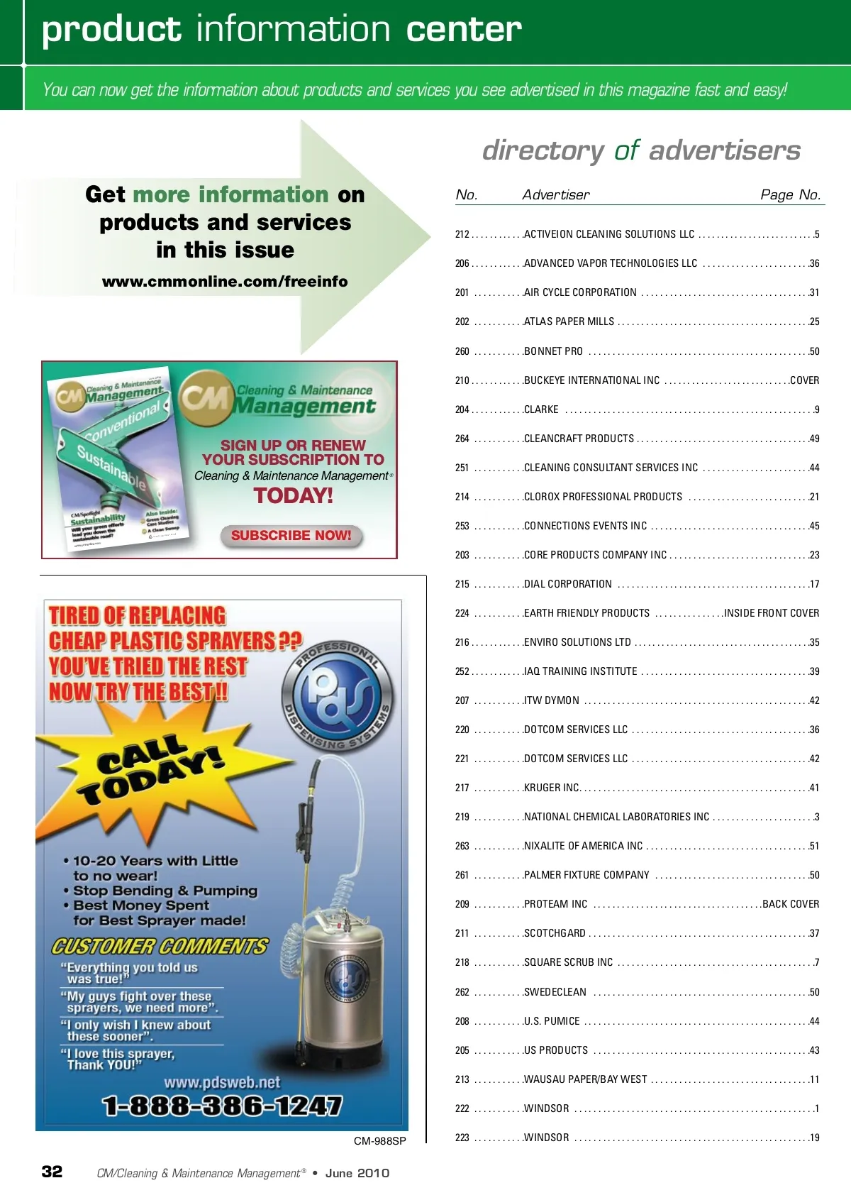 product information center You can now get the information about products and services you see advertised in this magazine fast and easy! directory of advertisers Get more information on products and services in this issue www.cmmonline.com/freeinfo No. Advertiser Page No. 212 . . . . . . . . . . . .ACTIVEION CLEANING SOLUTIONS LLC . . . . . . . . . . . . . . . . . . . . . . . . . .5 206 . . . . . . . . . . . .ADVANCED VAPOR TECHNOLOGIES LLC . . . . . . . . . . . . . . . . . . . . . . .36 201 . . . . . . . . . . .AIR CYCLE CORPORATION . . . . . . . . . . . . . . . . . . . . . . . . . . . . . . . . . . . .31 202 . . . . . . . . . . .ATLAS PAPER MILLS . . . . . . . . . . . . . . . . . . . . . . . . . . . . . . . . . . . . . . . . .25 260 . . . . . . . . . . .BONNET PRO . . . . . . . . . . . . . . . . . . . . . . . . . . . . . . . . . . . . . . . . . . . . . . .50 June 2010 210 . . . . . . . . . . . .BUCKEYE INTERNATIONAL INC . . . . . . . . . . . . . . . . . . . . . . . . . . . .COVER 204 . . . . . . . . . . . .CLARKE . . . . . . . . . . . . . . . . . . . . . . . . . . . . . . . . . . . . . . . . . . . . . . . . . . . . .9 SIGN UP OR RENEW YOUR SUBSCRIPTION TO Cleaning & Maintenance Management ® 264 . . . . . . . . . . .CLEANCRAFT PRODUCTS . . . . . . . . . . . . . . . . . . . . . . . . . . . . . . . . . . . . .49 251 . . . . . . . . . . .CLEANING CONSULTANT SERVICES INC . . . . . . . . . . . . . . . . . . . . . . .44 214 . . . . . . . . . . .CLOROX PROFESSIONAL PRODUCTS . . . . . . . . . . . . . . . . . . . . . . . . . .21 253 . . . . . . . . . . .CONNECTIONS EVENTS INC . . . . . . . . . . . . . . . . . . . . . . . . . . . . . . . . . .45 TODAY! V G GRAND EDIA VIEW M GROUP SUBSCRIBE NOW! 203 . . . . . . . . . . .CORE PRODUCTS COMPANY INC . . . . . . . . . . . . . . . . . . . . . . . . . . . . . .23 215 . . . . . . . . . . .DIAL CORPORATION . . . . . . . . . . . . . . . . . . . . . . . . . . . . . . . . . . . . . . . . .17 224 . . . . . . . . . . .EARTH FRIENDLY PRODUCTS . . . . . . . . . . . . . . .INSIDE FRONT COVER 216 . . . . . . . . . . . .ENVIRO SOLUTIONS LTD . . . . . . . . . . . . . . . . . . . . . . . . . . . . . . . . . . . . . . .35 252 . . . . . . . . . . . .IAQ TRAINING INSTITUTE . . . . . . . . . . . . . . . . . . . . . . . . . . . . . . . . . . . .39 207 . . . . . . . . . . .ITW DYMON . . . . . . . . . . . . . . . . . . . . . . . . . . . . . . . . . . . . . . . . . . . . . . . .42 220 . . . . . . . . . . .DOTCOM SERVICES LLC . . . . . . . . . . . . . . . . . . . . . . . . . . . . . . . . . . . . . .36 221 . . . . . . . . . . .DOTCOM SERVICES LLC . . . . . . . . . . . . . . . . . . . . . . . . . . . . . . . . . . . . . .42 217 . . . . . . . . . . .KRUGER INC. . . . . . . . . . . . . . . . . . . . . . . . . . . . . . . . . . . . . . . . . . . . . . . . .41 219 . . . . . . . . . . .NATIONAL CHEMICAL LABORATORIES INC . . . . . . . . . . . . . . . . . . . . . .3 263 . . . . . . . . . . .NIXALITE OF AMERICA INC . . . . . . . . . . . . . . . . . . . . . . . . . . . . . . . . . . .51 261 . . . . . . . . . . .PALMER FIXTURE COMPANY . . . . . . . . . . . . . . . . . . . . . . . . . . . . . . . . .50 209 . . . . . . . . . . .PROTEAM INC . . . . . . . . . . . . . . . . . . . . . . . . . . . . . . . . . . . .BACK COVER 211 . . . . . . . . . . .SCOTCHGARD . . . . . . . . . . . . . . . . . . . . . . . . . . . . . . . . . . . . . . . . . . . . . . .37 218 . . . . . . . . . . .SQUARE SCRUB INC . . . . . . . . . . . . . . . . . . . . . . . . . . . . . . . . . . . . . . . . . .7 262 . . . . . . . . . . .SWEDECLEAN . . . . . . . . . . . . . . . . . . . . . . . . . . . . . . . . . . . . . . . . . . . . . .50 208 . . . . . . . . . . .U.S. PUMICE . . . . . . . . . . . . . . . . . . . . . . . . . . . . . . . . . . . . . . . . . . . . . . . .44 205 . . . . . . . . . . .US PRODUCTS . . . . . . . . . . . . . . . . . . . . . . . . . . . . . . . . . . . . . . . . . . . . . .43 213 . . . . . . . . . . .WAUSAU PAPER/BAY WEST . . . . . . . . . . . . . . . . . . . . . . . . . . . . . . . . . .11 222 . . . . . . . . . . .WINDSOR . . . . . . . . . . . . . . . . . . . . . . . . . . . . . . . . . . . . . . . . . . . . . . . . . . .1 CM-988SP 223 . . . . . . . . . . .WINDSOR . . . . . . . . . . . . . . . . . . . . . . . . . . . . . . . . . . . . . . . . . . . . . . . . . .19 nline.com www.cmmo 32 CM/Cleaning & Maintenance Management ® • June 2010
