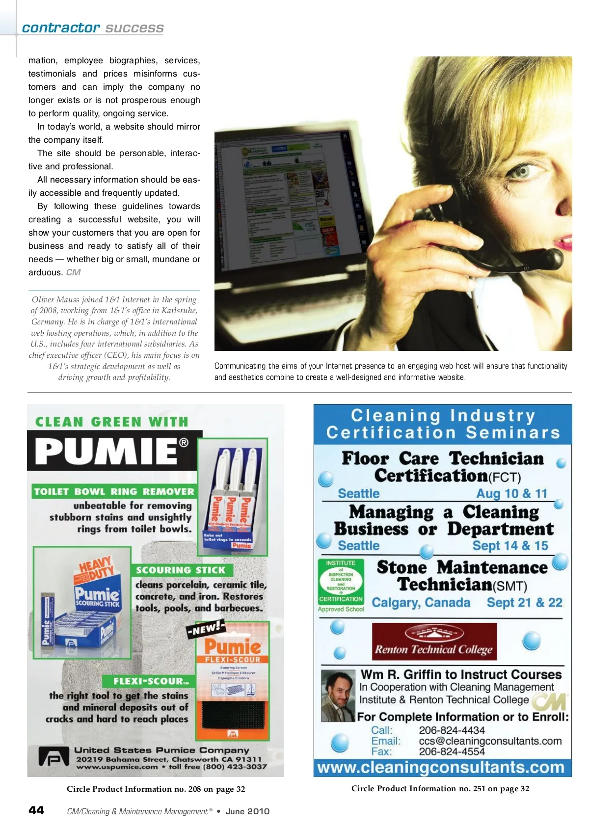 contractor success mation, employee biographies, services, testimonials and prices misinforms cus-tomers and can imply the company no longer exists or is not prosperous enough to perform quality, ongoing service. In today’s world, a website should mirror the company itself. The site should be personable, interac-tive and professional. All necessary information should be eas-ily accessible and frequently updated. By following these guidelines towards creating a successful website, you will show your customers that you are open for business and ready to satisfy all of their needs — whether big or small, mundane or arduous. CM Oliver Mauss joined 1&1 Internet in the spring of 2008, working from 1&1’s office in Karlsruhe, Germany. He is in charge of 1&1’s international web hosting operations, which, in addition to the U.S., includes four international subsidiaries. As chief executive officer (CEO), his main focus is on 1&1’s strategic development as well as driving growth and profitability. Communicating the aims of your Internet presence to an engaging web host will ensure that functionality and aesthetics combine to create a well-designed and informative website. Circle Product Information no. 208 on page 32 Circle Product Information no. 251 on page 32 44 CM/Cleaning & Maintenance Management ® • June 2010