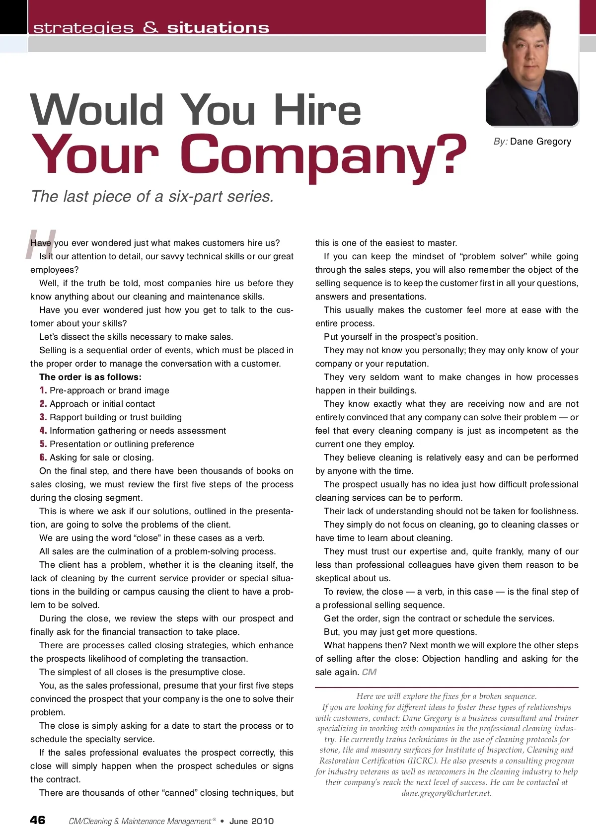 strategies & situations Would You Hire The last piece of a six-part series. Your Company? By: Dane Gregory H Have you ever wondered just what makes customers hire us? Is it our attention to detail, our savvy technical skills or our great employees? Well, if the truth be told, most companies hire us before they know anything about our cleaning and maintenance skills. Have you ever wondered just how you get to talk to the cus-tomer about your skills? Let’s dissect the skills necessary to make sales. Selling is a sequential order of events, which must be placed in the proper order to manage the conversation with a customer. The order is as follows: 1. Pre-approach or brand image 2. Approach or initial contact 3. Rapport building or trust building 4. Information gathering or needs assessment 5. Presentation or outlining preference 6. Asking for sale or closing. On the final step, and there have been thousands of books on sales closing, we must review the first five steps of the process during the closing segment. This is where we ask if our solutions, outlined in the presenta-tion, are going to solve the problems of the client. We are using the word “close” in these cases as a verb. All sales are the culmination of a problem-solving process. The client has a problem, whether it is the cleaning itself, the lack of cleaning by the current service provider or special situa-tions in the building or campus causing the client to have a prob-lem to be solved. During the close, we review the steps with our prospect and finally ask for the financial transaction to take place. There are processes called closing strategies, which enhance the prospects likelihood of completing the transaction. The simplest of all closes is the presumptive close. You, as the sales professional, presume that your first five steps convinced the prospect that your company is the one to solve their problem. The close is simply asking for a date to start the process or to schedule the specialty service. If the sales professional evaluates the prospect correctly, this close will simply happen when the prospect schedules or signs the contract. There are thousands of other “canned” closing techniques, but CM/Cleaning & Maintenance Management ® • June 2010 this is one of the easiest to master. If you can keep the mindset of “problem solver” while going through the sales steps, you will also remember the object of the selling sequence is to keep the customer first in all your questions, answers and presentations. This usually makes the customer feel more at ease with the entire process. Put yourself in the prospect’s position. They may not know you personally; they may only know of your company or your reputation. They very seldom want to make changes in how processes happen in their buildings. They know exactly what they are receiving now and are not entirely convinced that any company can solve their problem — or feel that every cleaning company is just as incompetent as the current one they employ. They believe cleaning is relatively easy and can be performed by anyone with the time. The prospect usually has no idea just how difficult professional cleaning services can be to perform. Their lack of understanding should not be taken for foolishness. They simply do not focus on cleaning, go to cleaning classes or have time to learn about cleaning. They must trust our expertise and, quite frankly, many of our less than professional colleagues have given them reason to be skeptical about us. To review, the close — a verb, in this case — is the final step of a professional selling sequence. Get the order, sign the contract or schedule the services. But, you may just get more questions. What happens then? Next month we will explore the other steps of selling after the close: Objection handling and asking for the sale again. CM Here we will explore the fixes for a broken sequence. If you are looking for different ideas to foster these types of relationships with customers, contact: Dane Gregory is a business consultant and trainer specializing in working with companies in the professional cleaning indus-try. He currently trains technicians in the use of cleaning protocols for stone, tile and masonry surfaces for Institute of Inspection, Cleaning and Restoration Certification (IICRC). He also presents a consulting program for industry veterans as well as newcomers in the cleaning industry to help their company’s reach the next level of success. He can be contacted at [email protected]. 46