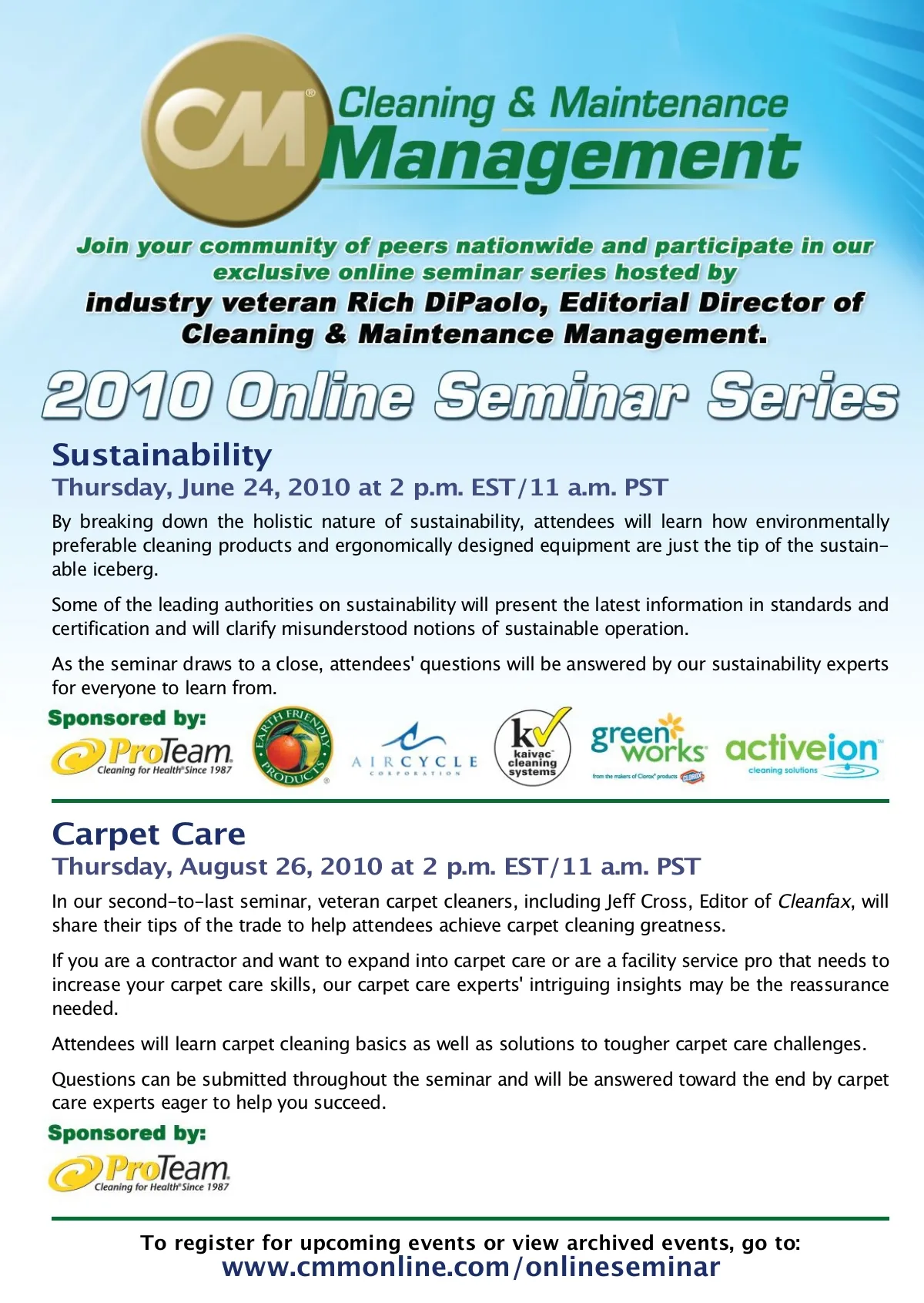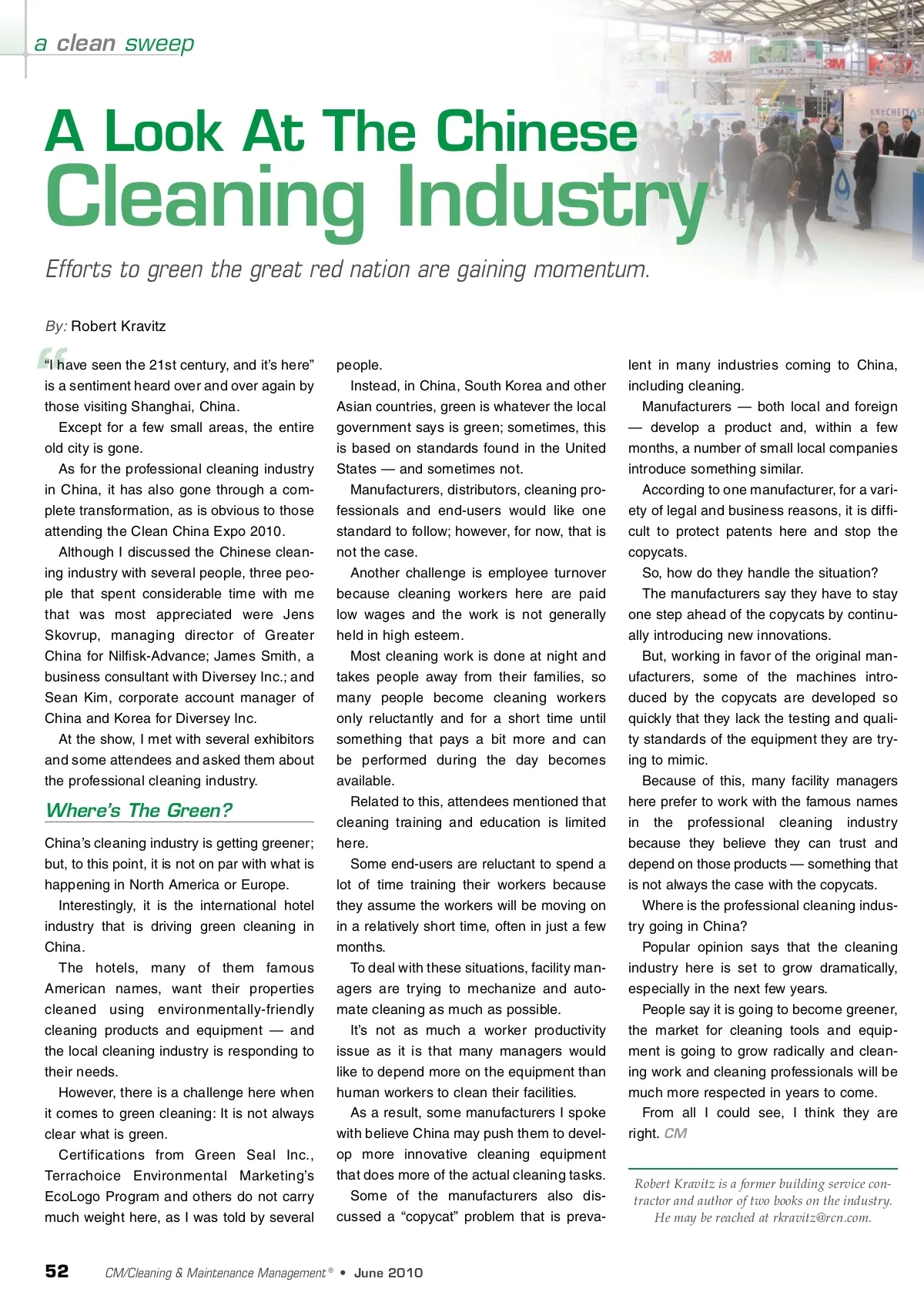 a clean sweep A Look At The Chinese Cleaning Industry Efforts to green the great red nation are gaining momentum. By: Robert Kravitz “ “I have seen the 21st century, and it’s here” is a sentiment heard over and over again by those visiting Shanghai, China. Except for a few small areas, the entire old city is gone. As for the professional cleaning industry in China, it has also gone through a com-plete transformation, as is obvious to those attending the Clean China Expo 2010. Although I discussed the Chinese clean-ing industry with several people, three peo-ple that spent considerable time with me that was most appreciated were Jens Skovrup, managing director of Greater China for Nilfisk-Advance; James Smith, a business consultant with Diversey Inc.; and Sean Kim, corporate account manager of China and Korea for Diversey Inc. At the show, I met with several exhibitors and some attendees and asked them about the professional cleaning industry. Where’s The Green? China’s cleaning industry is getting greener; but, to this point, it is not on par with what is happening in North America or Europe. Interestingly, it is the international hotel industry that is driving green cleaning in China. The hotels, many of them famous American names, want their properties cleaned using environmentally-friendly cleaning products and equipment — and the local cleaning industry is responding to their needs. However, there is a challenge here when it comes to green cleaning: It is not always clear what is green. Certifications from Green Seal Inc., Terrachoice Environmental Marketing’s EcoLogo Program and others do not carry much weight here, as I was told by several people. Instead, in China, South Korea and other Asian countries, green is whatever the local government says is green; sometimes, this is based on standards found in the United States — and sometimes not. Manufacturers, distributors, cleaning pro-fessionals and end-users would like one standard to follow; however, for now, that is not the case. Another challenge is employee turnover because cleaning workers here are paid low wages and the work is not generally held in high esteem. Most cleaning work is done at night and takes people away from their families, so many people become cleaning workers only reluctantly and for a short time until something that pays a bit more and can be performed during the day becomes available. Related to this, attendees mentioned that cleaning training and education is limited here. Some end-users are reluctant to spend a lot of time training their workers because they assume the workers will be moving on in a relatively short time, often in just a few months. To deal with these situations, facility man-agers are trying to mechanize and auto-mate cleaning as much as possible. It’s not as much a worker productivity issue as it is that many managers would like to depend more on the equipment than human workers to clean their facilities. As a result, some manufacturers I spoke with believe China may push them to devel-op more innovative cleaning equipment that does more of the actual cleaning tasks. Some of the manufacturers also dis-cussed a “copycat” problem that is preva-lent in many industries coming to China, including cleaning. Manufacturers — both local and foreign — develop a product and, within a few months, a number of small local companies introduce something similar. According to one manufacturer, for a vari-ety of legal and business reasons, it is diffi-cult to protect patents here and stop the copycats. So, how do they handle the situation? The manufacturers say they have to stay one step ahead of the copycats by continu-ally introducing new innovations. But, working in favor of the original man-ufacturers, some of the machines intro-duced by the copycats are developed so quickly that they lack the testing and quali-ty standards of the equipment they are try-ing to mimic. Because of this, many facility managers here prefer to work with the famous names in the professional cleaning industry because they believe they can trust and depend on those products — something that is not always the case with the copycats. Where is the professional cleaning indus-try going in China? Popular opinion says that the cleaning industry here is set to grow dramatically, especially in the next few years. People say it is going to become greener, the market for cleaning tools and equip-ment is going to grow radically and clean-ing work and cleaning professionals will be much more respected in years to come. From all I could see, I think they are right. CM Robert Kravitz is a former building service con-tractor and author of two books on the industry. He may be reached at [email protected]. 52 CM/Cleaning & Maintenance Management ® • June 2010