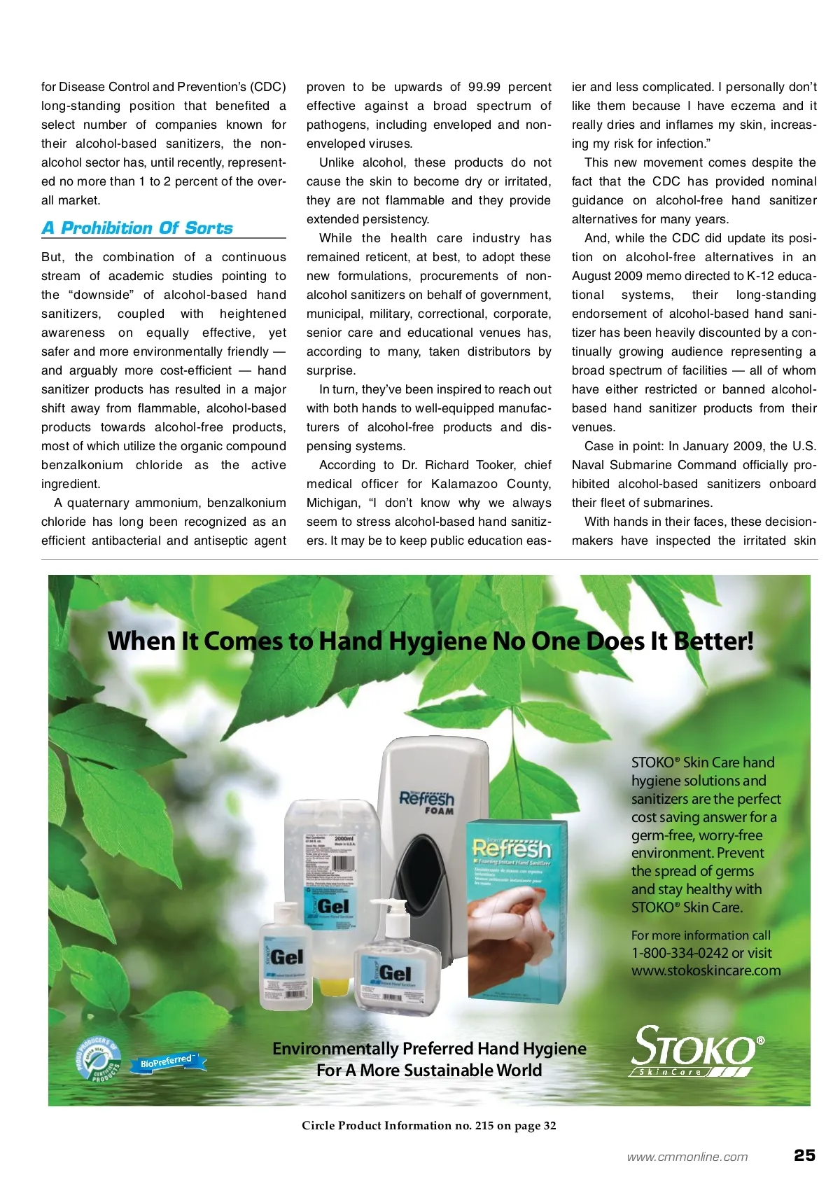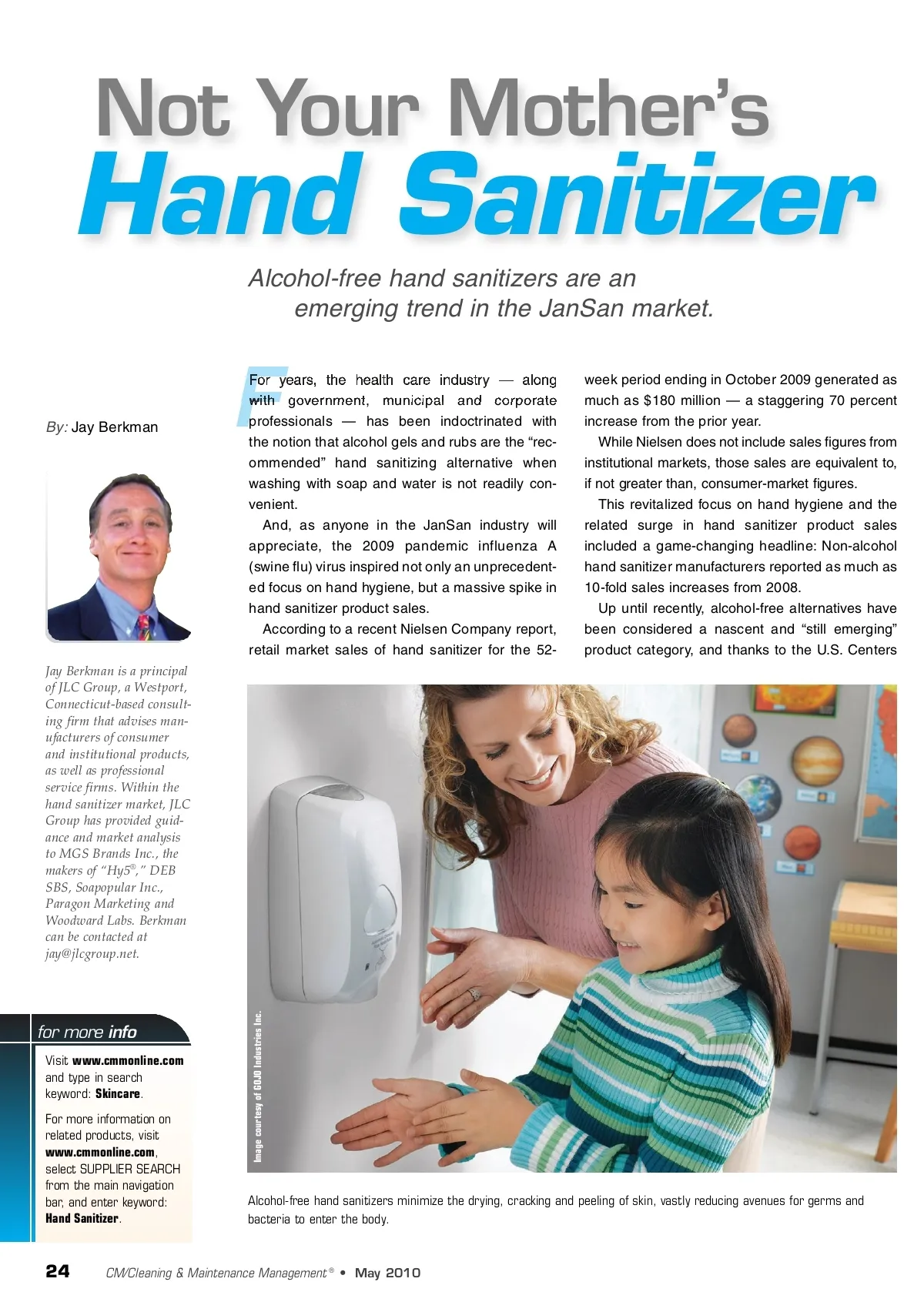 Hand Sanitizer Alcohol-free hand sanitizers are an emerging trend in the JanSan market. By: Jay Berkman Not Your Mother’s F For years, the health care industry — along with government, municipal and corporate professionals — has been indoctrinated with the notion that alcohol gels and rubs are the “rec-ommended” hand sanitizing alternative when washing with soap and water is not readily con-venient. And, as anyone in the JanSan industry will appreciate, the 2009 pandemic influenza A (swine flu) virus inspired not only an unprecedent-ed focus on hand hygiene, but a massive spike in hand sanitizer product sales. According to a recent Nielsen Company report, retail market sales of hand sanitizer for the 52-week period ending in October 2009 generated as much as $180 million — a staggering 70 percent increase from the prior year. While Nielsen does not include sales figures from institutional markets, those sales are equivalent to, if not greater than, consumer-market figures. This revitalized focus on hand hygiene and the related surge in hand sanitizer product sales included a game-changing headline: Non-alcohol hand sanitizer manufacturers reported as much as 10-fold sales increases from 2008. Up until recently, alcohol-free alternatives have been considered a nascent and “still emerging” product category, and thanks to the U.S. Centers Jay Berkman is a principal of JLC Group, a Westport, Connecticut-based consult-ing firm that advises man-ufacturers of consumer and institutional products, as well as professional service firms. Within the hand sanitizer market, JLC Group has provided guid-ance and market analysis to MGS Brands Inc., the makers of “Hy5 ® ,” DEB SBS, Soapopular Inc., Paragon Marketing and Woodward Labs. Berkman can be contacted at [email protected]. for more info Visit www.cmmonline.com and type in search keyword: Skincare . For more information on related products, visit www.cmmonline.com , select SUPPLIER SEARCH from the main navigation bar, and enter keyword: Hand Sanitizer . Alcohol-free hand sanitizers minimize the drying, cracking and peeling of skin, vastly reducing avenues for germs and bacteria to enter the body. 24 CM/Cleaning & Maintenance Management ® • May 2010 Image courtesy of GOJO Industries Inc.