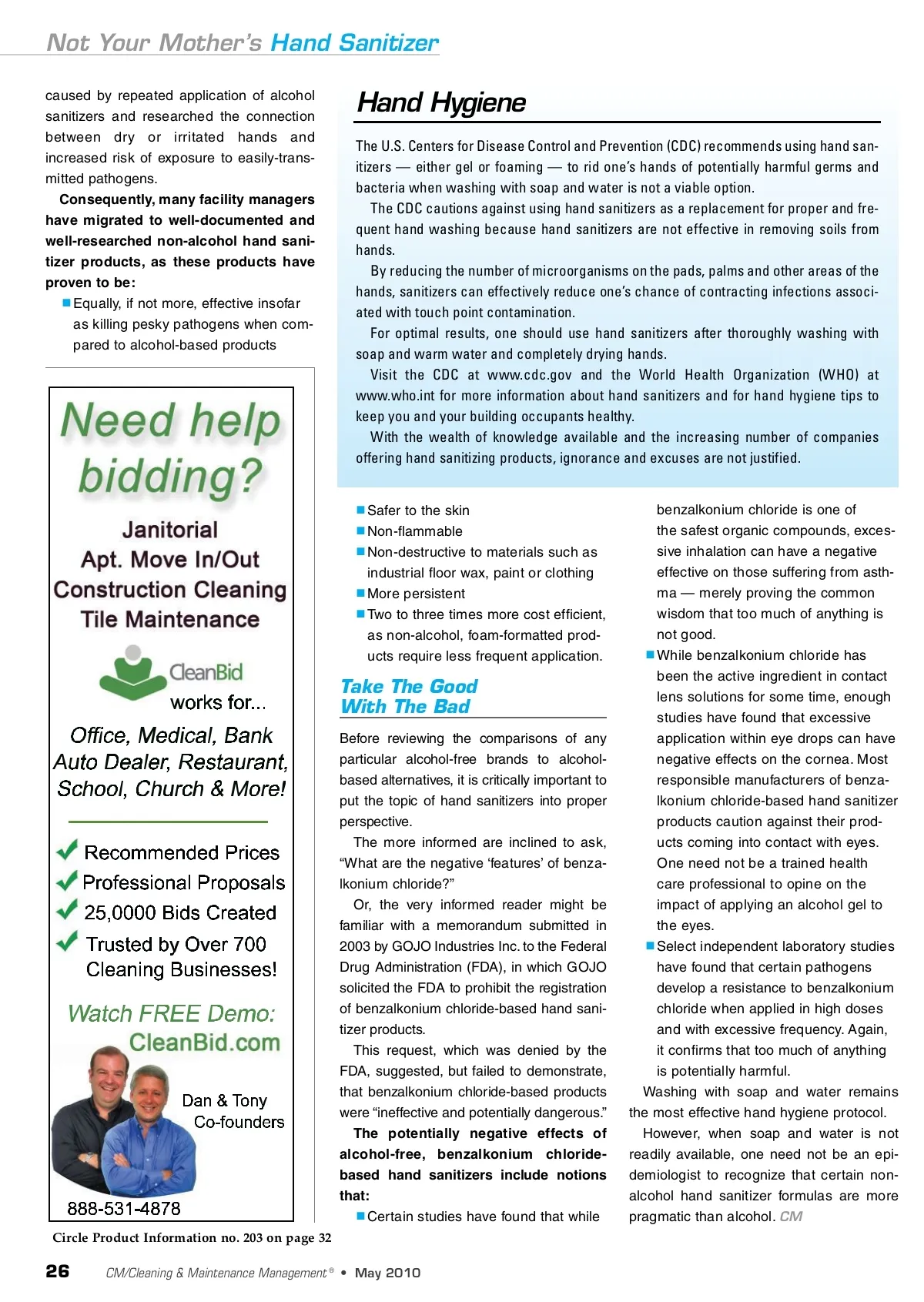 Not Your Mother’s Hand Sanitizer caused by repeated application of alcohol sanitizers and researched the connection between dry or irritated hands and increased risk of exposure to easily-trans-mitted pathogens. Consequently, many facility managers have migrated to well-documented and well-researched non-alcohol hand sani-tizer products, as these products have proven to be: Equally, if not more, effective insofar as killing pesky pathogens when com-pared to alcohol-based products Hand Hygiene The U.S. Centers for Disease Control and Prevention (CDC) recommends using hand san-itizers — either gel or foaming — to rid one’s hands of potentially harmful germs and bacteria when washing with soap and water is not a viable option. The CDC cautions against using hand sanitizers as a replacement for proper and fre-quent hand washing because hand sanitizers are not effective in removing soils from hands. By reducing the number of microorganisms on the pads, palms and other areas of the hands, sanitizers can effectively reduce one’s chance of contracting infections associ-ated with touch point contamination. For optimal results, one should use hand sanitizers after thoroughly washing with soap and warm water and completely drying hands. Visit the CDC at www.cdc.gov and the World Health Organization (WHO) at www.who.int for more information about hand sanitizers and for hand hygiene tips to keep you and your building occupants healthy. With the wealth of knowledge available and the increasing number of companies offering hand sanitizing products, ignorance and excuses are not justified. Safer to the skin Non-flammable Non-destructive to materials such as industrial floor wax, paint or clothing More persistent Two to three times more cost efficient, as non-alcohol, foam-formatted prod-ucts require less frequent application. Take The Good With The Bad Before reviewing the comparisons of any particular alcohol-free brands to alcohol-based alternatives, it is critically important to put the topic of hand sanitizers into proper perspective. The more informed are inclined to ask, “What are the negative ‘features’ of benza-lkonium chloride?” Or, the very informed reader might be familiar with a memorandum submitted in 2003 by GOJO Industries Inc. to the Federal Drug Administration (FDA), in which GOJO solicited the FDA to prohibit the registration of benzalkonium chloride-based hand sani-tizer products. This request, which was denied by the FDA, suggested, but failed to demonstrate, that benzalkonium chloride-based products were “ineffective and potentially dangerous.” The potentially negative effects of alcohol-free, benzalkonium chloride-based hand sanitizers include notions that: Certain studies have found that while Circle Product Information no. 203 on page 32 benzalkonium chloride is one of the safest organic compounds, exces-sive inhalation can have a negative effective on those suffering from asth-ma — merely proving the common wisdom that too much of anything is not good. While benzalkonium chloride has been the active ingredient in contact lens solutions for some time, enough studies have found that excessive application within eye drops can have negative effects on the cornea. Most responsible manufacturers of benza-lkonium chloride-based hand sanitizer products caution against their prod-ucts coming into contact with eyes. One need not be a trained health care professional to opine on the impact of applying an alcohol gel to the eyes. Select independent laboratory studies have found that certain pathogens develop a resistance to benzalkonium chloride when applied in high doses and with excessive frequency. Again, it confirms that too much of anything is potentially harmful. Washing with soap and water remains the most effective hand hygiene protocol. However, when soap and water is not readily available, one need not be an epi-demiologist to recognize that certain non-alcohol hand sanitizer formulas are more pragmatic than alcohol. CM 26 CM/Cleaning & Maintenance Management ® • May 2010