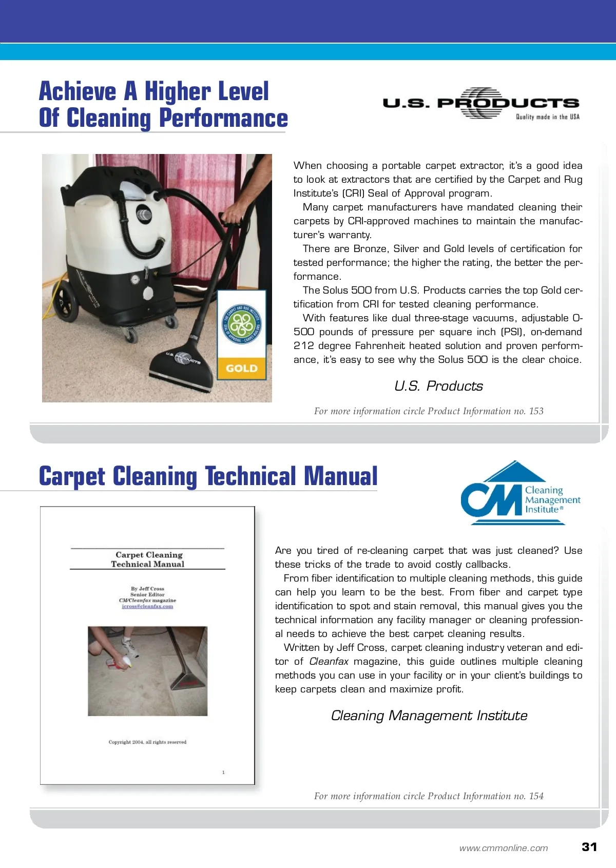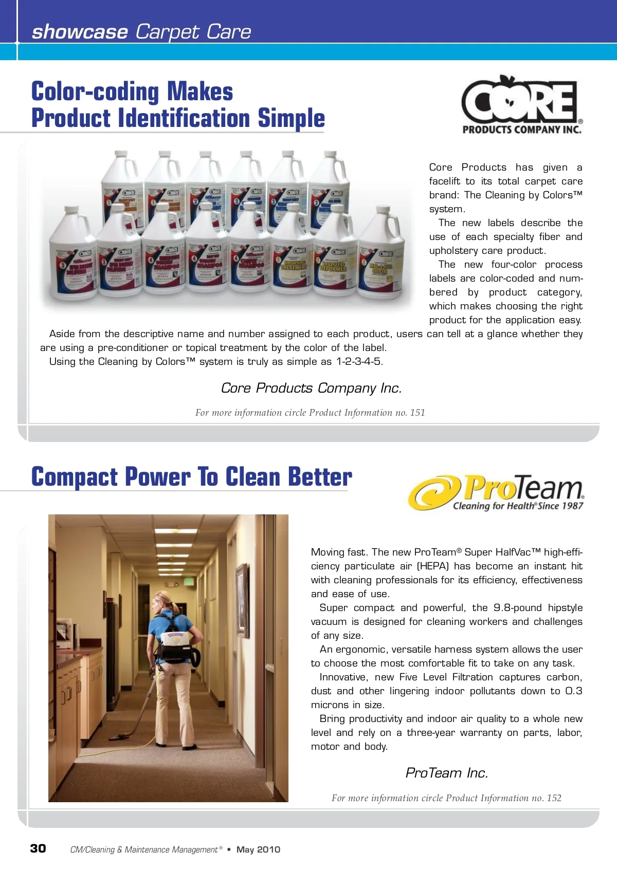 showcase Carpet Care Color-coding Makes Product Identification Simple Core Products has given a facelift to its total carpet care brand: The Cleaning by Colors™ system. The new labels describe the use of each specialty fiber and upholstery care product. The new four-color process labels are color-coded and num-bered by product category, which makes choosing the right product for the application easy. Aside from the descriptive name and number assigned to each product, users can tell at a glance whether they are using a pre-conditioner or topical treatment by the color of the label. Using the Cleaning by Colors™ system is truly as simple as 1-2-3-4-5. Core Products Company Inc. For more information circle Product Information no. 151 Compact Power To Clean Better Moving fast. The new ProTeam ® Super HalfVac™ high-effi-ciency particulate air (HEPA) has become an instant hit with cleaning professionals for its efficiency, effectiveness and ease of use. Super compact and powerful, the 9.8-pound hipstyle vacuum is designed for cleaning workers and challenges of any size. An ergonomic, versatile harness system allows the user to choose the most comfortable fit to take on any task. Innovative, new Five Level Filtration captures carbon, dust and other lingering indoor pollutants down to 0.3 microns in size. Bring productivity and indoor air quality to a whole new level and rely on a three-year warranty on parts, labor, motor and body. ProTeam Inc. For more information circle Product Information no. 152 30 CM/Cleaning & Maintenance Management ® • May 2010