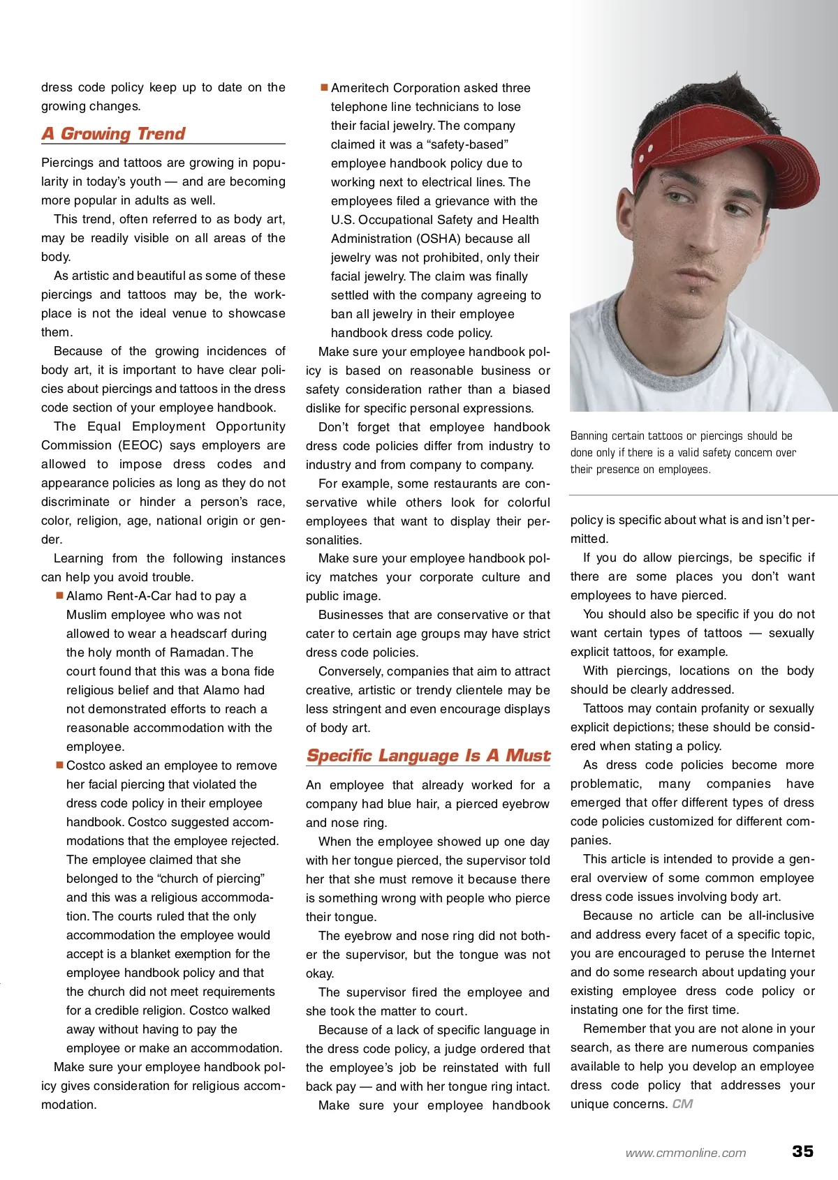 Dress Codes And By: Wendy Christie Today’s Culture Your employee handbook should clearly define acceptable body art. Wendy Christie is the owner of Human Resources Consulting, specializing in employee hand-books that are customized by state law, federal regulations and industry. Human Resources Consulting also offers services in all areas of human resources. Christie can be reached at 406-539-8041 or www.employeehandbooknow.com. for more info Visit www.cmmonline.com and type in search keyword: Employees . For more information on related products, visit www.cmmonline.com , select SUPPLIER SEARCH from the main navigation bar, and enter keyword: Consulting . You would have to be blind to miss the changes in peoples’ fash-ion preferences. Every year, millions of men and woman are getting pierc-ings and tattoos and the body parts that can be pierced, pricked, lanced and tat-tooed are growing in number. You can see potential applicants with every-thing from traditional earlobes pierced to belly buttons, tongues, noses, lips, eyebrows, cheeks and even nipples pierced. And, some of these young applicants feel that if Discriminating against employees for their fashion sense is illegal. Instead, specifically map out employee dress code requirements to alleviate the issue. they have these private areas pierced they need to show off their jewelry. These young people are graduating high school or college and either have or will be showing up on your business doorstep looking for employment. It is important that your employee handbook 34 CM/Cleaning & Maintenance Management ® • May 2010