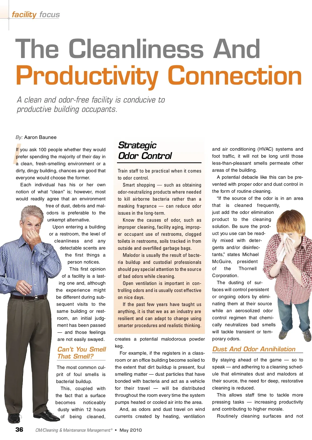 facility focus The Cleanliness And Productivity Connection A clean and odor-free facility is conducive to productive building occupants. By: Aaron Baunee I If you ask 100 people whether they would prefer spending the majority of their day in a clean, fresh-smelling environment or a dirty, dingy building, chances are good that everyone would choose the former. Each individual has his or her own notion of what “clean” is; however, most would readily agree that an environment free of dust, debris and mal-odors is preferable to the unkempt alternative. Upon entering a building or a restroom, the level of cleanliness and any detectable scents are the first things a person notices. This first opinion of a facility is a last-ing one and, although the experience might be different during sub-sequent visits to the same building or rest-room, an initial judg-ment has been passed — and those feelings are not easily swayed. Strategic Odor Control Train staff to be practical when it comes to odor control. Smart shopping — such as obtaining odor-neutralizing products where needed to kill airborne bacteria rather than a masking fragrance — can reduce odor issues in the long-term. Know the causes of odor, such as improper cleaning, facility aging, improp-er occupant use of restrooms, clogged toilets in restrooms, soils tracked in from outside and overfilled garbage bags. Malodor is usually the result of bacte-ria buildup and custodial professionals should pay special attention to the source of bad odors while cleaning. Open ventilation is important in con-trolling odors and is usually cost effective on nice days. If the past few years have taught us anything, it is that we as an industry are resilient and can adapt to change using smarter procedures and realistic thinking. creates a potential malodorous powder keg. For example, if the registers in a class-room or an office building become soiled to the extent that dirt buildup is present, foul smelling matter — dust particles that have bonded with bacteria and act as a vehicle for their travel — will be distributed throughout the room every time the system pumps heated or cooled air into the area. And, as odors and dust travel on wind currents created by heating, ventilation and air conditioning (HVAC) systems and foot traffic, it will not be long until those less-than-pleasant smells permeate other areas of the building. A potential debacle like this can be pre-vented with proper odor and dust control in the form of routine cleaning. “If the source of the odor is in an area that is cleaned frequently, just add the odor elimination product to the cleaning solution. Be sure the prod-uct you use can be read-ily mixed with deter-gents and/or disinfec-tants,” states Michael McGuire, president of the Thornell Corporation. The dusting of sur-faces will control persistent or ongoing odors by elimi-nating them at their source while an aerosolized odor control regimen that chemi-cally neutralizes bad smells will tackle transient or tem-porary odors. Can’t You Smell That Smell? The most common cul-prit of foul smells is bacterial buildup. This, coupled with the fact that a surface becomes noticeably dusty within 12 hours of being cleaned, Dust And Odor Annihilation By staying ahead of the game — so to speak — and adhering to a cleaning sched-ule that eliminates dust and malodors at their source, the need for deep, restorative cleaning is reduced. This allows staff time to tackle more pressing tasks — increasing productivity and contributing to higher morale. Routinely cleaning surfaces and not 36 CM/Cleaning & Maintenance Management ® • May 2010