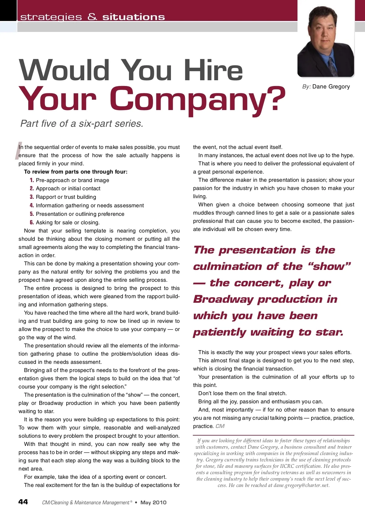 strategies & situations Your Company? Part five of a six-part series. Would You Hire By: Dane Gregory I In the sequential order of events to make sales possible, you must ensure that the process of how the sale actually happens is placed firmly in your mind. To review from parts one through four: 1. Pre-approach or brand image 2. Approach or initial contact 3. Rapport or trust building 4. Information gathering or needs assessment 5. Presentation or outlining preference 6. Asking for sale or closing. Now that your selling template is nearing completion, you should be thinking about the closing moment or putting all the small agreements along the way to completing the financial trans-action in order. This can be done by making a presentation showing your com-pany as the natural entity for solving the problems you and the prospect have agreed upon along the entire selling process. The entire process is designed to bring the prospect to this presentation of ideas, which were gleaned from the rapport build-ing and information gathering steps. You have reached the time where all the hard work, brand build-ing and trust building are going to now be lined up in review to allow the prospect to make the choice to use your company — or go the way of the wind. The presentation should review all the elements of the informa-tion gathering phase to outline the problem/solution ideas dis-cussed in the needs assessment. Bringing all of the prospect’s needs to the forefront of the pres-entation gives them the logical steps to build on the idea that “of course your company is the right selection.” The presentation is the culmination of the “show” — the concert, play or Broadway production in which you have been patiently waiting to star. It is the reason you were building up expectations to this point: To wow them with your simple, reasonable and well-analyzed solutions to every problem the prospect brought to your attention. With that thought in mind, you can now really see why the process has to be in order — without skipping any steps and mak-ing sure that each step along the way was a building block to the next area. For example, take the idea of a sporting event or concert. The real excitement for the fan is the buildup of expectations for the event, not the actual event itself. In many instances, the actual event does not live up to the hype. That is where you need to deliver the professional equivalent of a great personal experience. The difference maker in the presentation is passion; show your passion for the industry in which you have chosen to make your living. When given a choice between choosing someone that just muddles through canned lines to get a sale or a passionate sales professional that can cause you to become excited, the passion-ate individual will be chosen every time. The presentation is the culmination of the “show” — the concert, play or Broadway production in which you have been patiently waiting to star. This is exactly the way your prospect views your sales efforts. This almost final stage is designed to get you to the next step, which is closing the financial transaction. Your presentation is the culmination of all your efforts up to this point. Don’t lose them on the final stretch. Bring all the joy, passion and enthusiasm you can. And, most importantly — if for no other reason than to ensure you are not missing any crucial talking points — practice, practice, practice. CM If you are looking for different ideas to foster these types of relationships with customers, contact Dane Gregory, a business consultant and trainer specializing in working with companies in the professional cleaning indus-try. Gregory currently trains technicians in the use of cleaning protocols for stone, tile and masonry surfaces for IICRC certification. He also pres-ents a consulting program for industry veterans as well as newcomers in the cleaning industry to help their company’s reach the next level of suc-cess. He can be reached at [email protected]. 44 CM/Cleaning & Maintenance Management ® • May 2010