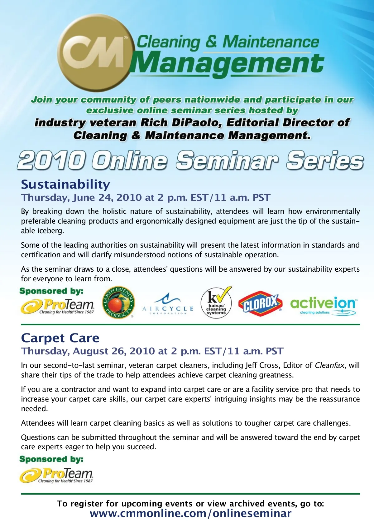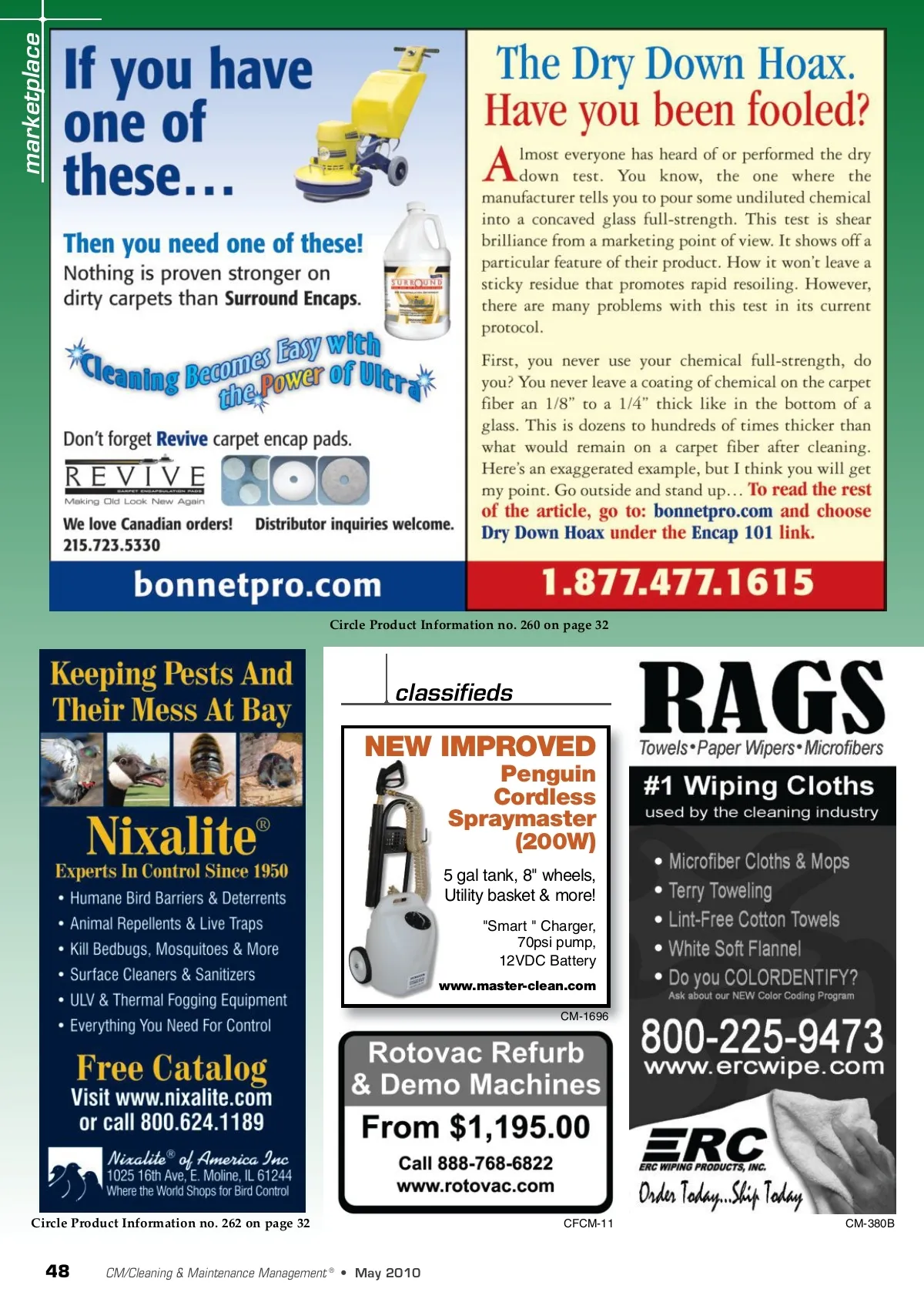marketplace Circle Product Information no. 260 on page 32 classifieds NEW IMPROVED Penguin Cordless Spraymaster (200W) 5 gal tank, 8" wheels, Utility basket & more! "Smart " Charger, 70psi pump, 12VDC Battery www.master-clean.com CM-1696 Circle Product Information no. 262 on page 32 CFCM-11 CM-380B 48 CM/Cleaning & Maintenance Management ® • May 2010