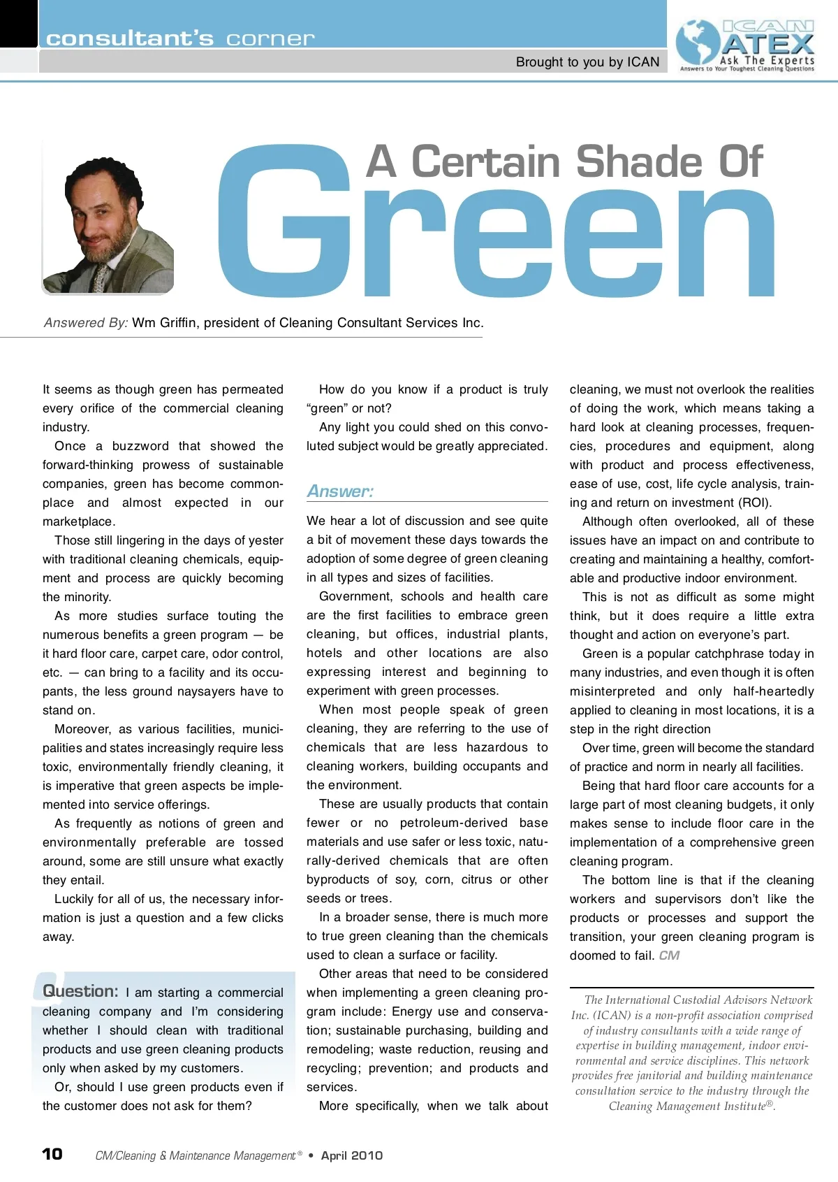 consultant’s corner Brought to you by ICAN Answered By: Wm Griffin, president of Cleaning Consultant Services Inc. Green How do you know if a product is truly “green” or not? Any light you could shed on this convo-luted subject would be greatly appreciated. A Certain Shade Of It seems as though green has permeated every orifice of the commercial cleaning industry. Once a buzzword that showed the forward-thinking prowess of sustainable companies, green has become common-place and almost expected in our marketplace. Those still lingering in the days of yester with traditional cleaning chemicals, equip-ment and process are quickly becoming the minority. As more studies surface touting the numerous benefits a green program — be it hard floor care, carpet care, odor control, etc. — can bring to a facility and its occu-pants, the less ground naysayers have to stand on. Moreover, as various facilities, munici-palities and states increasingly require less toxic, environmentally friendly cleaning, it is imperative that green aspects be imple-mented into service offerings. As frequently as notions of green and environmentally preferable are tossed around, some are still unsure what exactly they entail. Luckily for all of us, the necessary infor-mation is just a question and a few clicks away. Answer: We hear a lot of discussion and see quite a bit of movement these days towards the adoption of some degree of green cleaning in all types and sizes of facilities. Government, schools and health care are the first facilities to embrace green cleaning, but offices, industrial plants, hotels and other locations are also expressing interest and beginning to experiment with green processes. When most people speak of green cleaning, they are referring to the use of chemicals that are less hazardous to cleaning workers, building occupants and the environment. These are usually products that contain fewer or no petroleum-derived base materials and use safer or less toxic, natu-rally-derived chemicals that are often byproducts of soy, corn, citrus or other seeds or trees. In a broader sense, there is much more to true green cleaning than the chemicals used to clean a surface or facility. Other areas that need to be considered when implementing a green cleaning pro-gram include: Energy use and conserva-tion; sustainable purchasing, building and remodeling; waste reduction, reusing and recycling; prevention; and products and services. More specifically, when we talk about cleaning, we must not overlook the realities of doing the work, which means taking a hard look at cleaning processes, frequen-cies, procedures and equipment, along with product and process effectiveness, ease of use, cost, life cycle analysis, train-ing and return on investment (ROI). Although often overlooked, all of these issues have an impact on and contribute to creating and maintaining a healthy, comfort-able and productive indoor environment. This is not as difficult as some might think, but it does require a little extra thought and action on everyoneʼs part. Green is a popular catchphrase today in many industries, and even though it is often misinterpreted and only half-heartedly applied to cleaning in most locations, it is a step in the right direction Over time, green will become the standard of practice and norm in nearly all facilities. Being that hard floor care accounts for a large part of most cleaning budgets, it only makes sense to include floor care in the implementation of a comprehensive green cleaning program. The bottom line is that if the cleaning workers and supervisors donʼt like the products or processes and support the transition, your green cleaning program is doomed to fail. CM Q I am starting a commercial cleaning company and Iʼm considering whether I should clean with traditional products and use green cleaning products only when asked by my customers. Or, should I use green products even if the customer does not ask for them? Question: The International Custodial Advisors Network Inc. (ICAN) is a non-profit association comprised of industry consultants with a wide range of expertise in building management, indoor envi-ronmental and service disciplines. This network provides free janitorial and building maintenance consultation service to the industry through the Cleaning Management Institute ® . 10 CM/Cleaning & Maintenance Management ® • April 2010