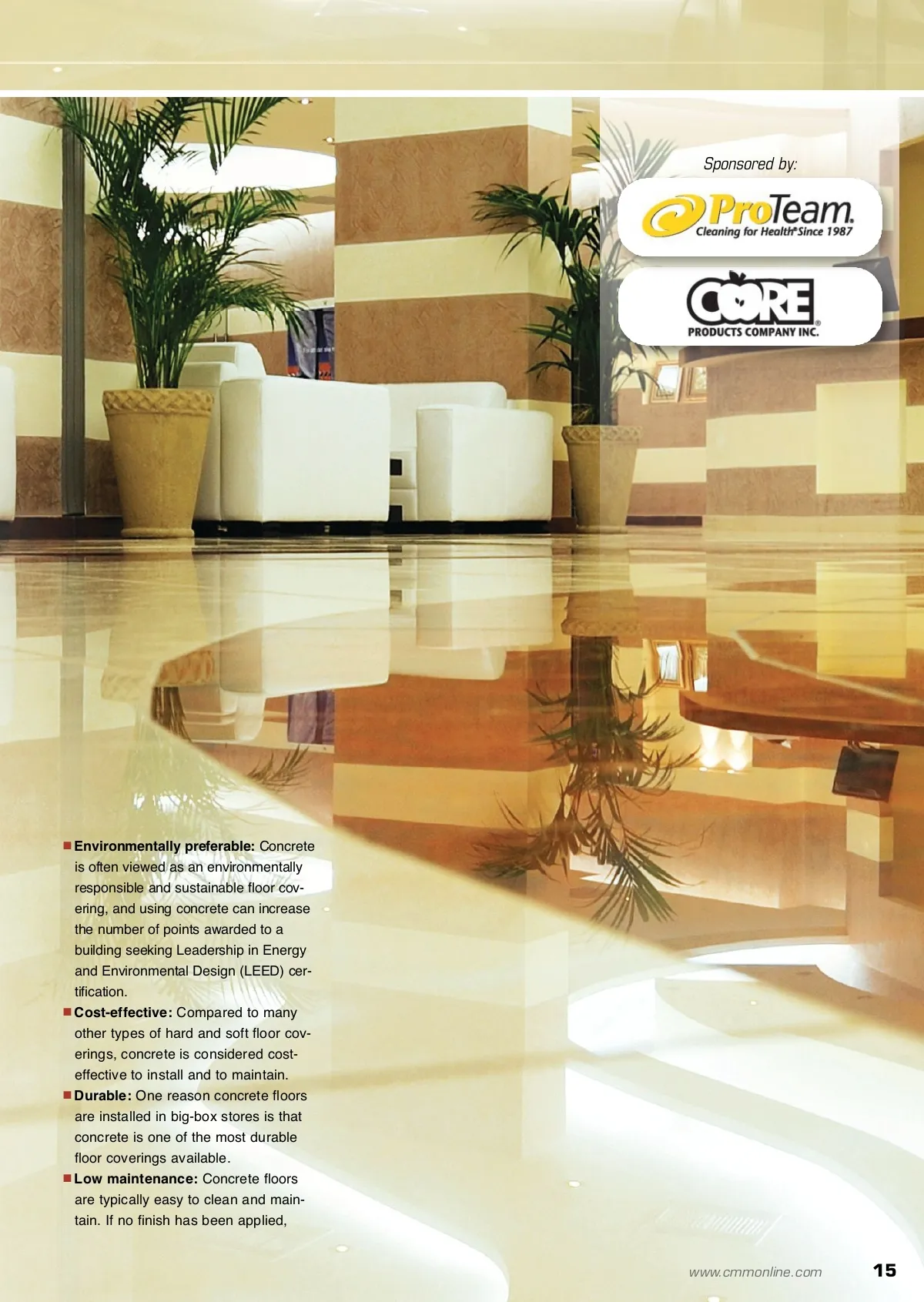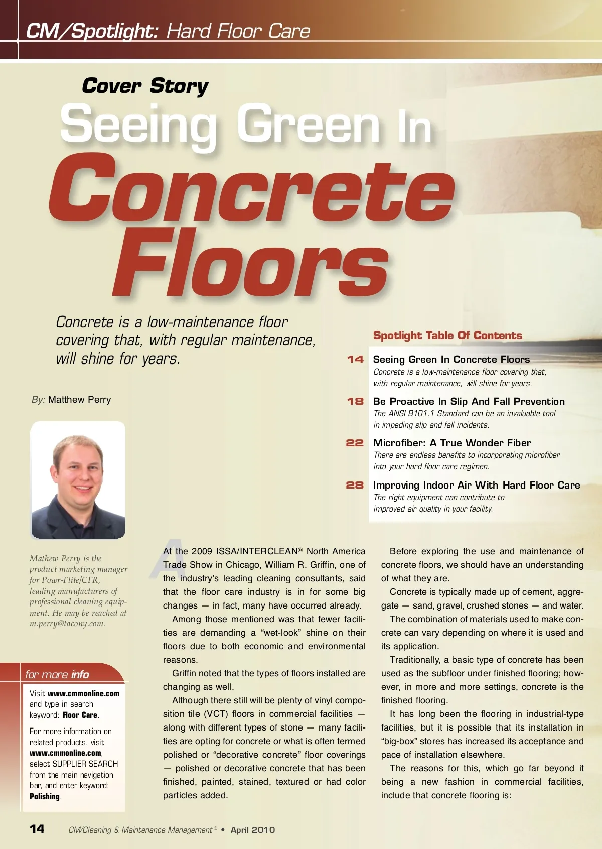 CM/Spotlight: Hard Floor Care Cover Story Concrete Floors Concrete is a low-maintenance floor covering that, with regular maintenance, will shine for years. Spotlight Table Of Contents 14 Seeing Green In Concrete Floors Concrete is a low-maintenance floor covering that, with regular maintenance, will shine for years. Seeing Green In By: Matthew Perry 18 Be Proactive In Slip And Fall Prevention The ANSI B101.1 Standard can be an invaluable tool in impeding slip and fall incidents. 22 Microfiber: A True Wonder Fiber There are endless benefits to incorporating microfiber into your hard floor care regimen. 28 Improving Indoor Air With Hard Floor Care The right equipment can contribute to improved air quality in your facility. Mathew Perry is the product marketing manager for Powr-Flite/CFR, leading manufacturers of professional cleaning equip-ment. He may be reached at [email protected]. A for more info Visit www.cmmonline.com and type in search keyword: Floor Care . For more information on related products, visit www.cmmonline.com , select SUPPLIER SEARCH from the main navigation bar, and enter keyword: Polishing . At the 2009 ISSA/INTERCLEAN ® North America Trade Show in Chicago, William R. Griffin, one of the industryʼs leading cleaning consultants, said that the floor care industry is in for some big changes — in fact, many have occurred already. Among those mentioned was that fewer facili-ties are demanding a “wet-look” shine on their floors due to both economic and environmental reasons. Griffin noted that the types of floors installed are changing as well. Although there still will be plenty of vinyl compo-sition tile (VCT) floors in commercial facilities — along with different types of stone — many facili-ties are opting for concrete or what is often termed polished or “decorative concrete” floor coverings — polished or decorative concrete that has been finished, painted, stained, textured or had color particles added. Before exploring the use and maintenance of concrete floors, we should have an understanding of what they are. Concrete is typically made up of cement, aggre-gate — sand, gravel, crushed stones — and water. The combination of materials used to make con-crete can vary depending on where it is used and its application. Traditionally, a basic type of concrete has been used as the subfloor under finished flooring; how-ever, in more and more settings, concrete is the finished flooring. It has long been the flooring in industrial-type facilities, but it is possible that its installation in “big-box” stores has increased its acceptance and pace of installation elsewhere. The reasons for this, which go far beyond it being a new fashion in commercial facilities, include that concrete flooring is: 14 CM/Cleaning & Maintenance Management ® • April 2010
