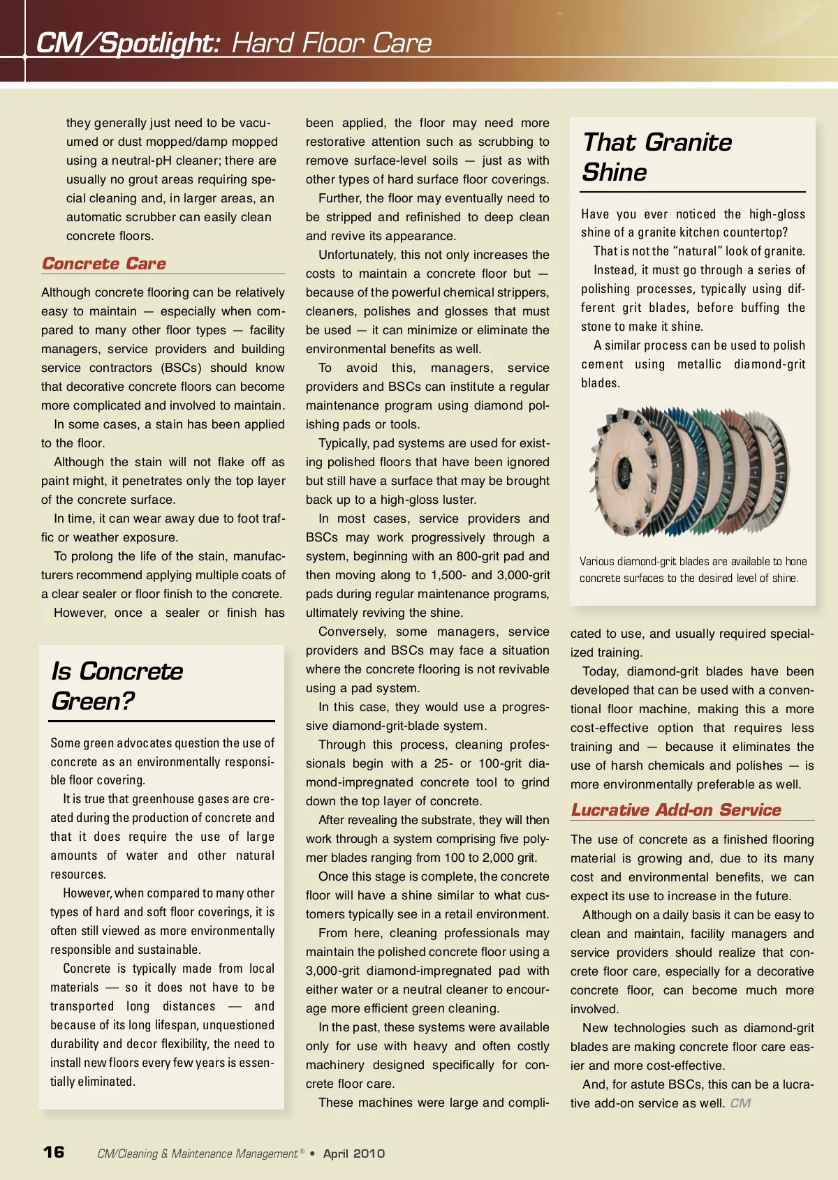CM/Spotlight: Hard Floor Care they generally just need to be vacu-umed or dust mopped/damp mopped using a neutral-pH cleaner; there are usually no grout areas requiring spe-cial cleaning and, in larger areas, an automatic scrubber can easily clean concrete floors. been applied, the floor may need more restorative attention such as scrubbing to remove surface-level soils — just as with other types of hard surface floor coverings. Further, the floor may eventually need to be stripped and refinished to deep clean and revive its appearance. Unfortunately, this not only increases the costs to maintain a concrete floor but — because of the powerful chemical strippers, cleaners, polishes and glosses that must be used — it can minimize or eliminate the environmental benefits as well. To avoid this, managers, service providers and BSCs can institute a regular maintenance program using diamond pol-ishing pads or tools. Typically, pad systems are used for exist-ing polished floors that have been ignored but still have a surface that may be brought back up to a high-gloss luster. In most cases, service providers and BSCs may work progressively through a system, beginning with an 800-grit pad and then moving along to 1,500-and 3,000-grit pads during regular maintenance programs, ultimately reviving the shine. Conversely, some managers, service providers and BSCs may face a situation where the concrete flooring is not revivable using a pad system. In this case, they would use a progres-sive diamond-grit-blade system. Through this process, cleaning profes-sionals begin with a 25-or 100-grit dia-mond-impregnated concrete tool to grind down the top layer of concrete. After revealing the substrate, they will then work through a system comprising five poly-mer blades ranging from 100 to 2,000 grit. Once this stage is complete, the concrete floor will have a shine similar to what cus-tomers typically see in a retail environment. From here, cleaning professionals may maintain the polished concrete floor using a 3,000-grit diamond-impregnated pad with either water or a neutral cleaner to encour-age more efficient green cleaning. In the past, these systems were available only for use with heavy and often costly machinery designed specifically for con-crete floor care. These machines were large and compli-That Granite Shine Have you ever noticed the high-gloss shine of a granite kitchen countertop? That is not the “natural” look of granite. Instead, it must go through a series of polishing processes, typically using dif-ferent grit blades, before buffing the stone to make it shine. A similar process can be used to polish cement using metallic diamond-grit blades. Concrete Care Although concrete flooring can be relatively easy to maintain — especially when com-pared to many other floor types — facility managers, service providers and building service contractors (BSCs) should know that decorative concrete floors can become more complicated and involved to maintain. In some cases, a stain has been applied to the floor. Although the stain will not flake off as paint might, it penetrates only the top layer of the concrete surface. In time, it can wear away due to foot traf-fic or weather exposure. To prolong the life of the stain, manufac-turers recommend applying multiple coats of a clear sealer or floor finish to the concrete. However, once a sealer or finish has Various diamond-grit blades are available to hone concrete surfaces to the desired level of shine. Is Concrete Green? Some green advocates question the use of concrete as an environmentally responsi-ble floor covering. It is true that greenhouse gases are cre-ated during the production of concrete and that it does require the use of large amounts of water and other natural resources. However, when compared to many other types of hard and soft floor coverings, it is often still viewed as more environmentally responsible and sustainable. Concrete is typically made from local materials — so it does not have to be transported long distances — and because of its long lifespan, unquestioned durability and decor flexibility, the need to install new floors every few years is essen-tially eliminated. cated to use, and usually required special-ized training. Today, diamond-grit blades have been developed that can be used with a conven-tional floor machine, making this a more cost-effective option that requires less training and — because it eliminates the use of harsh chemicals and polishes — is more environmentally preferable as well. Lucrative Add-on Service The use of concrete as a finished flooring material is growing and, due to its many cost and environmental benefits, we can expect its use to increase in the future. Although on a daily basis it can be easy to clean and maintain, facility managers and service providers should realize that con-crete floor care, especially for a decorative concrete floor, can become much more involved. New technologies such as diamond-grit blades are making concrete floor care eas-ier and more cost-effective. And, for astute BSCs, this can be a lucra-tive add-on service as well. CM 16 CM/Cleaning & Maintenance Management ® • April 2010