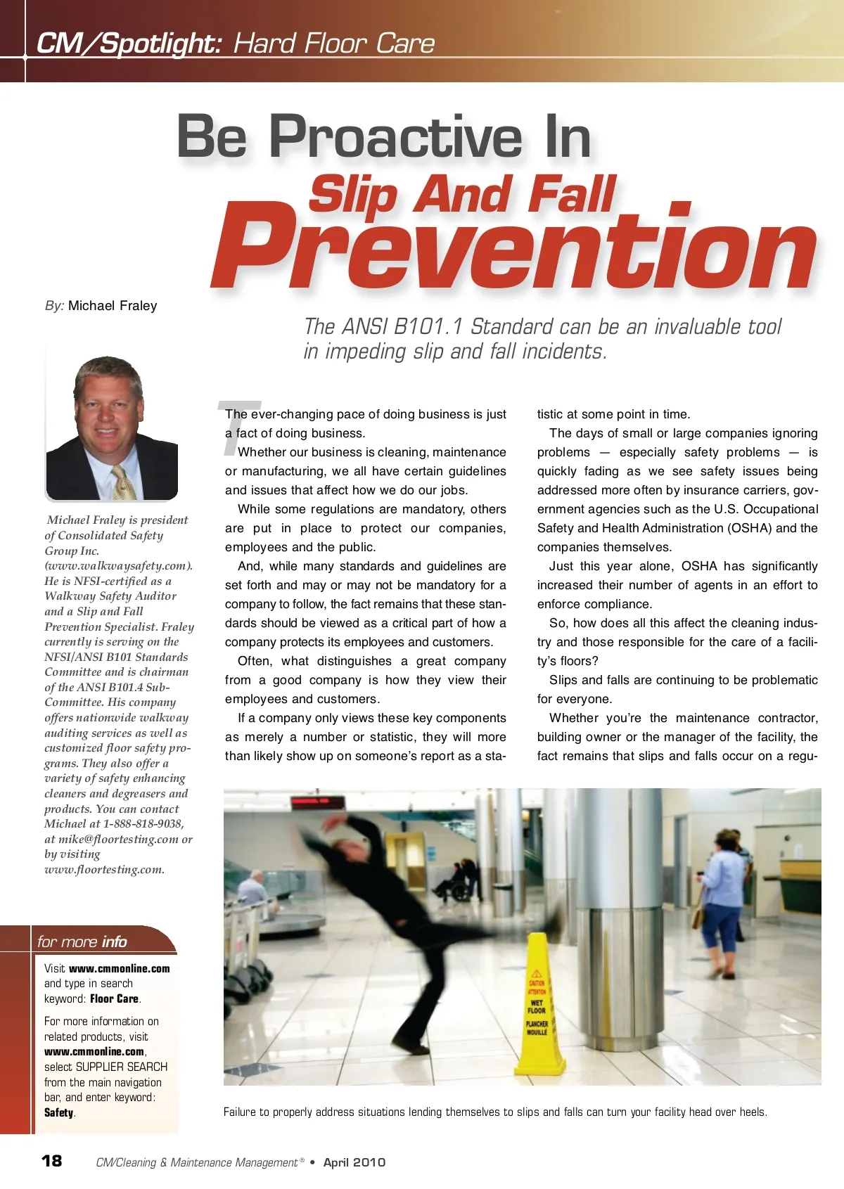 Be Proactive In By: Michael Fraley Prevention The ANSI B101.1 Standard can be an invaluable tool in impeding slip and fall incidents. Slip And Fall T Michael Fraley is president of Consolidated Safety Group Inc. (www.walkwaysafety.com). He is NFSI-certified as a Walkway Safety Auditor and a Slip and Fall Prevention Specialist. Fraley currently is serving on the NFSI/ANSI B101 Standards Committee and is chairman of the ANSI B101.4 Sub-Committee. His company offers nationwide walkway auditing services as well as customized floor safety pro-grams. They also offer a variety of safety enhancing cleaners and degreasers and products. You can contact Michael at 1-888-818-9038, at [email protected] or by visiting www.floortesting.com. The ever-changing pace of doing business is just a fact of doing business. Whether our business is cleaning, maintenance or manufacturing, we all have certain guidelines and issues that affect how we do our jobs. While some regulations are mandatory, others are put in place to protect our companies, employees and the public. And, while many standards and guidelines are set forth and may or may not be mandatory for a company to follow, the fact remains that these stan-dards should be viewed as a critical part of how a company protects its employees and customers. Often, what distinguishes a great company from a good company is how they view their employees and customers. If a company only views these key components as merely a number or statistic, they will more than likely show up on someoneʼs report as a sta-tistic at some point in time. The days of small or large companies ignoring problems — especially safety problems — is quickly fading as we see safety issues being addressed more often by insurance carriers, gov-ernment agencies such as the U.S. Occupational Safety and Health Administration (OSHA) and the companies themselves. Just this year alone, OSHA has significantly increased their number of agents in an effort to enforce compliance. So, how does all this affect the cleaning indus-try and those responsible for the care of a facili-tyʼs floors? Slips and falls are continuing to be problematic for everyone. Whether youʼre the maintenance contractor, building owner or the manager of the facility, the fact remains that slips and falls occur on a regu-for more info Visit www.cmmonline.com and type in search keyword: Floor Care . For more information on related products, visit www.cmmonline.com , select SUPPLIER SEARCH from the main navigation bar, and enter keyword: Safety . Failure to properly address situations lending themselves to slips and falls can turn your facility head over heels. 18 CM/Cleaning & Maintenance Management ® • April 2010