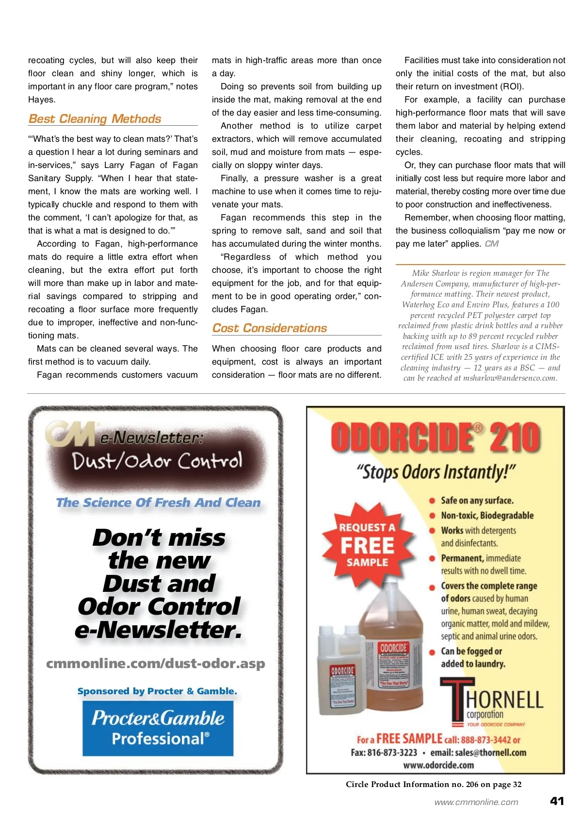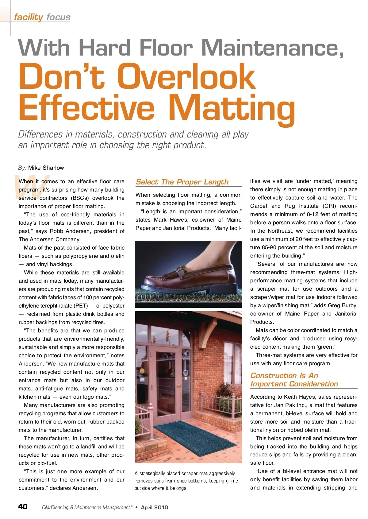 facility focus With Hard Floor Maintenance, Don’t Overlook Effective Matting Differences in materials, construction and cleaning all play an important role in choosing the right product. By: Mike Sharlow W When it comes to an effective floor care program, itʼs surprising how many building service contractors (BSCs) overlook the importance of proper floor matting. “The use of eco-friendly materials in todayʼs floor mats is different than in the past,” says Robb Andersen, president of The Andersen Company. Mats of the past consisted of face fabric fibers — such as polypropylene and olefin — and vinyl backings. While these materials are still available and used in mats today, many manufactur-ers are producing mats that contain recycled content with fabric faces of 100 percent poly-ethylene terephthalate (PET) — or polyester — reclaimed from plastic drink bottles and rubber backings from recycled tires. “The benefits are that we can produce products that are environmentally-friendly, sustainable and simply a more responsible choice to protect the environment,” notes Andersen. “We now manufacture mats that contain recycled content not only in our entrance mats but also in our outdoor mats, anti-fatigue mats, safety mats and kitchen mats — even our logo mats.” Many manufacturers are also promoting recycling programs that allow customers to return to their old, worn out, rubber-backed mats to the manufacturer. The manufacturer, in turn, certifies that these mats wonʼt go to a landfill and will be recycled for use in new mats, other prod-ucts or bio-fuel. “This is just one more example of our commitment to the environment and our customers,” declares Andersen. Select The Proper Length When selecting floor matting, a common mistake is choosing the incorrect length. “Length is an important consideration,” states Mark Hawes, co-owner of Maine Paper and Janitorial Products. “Many facil-ities we visit are ʻunder matted,ʼ meaning there simply is not enough matting in place to effectively capture soil and water. The Carpet and Rug Institute (CRI) recom-mends a minimum of 8-12 feet of matting before a person walks onto a floor surface. In the Northeast, we recommend facilities use a minimum of 20 feet to effectively cap-ture 85-90 percent of the soil and moisture entering the building.” “Several of our manufactures are now recommending three-mat systems: High-performance matting systems that include a scraper mat for use outdoors and a scraper/wiper mat for use indoors followed by a wiper/finishing mat,” adds Greg Burby, co-owner of Maine Paper and Janitorial Products. Mats can be color coordinated to match a facilityʼs décor and produced using recy-cled content making them ʻgreen.ʼ Three-mat systems are very effective for use with any floor care program. Construction Is An Important Consideration According to Keith Hayes, sales represen-tative for Jan Pak Inc., a mat that features a permanent, bi-level surface will hold and store more soil and moisture than a tradi-tional nylon or ribbed olefin mat. This helps prevent soil and moisture from being tracked into the building and helps reduce slips and falls by providing a clean, safe floor. “Use of a bi-level entrance mat will not only benefit facilities by saving them labor and materials in extending stripping and A strategically placed scraper mat aggressively removes soils from shoe bottoms, keeping grime outside where it belongs. 40 CM/Cleaning & Maintenance Management ® • April 2010