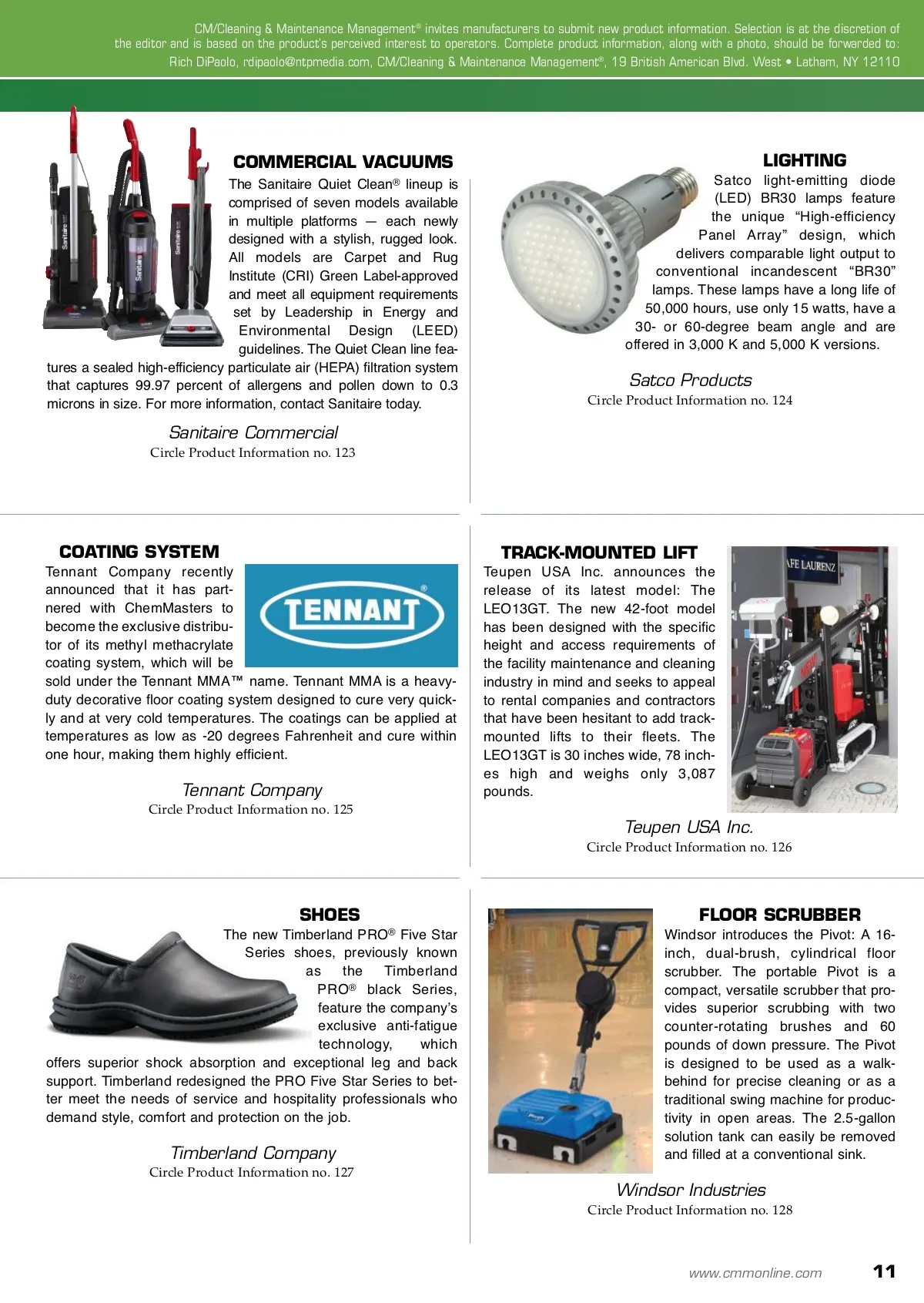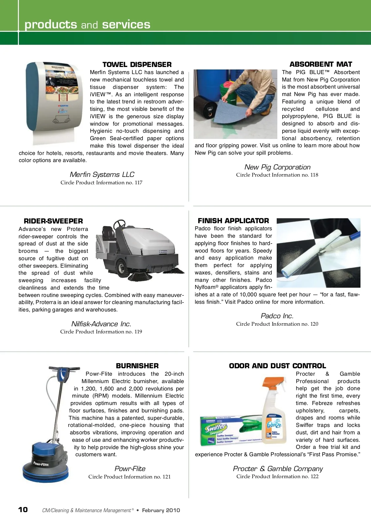 products and services TOWEL DISPENSER Merfin Systems LLC has launched a new mechanical touchless towel and tissue dispenser system: The iVIEW™. As an intelligent response to the latest trend in restroom adver-tising, the most visible benefit of the iVIEW is the generous size display window for promotional messages. Hygienic no-touch dispensing and Green Seal-certified paper options make this towel dispenser the ideal choice for hotels, resorts, restaurants and movie theaters. Many color options are available. ABSORBENT MAT The PIG BLUE™ Absorbent Mat from New Pig Corporation is the most absorbent universal mat New Pig has ever made. Featuring a unique blend of recycled cellulose and polypropylene, PIG BLUE is designed to absorb and dis-perse liquid evenly with excep-tional absorbency, retention and floor gripping power. Visit us online to learn more about how New Pig can solve your spill problems. New Pig Corporation Merfin Systems LLC Circle Product Information no. 117 Circle Product Information no. 118 RIDER-SWEEPER Advanceʼs new Proterra rider-sweeper controls the spread of dust at the side brooms — the biggest source of fugitive dust on other sweepers. Eliminating the spread of dust while sweeping increases facility cleanliness and extends the time between routine sweeping cycles. Combined with easy maneuver-ability, Proterra is an ideal answer for cleaning manufacturing facil-ities, parking garages and warehouses. FINISH APPLICATOR Padco floor finish applicators have been the standard for applying floor finishes to hard-wood floors for years. Speedy and easy application make them perfect for applying waxes, densifiers, stains and many other finishes. Padco Nylfoam ® applicators apply fin-ishes at a rate of 10,000 square feet per hour — “for a fast, flaw-less finish.” Visit Padco online for more information. Padco Inc. Nilfisk-Advance Inc. Circle Product Information no. 119 Circle Product Information no. 120 BURNISHER Powr-Flite introduces the 20-inch Millennium Electric burnisher, available in 1,200, 1,600 and 2,000 revolutions per minute (RPM) models. Millennium Electric provides optimum results with all types of floor surfaces, finishes and burnishing pads. This machine has a patented, super-durable, rotational-molded, one-piece housing that absorbs vibrations, improving operation and ease of use and enhancing worker productiv-ity to help provide the high-gloss shine your customers want. ODOR AND DUST CONTROL Procter & Gamble Professional products help get the job done right the first time, every time. Febreze refreshes upholstery, carpets, drapes and rooms while Swiffer traps and locks dust, dirt and hair from a variety of hard surfaces. Order a free trial kit and experience Procter & Gamble Professionalʼs “First Pass Promise.” Powr-Flite Circle Product Information no. 121 Procter & Gamble Company Circle Product Information no. 122 10 CM/Cleaning & Maintenance Management ® • February 2010