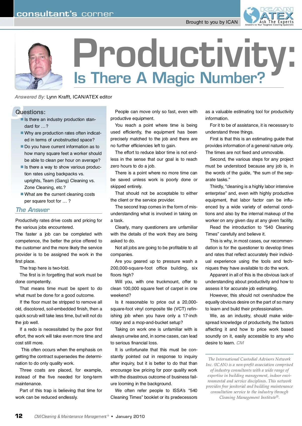 consultant’s corner Brought to you by ICAN Productivity: Is There A Magic Number? People can move only so fast, even with productive equipment. You reach a point where time is being used efficiently, the equipment has been precisely matched to the job and there are no further efficiencies left to gain. The effort to reduce labor time is not end-less in the sense that our goal is to reach zero hours to do a job. There is a point where no more time can be saved unless work is poorly done or skipped entirely. That should not be acceptable to either the client or the service provider. The second trap comes in the form of mis-understanding what is involved in taking on a task. Clearly, many questioners are unfamiliar with the details of the work they are being asked to do. Not all jobs are going to be profitable to all companies. Are you geared up to pressure wash a 200,000-square-foot office building, six floors high? Will you, with one truckmount, offer to clean 100,000 square feet of carpet in one weekend? Is it reasonable to price out a 20,000-square-foot vinyl composite tile (VCT) refin-ishing job when you have only a 17-inch rotary and a mop-and-bucket setup? Taking on work one is unfamiliar with is always unwise and, in some cases, can lead to serious financial loss. It is unfortunate that this must be con-stantly pointed out in response to inquiry after inquiry, but it is better to do that than encourage low pricing for poor quality work with the disastrous outcome of business fail-ure looming in the background. We often refer people to ISSAʼs “540 Cleaning Times” booklet or its predecessors Answered By: Lynn Krafft, ICAN/ATEX editor Q Questions: Is there an industry production stan-dard for …? Why are production rates often indicat-ed in terms of unobstructed space? Do you have current information as to how many square feet a worker should be able to clean per hour on average? Is there a way to show various produc-tion rates using backpacks vs. uprights, Team (Gang) Cleaning vs. Zone Cleaning, etc.? What are the current cleaning costs per square foot for … ? The Answer Productivity rates drive costs and pricing for the various jobs encountered. The faster a job can be completed with competence, the better the price offered to the customer and the more likely the service provider is to be assigned the work in the first place. The trap here is two-fold. The first is in forgetting that work must be done competently. That means time must be spent to do what must be done for a good outcome. If the floor must be stripped to remove all old, discolored, soil-embedded finish, then a quick scrub will take less time, but will not do the job well. If a redo is necessitated by the poor first effort, the work will take even more time and cost still more. This often occurs when the emphasis on getting the contract supersedes the determi-nation to do only quality work. Three coats are placed, for example, instead of the five needed for long-term maintenance. Part of this trap is believing that time for work can be reduced endlessly. as a valuable estimating tool for productivity information. For it to be of assistance, it is necessary to understand three things. First is that this is an estimating guide that provides information of a general nature only. The times are not fixed and unmovable. Second, the various steps for any project must be understood because any job is, in the words of the guide, “the sum of the sep-arate tasks.” Thirdly, “cleaning is a highly labor intensive enterprise” and, even with highly productive equipment, that labor factor can be influ-enced by a wide variety of external condi-tions and also by the internal makeup of the worker on any given day at any given facility. Read the introduction to “540 Cleaning Times” carefully and believe it. This is why, in most cases, our recommen-dation is for the questioner to develop times and rates that reflect accurately their individ-ual experience using the tools and tech-niques they have available to do the work. Apparent in all of this is the obvious lack of understanding about productivity and how to assess it for accurate job estimating. However, this should not overshadow the equally obvious desire on the part of so many to learn and build their professionalism. We, as an industry, should make wide-spread knowledge of productivity, the factors affecting it and how to price work based soundly on it, easily accessible to any who desire to learn. CM The International Custodial Advisors Network Inc. (ICAN) is a non-profit association comprised of industry consultants with a wide range of expertise in building management, indoor envi-ronmental and service disciplines. This network provides free janitorial and building maintenance consultation service to the industry through Cleaning Management Institute ® . 12 CM/Cleaning & Maintenance Management ® • January 2010
