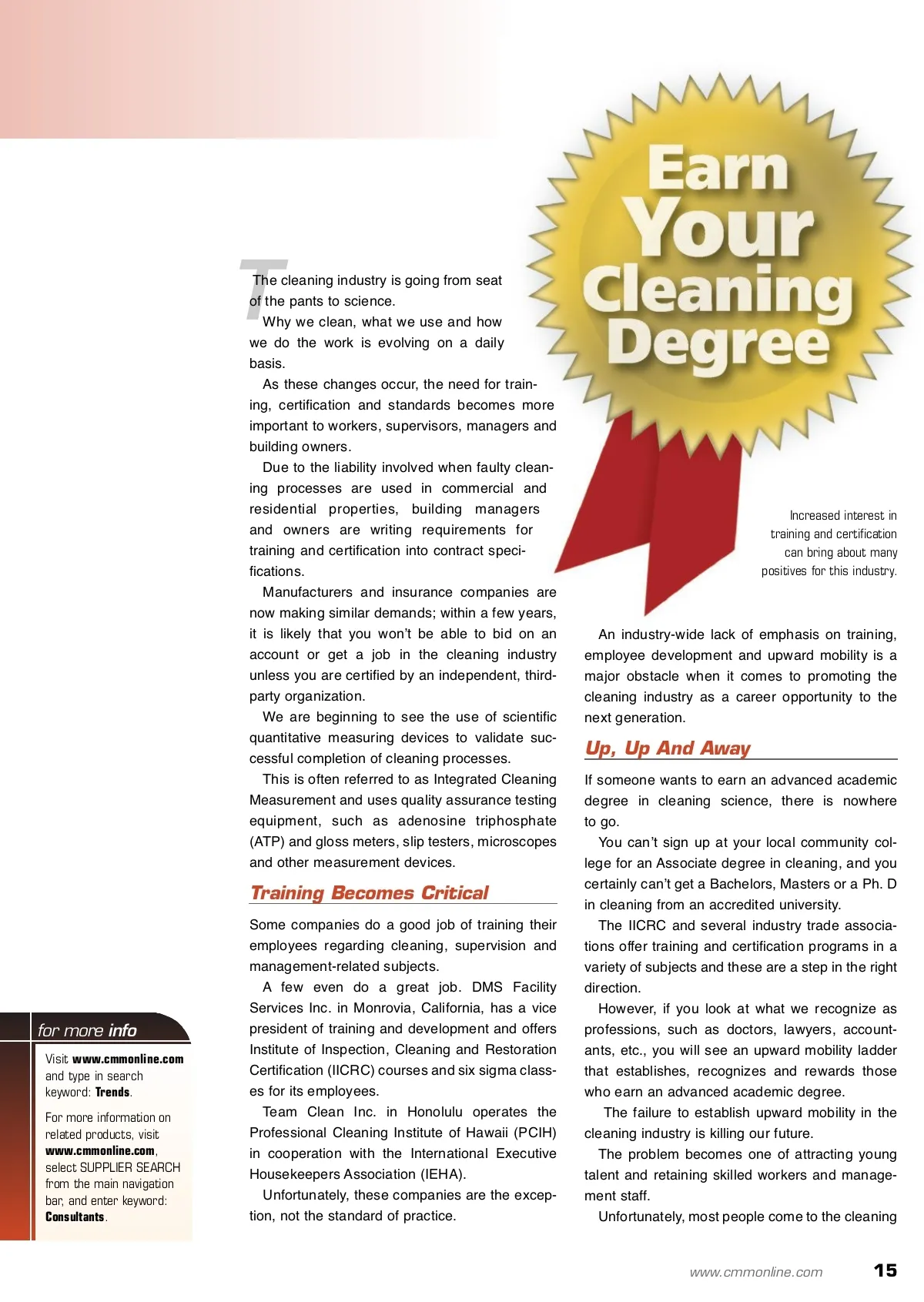 Raising The Bar With Science,Training And Upward Mobility Insider offers ways for cleaning professionals to earn a degree in this field. By: Wm R. Griffin Wm R. Griffin is the presi-dent of Cleaning Consultant Services Inc. For more information, please visit www.cleaning-consultants.com. Cover Story