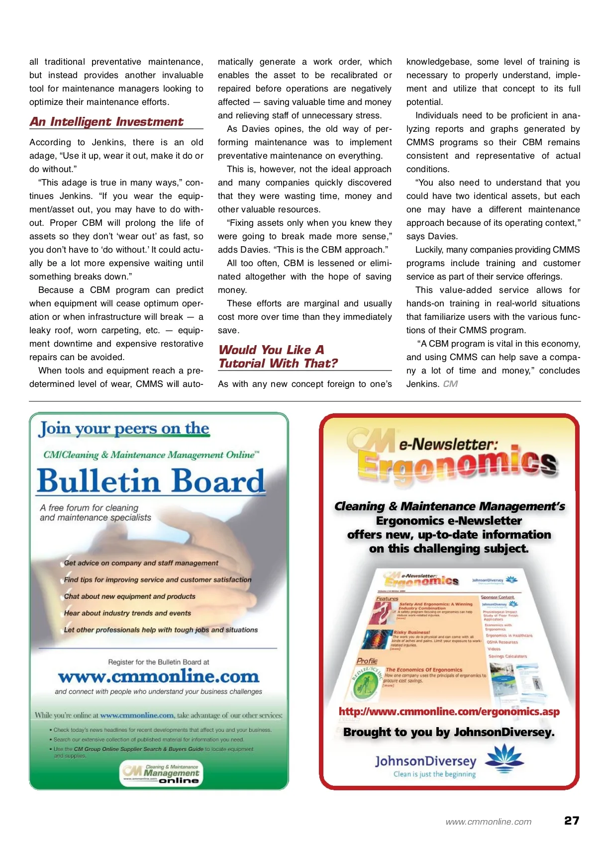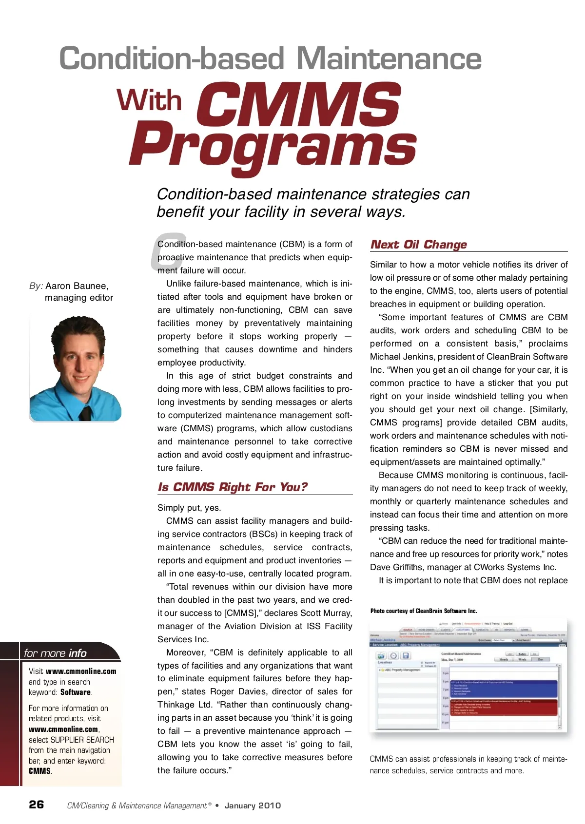 Condition-based Maintenance With CMMS Programs Condition-based maintenance strategies can benefit your facility in several ways. C By: Aaron Baunee, managing editor Condition-based maintenance (CBM) is a form of proactive maintenance that predicts when equip-ment failure will occur. Unlike failure-based maintenance, which is ini-tiated after tools and equipment have broken or are ultimately non-functioning, CBM can save facilities money by preventatively maintaining property before it stops working properly — something that causes downtime and hinders employee productivity. In this age of strict budget constraints and doing more with less, CBM allows facilities to pro-long investments by sending messages or alerts to computerized maintenance management soft-ware (CMMS) programs, which allow custodians and maintenance personnel to take corrective action and avoid costly equipment and infrastruc-ture failure. Next Oil Change Similar to how a motor vehicle notifies its driver of low oil pressure or of some other malady pertaining to the engine, CMMS, too, alerts users of potential breaches in equipment or building operation. “Some important features of CMMS are CBM audits, work orders and scheduling CBM to be performed on a consistent basis,” proclaims Michael Jenkins, president of CleanBrain Software Inc. “When you get an oil change for your car, it is common practice to have a sticker that you put right on your inside windshield telling you when you should get your next oil change. [Similarly, CMMS programs] provide detailed CBM audits, work orders and maintenance schedules with noti-fication reminders so CBM is never missed and equipment/assets are maintained optimally.” Because CMMS monitoring is continuous, facil-ity managers do not need to keep track of weekly, monthly or quarterly maintenance schedules and instead can focus their time and attention on more pressing tasks. “CBM can reduce the need for traditional mainte-nance and free up resources for priority work,” notes Dave Griffiths, manager at CWorks Systems Inc. It is important to note that CBM does not replace Is CMMS Right For You? Simply put, yes. CMMS can assist facility managers and build-ing service contractors (BSCs) in keeping track of maintenance schedules, service contracts, reports and equipment and product inventories — all in one easy-to-use, centrally located program. “Total revenues within our division have more than doubled in the past two years, and we cred-it our success to [CMMS],” declares Scott Murray, manager of the Aviation Division at ISS Facility Services Inc. Moreover, “CBM is definitely applicable to all types of facilities and any organizations that want to eliminate equipment failures before they hap-pen,” states Roger Davies, director of sales for Thinkage Ltd. “Rather than continuously chang-ing parts in an asset because you ʻthinkʼ it is going to fail — a preventive maintenance approach — CBM lets you know the asset ʻisʼ going to fail, allowing you to take corrective measures before the failure occurs.” Photo courtesy of CleanBrain Software Inc. for more info Visit www.cmmonline.com and type in search keyword: Software . For more information on related products, visit www.cmmonline.com , select SUPPLIER SEARCH from the main navigation bar, and enter keyword: CMMS . CMMS can assist professionals in keeping track of mainte-nance schedules, service contracts and more. 26 CM/Cleaning & Maintenance Management ® • January 2010