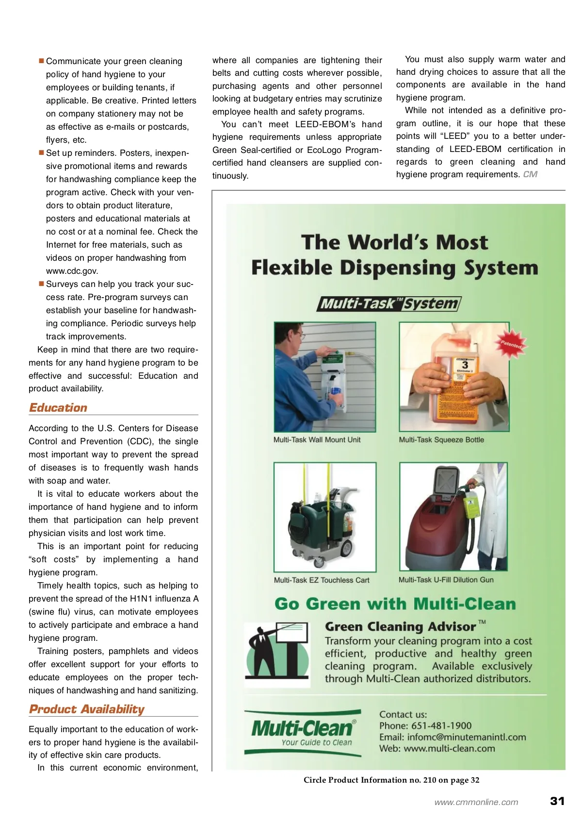 Mis-LEEDing Info Made Clear By: Armand Coppotelli Understanding hand hygiene as it applies to green cleaning. Recently, a sales representative was informed by a distributor that a manufacturer promised the distributorʼs customer they could gain 10 points toward their Leadership in Energy and Environmental Design-Existing Buildings (LEED-EB) certification program just by purchasing his companyʼs hand cleaners. However, the obvious key point to green clean-ing in regards to hand cleansers and sanitizers is the development, promotion and improvement of a hand hygiene program throughout the facility. R Armand Coppotelli is the senior technical manager for STOKO ® Skin Care. Armand has over 25 years experience and has lectured in American Industrial Health Council (AIHC) roundtables and has served as AIHA section guest speaker. He has also hosted presentations on overcom-ing work-related skin der-matitis for many occupa-tional medicine/nursing organizations. He has implemented corporate skin care programs for large scale manufacturing opera-tions. He is a full member of the American Industrial Hygiene Association (AIHA) and has served on its Protective Clothing and Equipment Committee in recent years. How Would A Facility Create Such A Program? Here are some suggestions: Designate a project leader who can then assemble a committee to assist with the pro-gram implementation. Walk through your building, noting restrooms. Are the basics for hand hygiene supplied, such as warm water, cleanser, paper towels or air drying devices? Note any areas that need upgrading. Do the same with common areas, such as shared wash stations on the work floor or break rooms. Finally, check individual or personal spaces, such as offices, cubicles and confer-ence rooms. These are good locations for alcohol-based hand sanitizer. Time To Clear Up Confusion There seems to be confusion and misinformation about the role of hand cleansers and sanitizers in regards to the U.S. Green Building Councilʼs (USGBC) Leadership in Energy and Environmental Design for Existing Buildings: Operations and Maintenance (LEED-EBOM) cer-tification program. LEED-EBOM certification is based upon meeting and maintaining performance standards for sus-tainable, ongoing operations of existing buildings. The standards include, for example, mainte-nance programs of a buildingʼs exterior and site and efficiently using water and energy. One of the standardʼs concerns is green clean-ing programs. Included in the green cleaning program is the following statement: “Development of strategies for promoting and improving hand hygiene, including both handwashing and the use of alco-hol-based waterless hand sanitizers.” Other specifications for hand hygiene products state that the products contain no antimicrobial agents, except as a preservative (exceptions: Where required by health codes and other regu-lations, such as food service areas and health care requirements); additionally, that products are certified under Green Seal Inc.ʼs Environmental Standard for Hand Cleaners and Hand Soaps Used for Industrial and Institutional Purposes (GS-41) or TerraChoice Environmental Marketingʼs Standard for Industrial & Institutional Hand Cleaners (CCD-104), as offered through their EcoLogo Program. for more info Visit www.cmmonline.com and type in search keyword: Infection Control . For more information on related products, visit www.cmmonline.com , select SUPPLIER SEARCH from the main navigation bar, and enter keyword: Restroom . Confusion in the marketplace regarding LEED-EBOM and hand hygiene are washing away good intentions of end users. 30 CM/Cleaning & Maintenance Management ® • January 2010