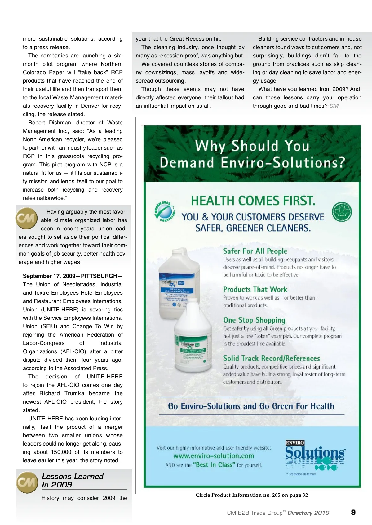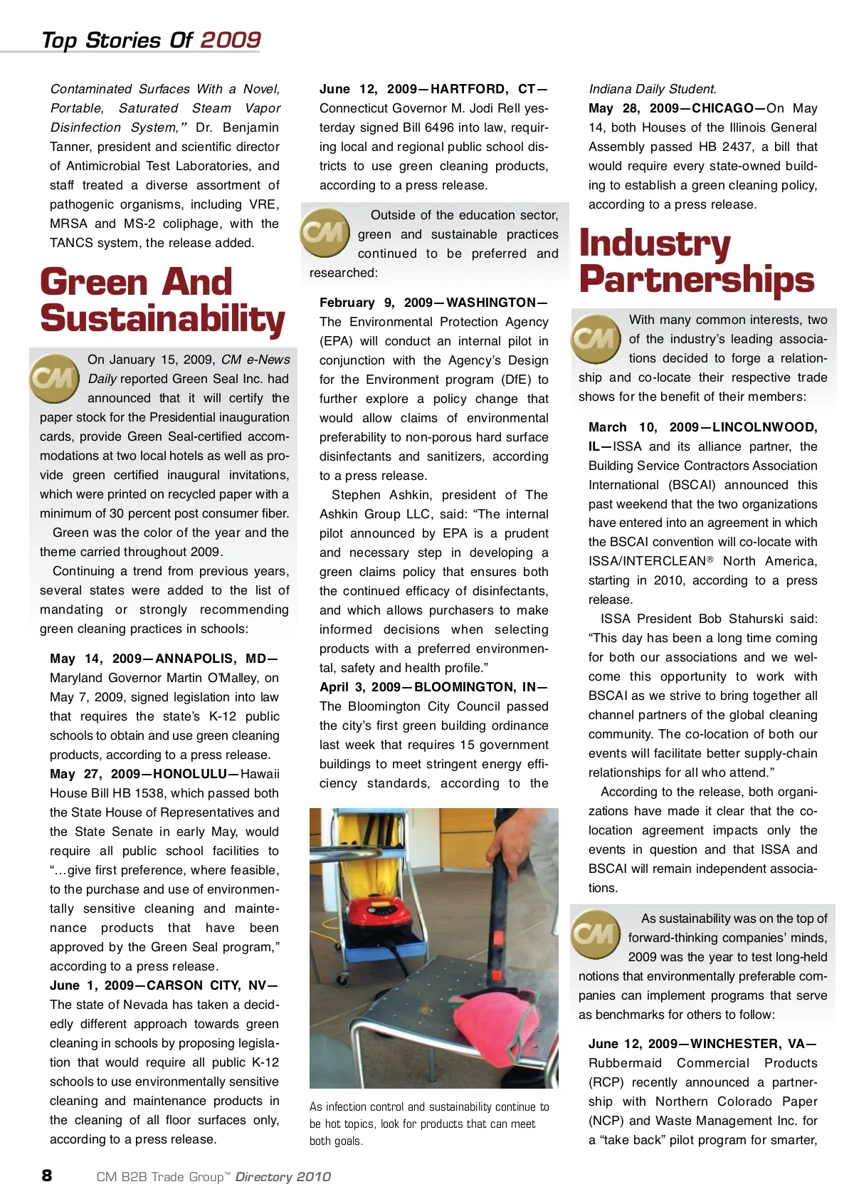 Top Stories Of 2009 Contaminated Surfaces With a Novel, Portable, Saturated Steam Vapor Disinfection System, ” Dr. Benjamin Tanner, president and scientific director of Antimicrobial Test Laboratories, and staff treated a diverse assortment of pathogenic organisms, including VRE, MRSA and MS-2 coliphage, with the TANCS system, the release added. June 12, 2009—HARTFORD, CT— Connecticut Governor M. Jodi Rell yes-terday signed Bill 6496 into law, requir-ing local and regional public school dis-tricts to use green cleaning products, according to a press release. Outside of the education sector, green and sustainable practices continued to be preferred and researched: February 9, 2009—WASHINGTON— The Environmental Protection Agency (EPA) will conduct an internal pilot in conjunction with the Agencyʼs Design for the Environment program (DfE) to further explore a policy change that would allow claims of environmental preferability to non-porous hard surface disinfectants and sanitizers, according to a press release. Stephen Ashkin, president of The Ashkin Group LLC, said: “The internal pilot announced by EPA is a prudent and necessary step in developing a green claims policy that ensures both the continued efficacy of disinfectants, and which allows purchasers to make informed decisions when selecting products with a preferred environmen-tal, safety and health profile.” April 3, 2009—BLOOMINGTON, IN— The Bloomington City Council passed the cityʼs first green building ordinance last week that requires 15 government buildings to meet stringent energy effi-ciency standards, according to the Indiana Daily Student . May 28, 2009—CHICAGO— On May 14, both Houses of the Illinois General Assembly passed HB 2437, a bill that would require every state-owned build-ing to establish a green cleaning policy, according to a press release. Green And Sustainability On January 15, 2009, CM e-News Daily reported Green Seal Inc. had announced that it will certify the paper stock for the Presidential inauguration cards, provide Green Seal-certified accom-modations at two local hotels as well as pro-vide green certified inaugural invitations, which were printed on recycled paper with a minimum of 30 percent post consumer fiber. Green was the color of the year and the theme carried throughout 2009. Continuing a trend from previous years, several states were added to the list of mandating or strongly recommending green cleaning practices in schools: May 14, 2009—ANNAPOLIS, MD— Maryland Governor Martin OʼMalley, on May 7, 2009, signed legislation into law that requires the stateʼs K-12 public schools to obtain and use green cleaning products, according to a press release. May 27, 2009—HONOLULU— Hawaii House Bill HB 1538, which passed both the State House of Representatives and the State Senate in early May, would require all public school facilities to “…give first preference, where feasible, to the purchase and use of environmen-tally sensitive cleaning and mainte-nance products that have been approved by the Green Seal program,” according to a press release. June 1, 2009—CARSON CITY, NV— The state of Nevada has taken a decid-edly different approach towards green cleaning in schools by proposing legisla-tion that would require all public K-12 schools to use environmentally sensitive cleaning and maintenance products in the cleaning of all floor surfaces only, according to a press release. Industry Partnerships With many common interests, two of the industryʼs leading associa-tions decided to forge a relation-ship and co-locate their respective trade shows for the benefit of their members: March 10, 2009—LINCOLNWOOD, IL— ISSA and its alliance partner, the Building Service Contractors Association International (BSCAI) announced this past weekend that the two organizations have entered into an agreement in which the BSCAI convention will co-locate with ISSA/INTERCLEAN ® North America, starting in 2010, according to a press release. ISSA President Bob Stahurski said: “This day has been a long time coming for both our associations and we wel-come this opportunity to work with BSCAI as we strive to bring together all channel partners of the global cleaning community. The co-location of both our events will facilitate better supply-chain relationships for all who attend.” According to the release, both organi-zations have made it clear that the co-location agreement impacts only the events in question and that ISSA and BSCAI will remain independent associa-tions. As sustainability was on the top of forward-thinking companiesʼ minds, 2009 was the year to test long-held notions that environmentally preferable com-panies can implement programs that serve as benchmarks for others to follow: June 12, 2009—WINCHESTER, VA— Rubbermaid Commercial Products (RCP) recently announced a partner-ship with Northern Colorado Paper (NCP) and Waste Management Inc. for a “take back” pilot program for smarter, As infection control and sustainability continue to be hot topics, look for products that can meet both goals. 8 CM B2B Trade Group ™ Directory 2010