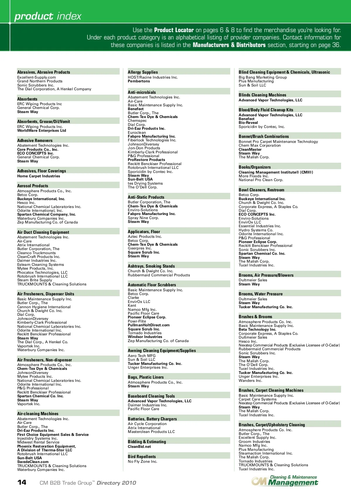 product index Use the Product Locator on pages 6 & 8 to find the merchandise you’re looking for. Under each product category is an alphabetical listing of provider companies. Contact information for these companies is listed in the Manufacturers & Distributors section, starting on page 36. Abrasives, Abrasive Products Excellent-Supply.com Grand Northern Products Sonic Scrubbers Inc. The Dial Corporation, A Henkel Company Allergy Supplies HOST/Racine Industries Inc. Pembertons Blind Cleaning Equipment & Chemicals, Ultrasonic Big Bang Marketing Group Plus Manufacturing Sun & Soil LLC Anti-microbials Abatement Technologies Inc. Air-Care Basic Maintenance Supply Inc. Benefect Butler Corp., The Chem-Tex Dye & Chemicals Chemspec Dial Corp. Dri-Eaz Products Inc. Euroclean Fabpro Manufacturing Inc. Fiberlock Technologies Inc. JohnsonDiversey Jon-Don Products Kimberly-Clark Professional P&G Professional ProRestore Products Reckitt Benckiser Professional Rotobrush International LLC Sporicidin by Contec Inc. Steam Way Sun-Belt USA tes Drying Systems The O'Dell Corp. Absorbents ERC Wiping Products Inc General Chemical Corp. Steam Way Blinds Cleaning Machines Advanced Vapor Technologies, LLC Blood/Body Fluid Cleanup Kits Advanced Vapor Technologies, LLC Benefect Bio-Reveal Sporicidin by Contec, Inc. Absorbents, Grease/Oil/Vomit ERC Wiping Products Inc. WorldWare Enterprises Ltd Adhesive Removers Abatement Technologies Inc. Core Products Co., Inc. ECO CONCEPTS Inc. General Chemical Corp. Steam Way Bonnet/Brush Combinations Bonnet Pro Carpet Maintenance Technology Chem Max Corporation CleanMaster Steam Way The Malish Corp. Adhesives, Floor Coverings Home Carpet Industries Books/Organizers Cleaning Management Institute® (CMI®) More Floods Inc. National Pro Clean Corp. Aerosol Products Atmosphere Products Co., Inc. Betco Corp. Buckeye International, Inc. Hesco Inc. National Chemical Laboratories Inc. Odorite International, Inc. Spartan Chemical Company, Inc. Waterbury Companies Inc. Zep Manufacturing Co. of Canada Bowl Cleaners, Restroom Betco Corp. Buckeye International Inc. Church & Dwight Co. Inc. Corporate Express, A Staples Co. Dial Corp. ECO CONCEPTS Inc. Enviro-Solutions EnvirOx LLC Essential Industries Inc. Hydro Systems Co. Odorite International Inc. P&G Professional Pioneer Eclipse Corp. Reckitt Benckiser Professional Sonic Scrubbers Inc. Spartan Chemical Co. Inc. Steam Way The Malish Corp. Tucel Industries Inc. Anti-Static Products Butler Corporation, The Chem-Tex Dye & Chemicals Enviro-Solutions Fabpro Manufacturing Inc. Spray Nine Corp. Steam Way Air Duct Cleaning Equipment Abatement Technologies Inc. Air-Care Atrix International Butler Corporation, The Cleanco Truckmounts CleanCraft Products Inc. Daimer Industries Inc. Esteam Cleaning Systems Mytee Products, Inc. Phocatox Technologies, LLC Rotobrush International LLC Steam Brite Supply TRUCKMOUNTS & Cleaning Solutions Applicators, Floor Aztec Products Inc. Betco Corp. Chem-Tex Dye & Chemicals Geerpres Inc. Square Scrub Inc. Steam Way Ashtrays, Smoking Stands Church & Dwight Co. Inc. Rubbermaid Commercial Products Brooms, Air Pressure/Blowers Dultmeier Sales Steam Way Automatic Floor Scrubbers Basic Maintenance Supply Inc. Betco Corp. Clarke EnvirOx LLC Kent Namco Mfg Inc. Pacific Floor Care Pioneer Eclipse Corp. Powr-Flite PullmanHoltDirect.com Square Scrub Inc. Tornado Industries Windsor Industries Zep Manufacturing Co. of Canada Air Fresheners, Dispenser Units Basic Maintenance Supply Inc. Butler Corp., The Cannon Hygiene International Church & Dwight Co. Inc. Dial Corp. JohnsonDiversey Kimberly-Clark Professional National Chemical Laboratories Inc. Odorite International Inc. Reckitt Benckiser Professional Steam Way The Dial Corp., A Henkel Co. Vaportek Inc. Waterbury Companies Inc. Brooms, Water Pressure Dultmeier Sales Steam Way Tucker Manufacturing Co. Inc. Brushes & Brooms Atmosphere Products Co. Inc. Basic Maintenance Supply Inc. Beta Technology Inc. Corporate Express, A Staples Co. Dultmeier Sales Hesco Inc. Nexstep Commercial Products (Exclusive Licensee of O-Cedar) Rubbermaid Commercial Products Sonic Scrubbers Inc. Steam Way The Malish Corp. The O'Dell Corp. Tucel Industries Inc. Tucker Manufacturing Co. Inc. Unger Enterprises Inc. Wanders Inc. Awning Cleaning Equipment/Supplies Aero Tech MFG Sun & Soil LLC Tucker Manufacturing Co. Inc. Unger Enterprises Inc. Air Fresheners, Non-dispenser Atmosphere Products Co., Inc. Chem-Tex Dye & Chemicals JohnsonDiversey Mytee Products Inc. National Chemical Laboratories Inc. Odorite International Inc. P&G Professional Reckitt Benckiser Professional Spartan Chemical Co. Inc. Steam Way Vaportek Inc. Bags, Plastic Liners Atmosphere Products Co., Inc. Steam Way Brushes, Carpet Cleaning Machines Baseboard Cleaning Tools Advanced Vapor Technologies, LLC Daimer Industries Inc. Pacific Floor Care Basic Maintenance Supply Inc. Carpet Care Systems Nexstep Commercial Products (Exclusive Licensee of O-Cedar) Steam Way The Malish Corp. Tucel Industries Inc. Air-cleaning Machines Abatement Technologies Inc. Air-Care Butler Corp., The Dri-Eaz Products Inc. First Choice Equipment Sales & Service Injectidry Systems Inc. Midwest Rental Service Phoenix Restoration Equipment, A Division of Therma-Stor LLC Rotobrush International LLC Sun-Belt USA SwedeClean.com TRUCKMOUNTS & Cleaning Solutions Waterbury Companies Inc. Batteries, Battery Chargers Air Cycle Corporation Atrix International Masterclean Products LLC Brushes, Carpet/Upholstery Cleaning Atmosphere Products Co. Inc. Butler Corp., The Excellent Supply Inc. Groom Industries Namco Mfg Inc. Plus Manufacturing Steamaction International Inc. The Malish Corp. Tornado Industries TRUCKMOUNTS & Cleaning Solutions Tucel Industries Inc. Bidding & Estimating CleanBid.net Bird Repellents No Fly Zone Inc. 14 CM B2B Trade Group ™ Directory 2010