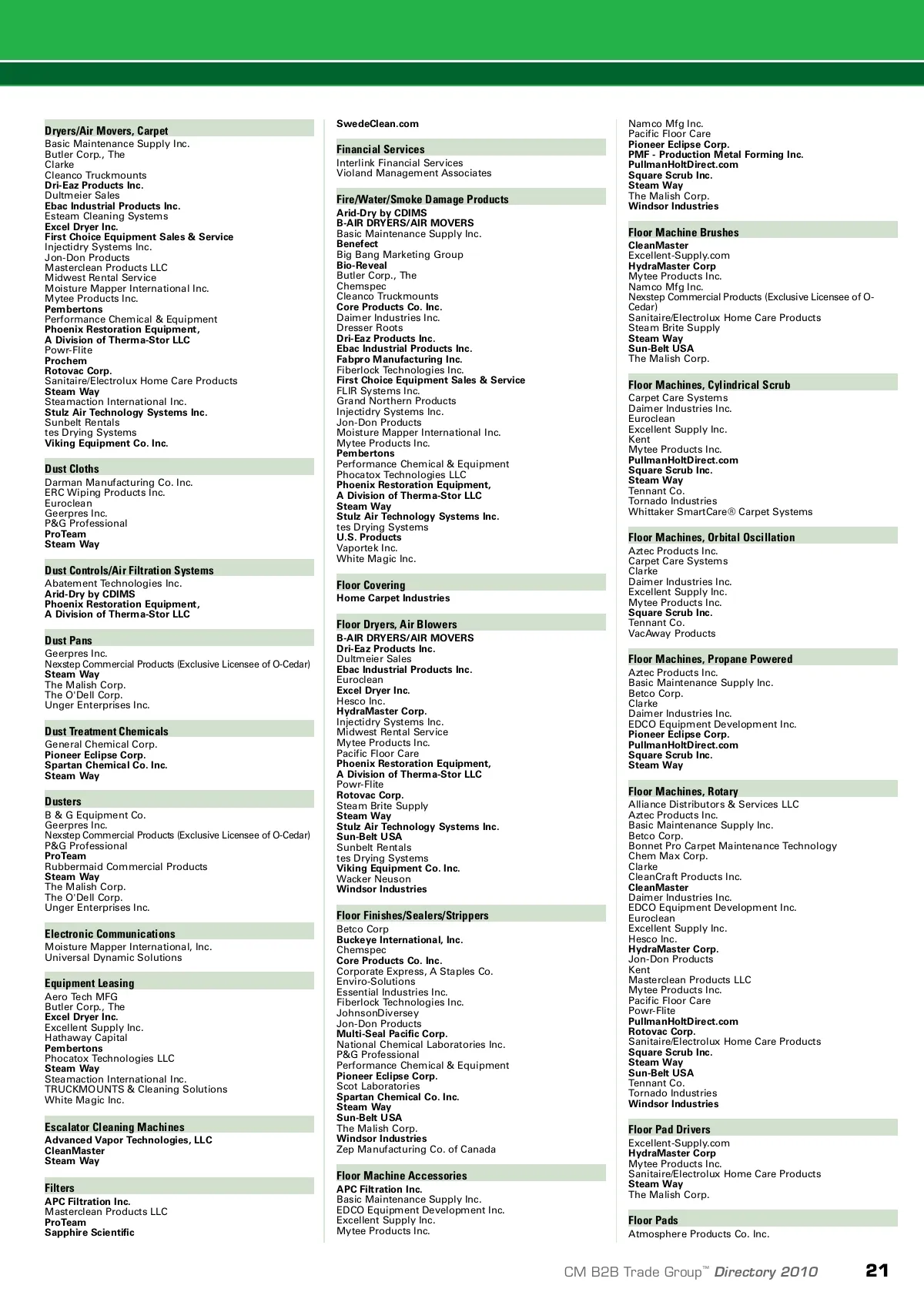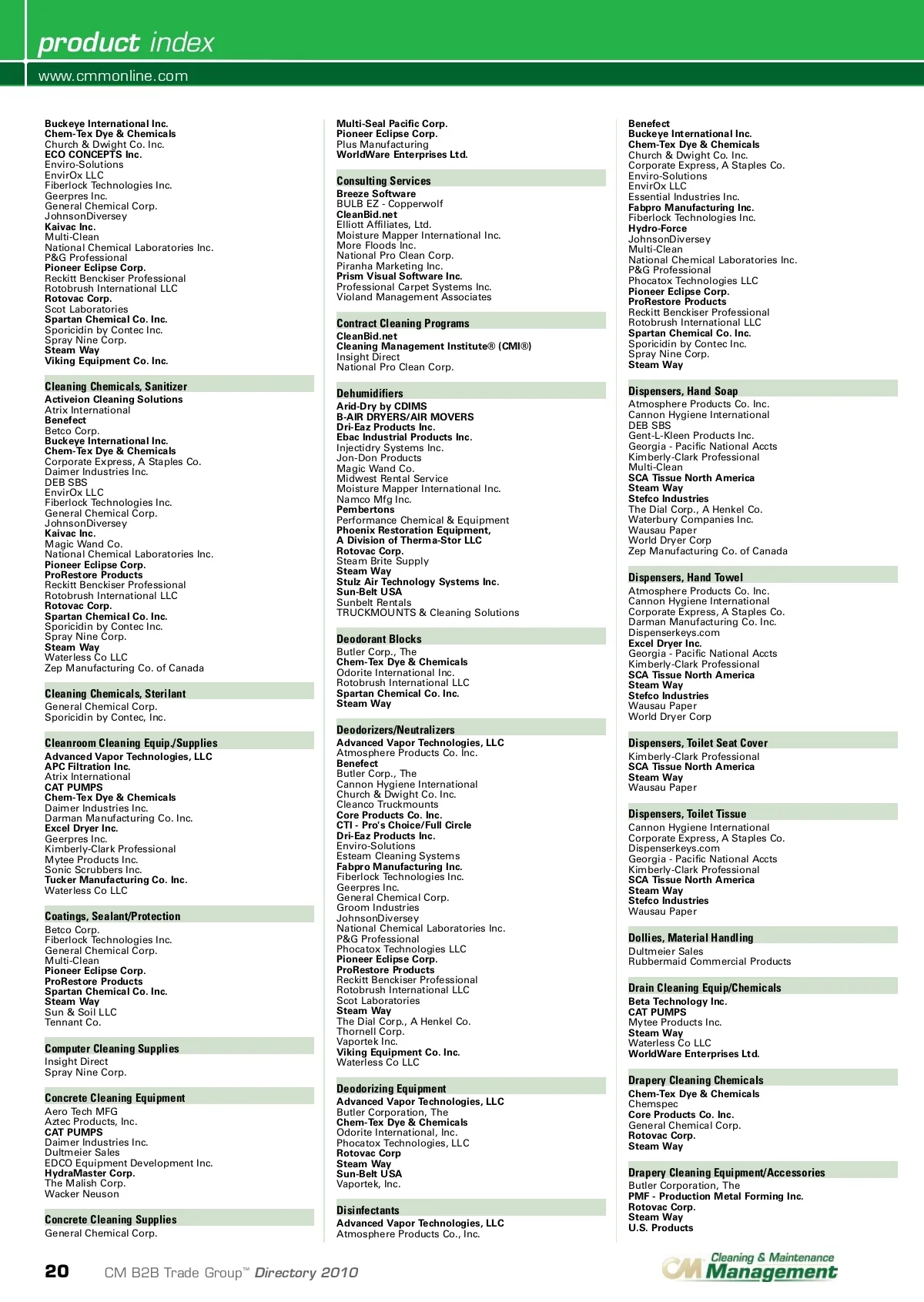product index www.cmmonline.com Buckeye International Inc. Chem-Tex Dye & Chemicals Church & Dwight Co. Inc. ECO CONCEPTS Inc. Enviro-Solutions EnvirOx LLC Fiberlock Technologies Inc. Geerpres Inc. General Chemical Corp. JohnsonDiversey Kaivac Inc. Multi-Clean National Chemical Laboratories Inc. P&G Professional Pioneer Eclipse Corp. Reckitt Benckiser Professional Rotobrush International LLC Rotovac Corp. Scot Laboratories Spartan Chemical Co. Inc. Sporicidin by Contec Inc. Spray Nine Corp. Steam Way Viking Equipment Co. Inc. Multi-Seal Pacific Corp. Pioneer Eclipse Corp. Plus Manufacturing WorldWare Enterprises Ltd. Benefect Buckeye International Inc. Chem-Tex Dye & Chemicals Church & Dwight Co. Inc. Corporate Express, A Staples Co. Enviro-Solutions EnvirOx LLC Essential Industries Inc. Fabpro Manufacturing Inc. Fiberlock Technologies Inc. Hydro-Force JohnsonDiversey Multi-Clean National Chemical Laboratories Inc. P&G Professional Phocatox Technologies LLC Pioneer Eclipse Corp. ProRestore Products Reckitt Benckiser Professional Rotobrush International LLC Spartan Chemical Co. Inc. Sporicidin by Contec Inc. Spray Nine Corp. Steam Way Consulting Services Breeze Software BULB EZ -Copperwolf CleanBid.net Elliott Affiliates, Ltd. Moisture Mapper International Inc. More Floods Inc. National Pro Clean Corp. Piranha Marketing Inc. Prism Visual Software Inc. Professional Carpet Systems Inc. Violand Management Associates Contract Cleaning Programs CleanBid.net Cleaning Management Institute® (CMI®) Insight Direct National Pro Clean Corp. Cleaning Chemicals, Sanitizer Activeion Cleaning Solutions Atrix International Benefect Betco Corp. Buckeye International Inc. Chem-Tex Dye & Chemicals Corporate Express, A Staples Co. Daimer Industries Inc. DEB SBS EnvirOx LLC Fiberlock Technologies Inc. General Chemical Corp. JohnsonDiversey Kaivac Inc. Magic Wand Co. National Chemical Laboratories Inc. Pioneer Eclipse Corp. ProRestore Products Reckitt Benckiser Professional Rotobrush International LLC Rotovac Corp. Spartan Chemical Co. Inc. Sporicidin by Contec Inc. Spray Nine Corp. Steam Way Waterless Co LLC Zep Manufacturing Co. of Canada Dehumidifiers Arid-Dry by CDIMS B-AIR DRYERS/AIR MOVERS Dri-Eaz Products Inc. Ebac Industrial Products Inc. Injectidry Systems Inc. Jon-Don Products Magic Wand Co. Midwest Rental Service Moisture Mapper International Inc. Namco Mfg Inc. Pembertons Performance Chemical & Equipment Phoenix Restoration Equipment, A Division of Therma-Stor LLC Rotovac Corp. Steam Brite Supply Steam Way Stulz Air Technology Systems Inc. Sun-Belt USA Sunbelt Rentals TRUCKMOUNTS & Cleaning Solutions Dispensers, Hand Soap Atmosphere Products Co. Inc. Cannon Hygiene International DEB SBS Gent-L-Kleen Products Inc. Georgia -Pacific National Accts Kimberly-Clark Professional Multi-Clean SCA Tissue North America Steam Way Stefco Industries The Dial Corp., A Henkel Co. Waterbury Companies Inc. Wausau Paper World Dryer Corp Zep Manufacturing Co. of Canada Dispensers, Hand Towel Atmosphere Products Co. Inc. Cannon Hygiene International Corporate Express, A Staples Co. Darman Manufacturing Co. Inc. Dispenserkeys.com Excel Dryer Inc. Georgia -Pacific National Accts Kimberly-Clark Professional SCA Tissue North America Steam Way Stefco Industries Wausau Paper World Dryer Corp Deodorant Blocks Butler Corp., The Chem-Tex Dye & Chemicals Odorite International Inc. Rotobrush International LLC Spartan Chemical Co. Inc. Steam Way Cleaning Chemicals, Sterilant General Chemical Corp. Sporicidin by Contec, Inc. Deodorizers/Neutralizers Cleanroom Cleaning Equip./Supplies Advanced Vapor Technologies, LLC APC Filtration Inc. Atrix International CAT PUMPS Chem-Tex Dye & Chemicals Daimer Industries Inc. Darman Manufacturing Co. Inc. Excel Dryer Inc. Geerpres Inc. Kimberly-Clark Professional Mytee Products Inc. Sonic Scrubbers Inc. Tucker Manufacturing Co. Inc. Waterless Co LLC Advanced Vapor Technologies, LLC Atmosphere Products Co. Inc. Benefect Butler Corp., The Cannon Hygiene International Church & Dwight Co. Inc. Cleanco Truckmounts Core Products Co. Inc. CTI -Pro's Choice/Full Circle Dri-Eaz Products Inc. Enviro-Solutions Esteam Cleaning Systems Fabpro Manufacturing Inc. Fiberlock Technologies Inc. Geerpres Inc. General Chemical Corp. Groom Industries JohnsonDiversey National Chemical Laboratories Inc. P&G Professional Phocatox Technologies LLC Pioneer Eclipse Corp. ProRestore Products Reckitt Benckiser Professional Rotobrush International LLC Scot Laboratories Steam Way The Dial Corp., A Henkel Co. Thornell Corp. Vaportek Inc. Viking Equipment Co. Inc. Waterless Co LLC Dispensers, Toilet Seat Cover Kimberly-Clark Professional SCA Tissue North America Steam Way Wausau Paper Dispensers, Toilet Tissue Cannon Hygiene International Corporate Express, A Staples Co. Dispenserkeys.com Georgia -Pacific National Accts Kimberly-Clark Professional SCA Tissue North America Steam Way Stefco Industries Wausau Paper Coatings, Sealant/Protection Betco Corp. Fiberlock Technologies Inc. General Chemical Corp. Multi-Clean Pioneer Eclipse Corp. ProRestore Products Spartan Chemical Co. Inc. Steam Way Sun & Soil LLC Tennant Co. Dollies, Material Handling Dultmeier Sales Rubbermaid Commercial Products Drain Cleaning Equip/Chemicals Beta Technology Inc. CAT PUMPS Mytee Products Inc. Steam Way Waterless Co LLC WorldWare Enterprises Ltd. Computer Cleaning Supplies Insight Direct Spray Nine Corp. Concrete Cleaning Equipment Aero Tech MFG Aztec Products, Inc. CAT PUMPS Daimer Industries Inc. Dultmeier Sales EDCO Equipment Development Inc. HydraMaster Corp. The Malish Corp. Wacker Neuson Deodorizing Equipment Advanced Vapor Technologies, LLC Butler Corporation, The Chem-Tex Dye & Chemicals Odorite International, Inc. Phocatox Technologies, LLC Rotovac Corp Steam Way Sun-Belt USA Vaportek, Inc. Drapery Cleaning Chemicals Chem-Tex Dye & Chemicals Chemspec Core Products Co. Inc. General Chemical Corp. Rotovac Corp. Steam Way Drapery Cleaning Equipm