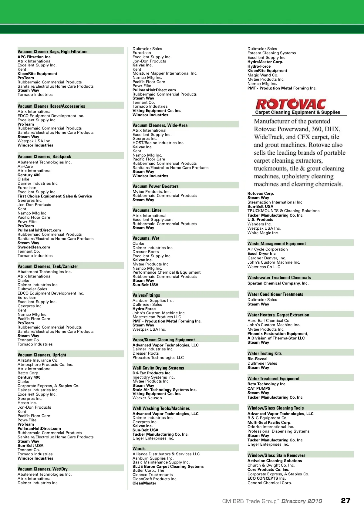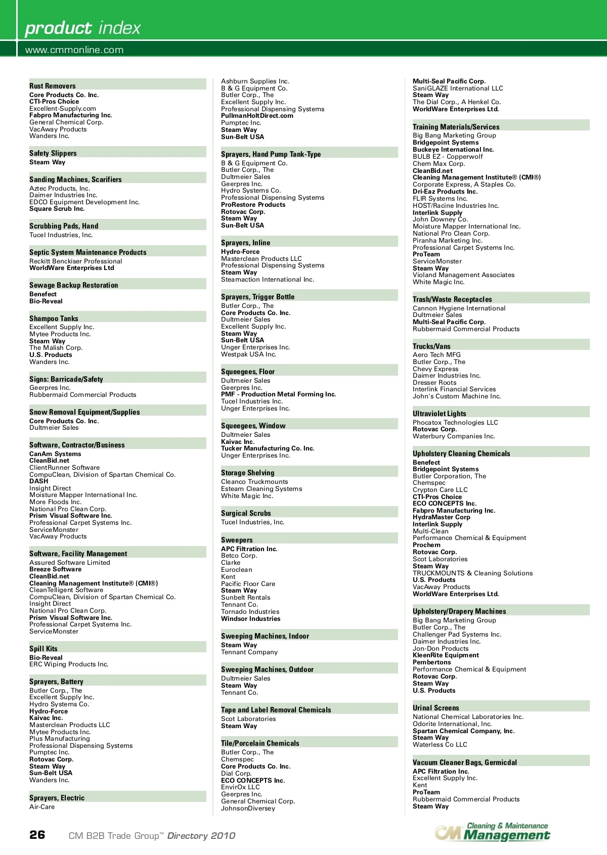 product index www.cmmonline.com Ashburn Supplies Inc. B & G Equipment Co. Butler Corp., The Excellent Supply Inc. Professional Dispensing Systems PullmanHoltDirect.com Pumptec Inc. Steam Way Sun-Belt USA Multi-Seal Pacific Corp. SaniGLAZE International LLC Steam Way The Dial Corp., A Henkel Co. WorldWare Enterprises Ltd. Rust Removers Core Products Co. Inc. CTI-Pros Choice Excellent-Supply.com Fabpro Manufacturing Inc. General Chemical Corp. VacAway Products Wanders Inc. Training Materials/Services Big Bang Marketing Group Bridgepoint Systems Buckeye International Inc. BULB EZ -Copperwolf Chem Max Corp. CleanBid.net Cleaning Management Institute® (CMI®) Corporate Express, A Staples Co. Dri-Eaz Products Inc. FLIR Systems Inc. HOST/Racine Industries Inc. Interlink Supply John Downey Co. Moisture Mapper International Inc. National Pro Clean Corp. Piranha Marketing Inc. Professional Carpet Systems Inc. ProTeam ServiceMonster Steam Way Violand Management Associates White Magic Inc. Safety Slippers Steam Way Sprayers, Hand Pump Tank-Type B & G Equipment Co. Butler Corp., The Dultmeier Sales Geerpres Inc. Hydro Systems Co. Professional Dispensing Systems ProRestore Products Rotovac Corp. Steam Way Sun-Belt USA Sanding Machines, Scarifiers Aztec Products, Inc. Daimer Industries Inc. EDCO Equipment Development Inc. Square Scrub Inc. Scrubbing Pads, Hand Tucel Industries, Inc. Sprayers, Inline Septic System Maintenance Products Reckitt Benckiser Professional WorldWare Enterprises Ltd Hydro-Force Masterclean Products LLC Professional Dispensing Systems Steam Way Steamaction International Inc. Sewage Backup Restoration Benefect Bio-Reveal Sprayers, Trigger Bottle Butler Corp., The Core Products Co. Inc. Dultmeier Sales Excellent Supply Inc. Steam Way Sun-Belt USA Unger Enterprises Inc. Westpak USA Inc. Trash/Waste Receptacles Cannon Hygiene International Dultmeier Sales Multi-Seal Pacific Corp. Rubbermaid Commercial Products Shampoo Tanks Excellent Supply Inc. Mytee Products Inc. Steam Way The Malish Corp. U.S. Products Wanders Inc. Trucks/Vans Aero Tech MFG Butler Corp., The Chevy Express Daimer Industries Inc. Dresser Roots Interlink Financial Services John's Custom Machine Inc. Squeegees, Floor Signs: Barricade/Safety Geerpres Inc. Rubbermaid Commercial Products Dultmeier Sales Geerpres Inc. PMF -Production Metal Forming Inc. Tucel Industries Inc. Unger Enterprises Inc. Snow Removal Equipment/Supplies Core Products Co. Inc. Dultmeier Sales Ultraviolet Lights Phocatox Technologies LLC Rotovac Corp. Waterbury Companies Inc. Squeegees, Window Dultmeier Sales Kaivac Inc. Tucker Manufacturing Co. Inc. Unger Enterprises Inc. Software, Contractor/Business CanAm Systems CleanBid.net ClientRunner Software CompuClean, Division of Spartan Chemical Co. DASH Insight Direct Moisture Mapper International Inc. More Floods Inc. National Pro Clean Corp. Prism Visual Software Inc. Professional Carpet Systems Inc. ServiceMonster VacAway Products Upholstery Cleaning Chemicals Benefect Bridgepoint Systems Butler Corporation, The Chemspec Crypton Care LLC CTI-Pros Choice ECO CONCEPTS Inc. Fabpro Manufacturing Inc. HydraMaster Corp Interlink Supply Multi-Clean Performance Chemical & Equipment Prochem Rotovac Corp. Scot Laboratories Steam Way TRUCKMOUNTS & Cleaning Solutions U.S. Products VacAway Products WorldWare Enterprises Ltd. Storage Shelving Cleanco Truckmounts Esteam Cleaning Systems White Magic Inc. Surgical Scrubs Tucel Industries, Inc. Sweepers APC Filtration Inc. Betco Corp. Clarke Euroclean Kent Pacific Floor Care Steam Way Sunbelt Rentals Tennant Co. Tornado Industries Windsor Industries Software, Facility Management Assured Software Limited Breeze Software CleanBid.net Cleaning Management Institute® (CMI®) CleanTelligent Software CompuClean, Division of Spartan Chemical Co. Insight Direct National Pro Clean Corp. Prism Visual Software Inc. Professional Carpet Systems Inc. ServiceMonster Upholstery/Drapery Machines Big Bang Marketing Group Butler Corp., The Challenger Pad Systems Inc. Daimer Industries Inc. Jon-Don Products KleenRite Equipment Pembertons Performance Chemical & Equipment Rotovac Corp. Steam Way U.S. Products Sweeping Machines, Indoor Steam Way Tennant Company Spill Kits Bio-Reveal ERC Wiping Products Inc. Sweeping Machines, Outdoor Dultmeier Sales Steam Way Tennant Co. Sprayers, Battery Butler Corp., The Excellent Supply Inc. Hydro Systems Co. Hydro-Force Kaivac Inc. Masterclean Products LLC Mytee Products Inc. Plus Manufacturing Professional Dispensing Systems Pumptec Inc. Rotovac Corp. Steam Way Sun-Belt USA Wanders Inc. Tape and Label Removal Chemicals Scot Laboratories Steam Way Urinal Screens National Chemical Laboratories Inc. Odorite International, Inc. Spartan Chemical Company, Inc. Steam Way Waterless Co LLC Tile/Porcelain Chemicals Butler Corp., The Chemspec Core Products Co. Inc. Dial Corp. ECO CONCEPTS Inc. EnvirOx LLC Geerpres Inc. General Chemical Corp. JohnsonDiversey Vacuum Cleaner Bags, Germicdal APC Filtration Inc. Excellent Supply Inc. Kent ProTeam Rubbermaid Commercial Products Steam Way Sprayers, Electric Air-Care 26 CM B2B Trade Group ™ Directory 2010