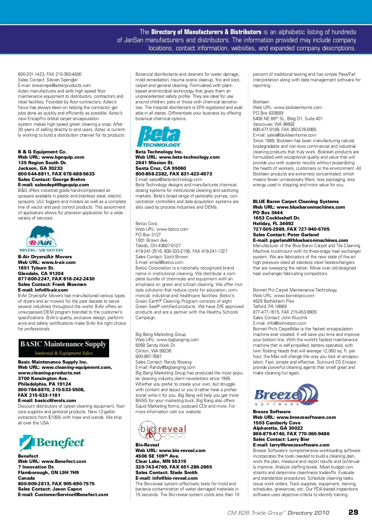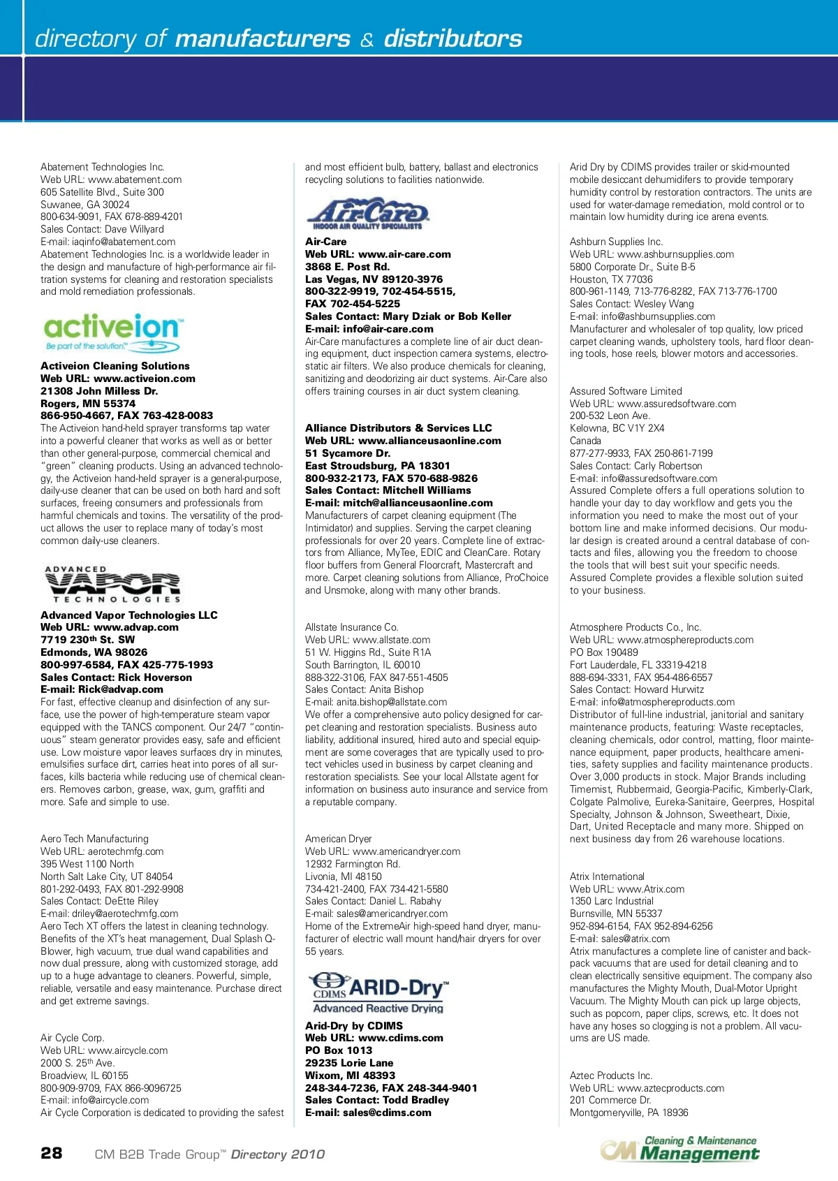 directory of manufacturers & distributors Abatement Technologies Inc. Web URL: www.abatement.com 605 Satellite Blvd., Suite 300 Suwanee, GA 30024 800-634-9091, FAX 678-889-4201 Sales Contact: Dave Willyard E-mail: [email protected] Abatement Technologies Inc. is a worldwide leader in the design and manufacture of high-performance air fil-tration systems for cleaning and restoration specialists and mold remediation professionals. and most efficient bulb, battery, ballast and electronics recycling solutions to facilities nationwide. Arid Dry by CDIMS provides trailer or skid-mounted mobile desiccant dehumidifers to provide temporary humidity control by restoration contractors. The units are used for water-damage remediation, mold control or to maintain low humidity during ice arena events. Ashburn Supplies Inc. Web URL: www.ashburnsupplies.com 5800 Corporate Dr., Suite B-5 Houston, TX 77036 800-961-1149, 713-776-8282, FAX 713-776-1700 Sales Contact: Wesley Wang E-mail: [email protected] Manufacturer and wholesaler of top quality, low priced carpet cleaning wands, upholstery tools, hard floor clean-ing tools, hose reels, blower motors and accessories. Activeion Cleaning Solutions Web URL: www.activeion.com 21308 John Milless Dr. Rogers, MN 55374 866-950-4667, FAX 763-428-0083 The Activeion hand-held sprayer transforms tap water into a powerful cleaner that works as well as or better than other general-purpose, commercial chemical and “green” cleaning products. Using an advanced technolo-gy, the Activeion hand-held sprayer is a general-purpose, daily-use cleaner that can be used on both hard and soft surfaces, freeing consumers and professionals from harmful chemicals and toxins. The versatility of the prod-uct allows the user to replace many of today’s most common daily-use cleaners. Air-Care Web URL: www.air-care.com 3868 E. Post Rd. Las Vegas, NV 89120-3976 800-322-9919, 702-454-5515, FAX 702-454-5225 Sales Contact: Mary Dziak or Bob Keller E-mail: [email protected] Air-Care manufactures a complete line of air duct clean-ing equipment, duct inspection camera systems, electro-static air filters. We also produce chemicals for cleaning, sanitizing and deodorizing air duct systems. Air-Care also offers training courses in air duct system cleaning. Alliance Distributors & Services LLC Web URL: www.allianceusaonline.com 51 Sycamore Dr. East Stroudsburg, PA 18301 800-932-2173, FAX 570-688-9826 Sales Contact: Mitchell Williams E-mail: [email protected] Manufacturers of carpet cleaning equipment (The Intimidator) and supplies. Serving the carpet cleaning professionals for over 20 years. Complete line of extrac-tors from Alliance, MyTee, EDIC and CleanCare. Rotary floor buffers from General Floorcraft, Mastercraft and more. Carpet cleaning solutions from Alliance, ProChoice and Unsmoke, along with many other brands. Assured Software Limited Web URL: www.assuredsoftware.com 200-532 Leon Ave. Kelowna, BC V1Y 2X4 Canada 877-277-9933, FAX 250-861-7199 Sales Contact: Carly Robertson E-mail: [email protected] Assured Complete offers a full operations solution to handle your day to day workflow and gets you the information you need to make the most out of your bottom line and make informed decisions. Our modu-lar design is created around a central database of con-tacts and files, allowing you the freedom to choose the tools that will best suit your specific needs. Assured Complete provides a flexible solution suited to your business. Advanced Vapor Technologies LLC Web URL: www.advap.com 7719 230 th St. SW Edmonds, WA 98026 800-997-6584, FAX 425-775-1993 Sales Contact: Rick Hoverson E-mail: [email protected] For fast, effective cleanup and disinfection of any sur-face, use the power of high-temperature steam vapor equipped with the TANCS component. Our 24/7 “contin-uous” steam generator provides easy, safe and efficient use. Low moisture vapor leaves surfaces dry in minutes, emulsifies surface dirt, carries heat into pores of all sur-faces, kills bacteria while reducing use of chemical clean-ers. Removes carbon, grease, wax, gum, graffiti and more. Safe and simple to use. Allstate Insurance Co. Web URL: www.allstate.com 51 W. Higgins Rd., Suite R1A South Barrington, IL 60010 888-322-3106, FAX 847-551-4505 Sales Contact: Anita Bishop E-mail: [email protected] We offer a comprehensive auto policy designed for car-pet cleaning and restoration specialists. Business auto liability, additional insured, hired auto and special equip-ment are some coverages that are typically used to pro-tect vehicles used in business by carpet cleaning and restoration specialists. See your local Allstate agent for information on business auto insurance and service from a reputable company. Aero Tech Manufacturing Web URL: aerotechmfg.com 395 West 1100 North North Salt Lake City, UT 84054 801-292-0493, FAX 801-292-9908 Sales Contact: DeEtte Riley E-mail: [email protected] Aero Tech XT offers the latest in cleaning technology. Benefits of the XT’s heat management, Dual Splash Q-Blower, high vacuum, true dual wand capabilities and now dual pressure, along with customized storage, add up to a huge advantage to cleaners. Powerful, simple, reliable, versatile and easy maintenance. Purchase direct and get extreme savings. American Dryer Web URL: www.americandryer.com 12932 Farmington Rd. Livonia, MI 48150 734-421-2400, FAX 734-421-5580 Sales Contact: Daniel L. Rabahy E-mail: [email protected] Home of the ExtremeAir high-speed hand dryer, manu-facturer of electric wall mount hand/hair dryers for over 55 years. Atmosphere Products Co., Inc. Web URL: www.atmosphereproducts.com PO Box 190489 Fort Lauderdale, FL 33319-4218 888-694-3331, FAX 954-486-6557 Sales Contact: Howard Hurwitz E-mail: [email protected] Distributor of full-line industrial, janitorial and sanitary maintenance products, featuring: Waste receptacles, cleaning chemicals, odor control, matting, floor mainte-nance equipment, paper products, healthcare ameni-ties, 