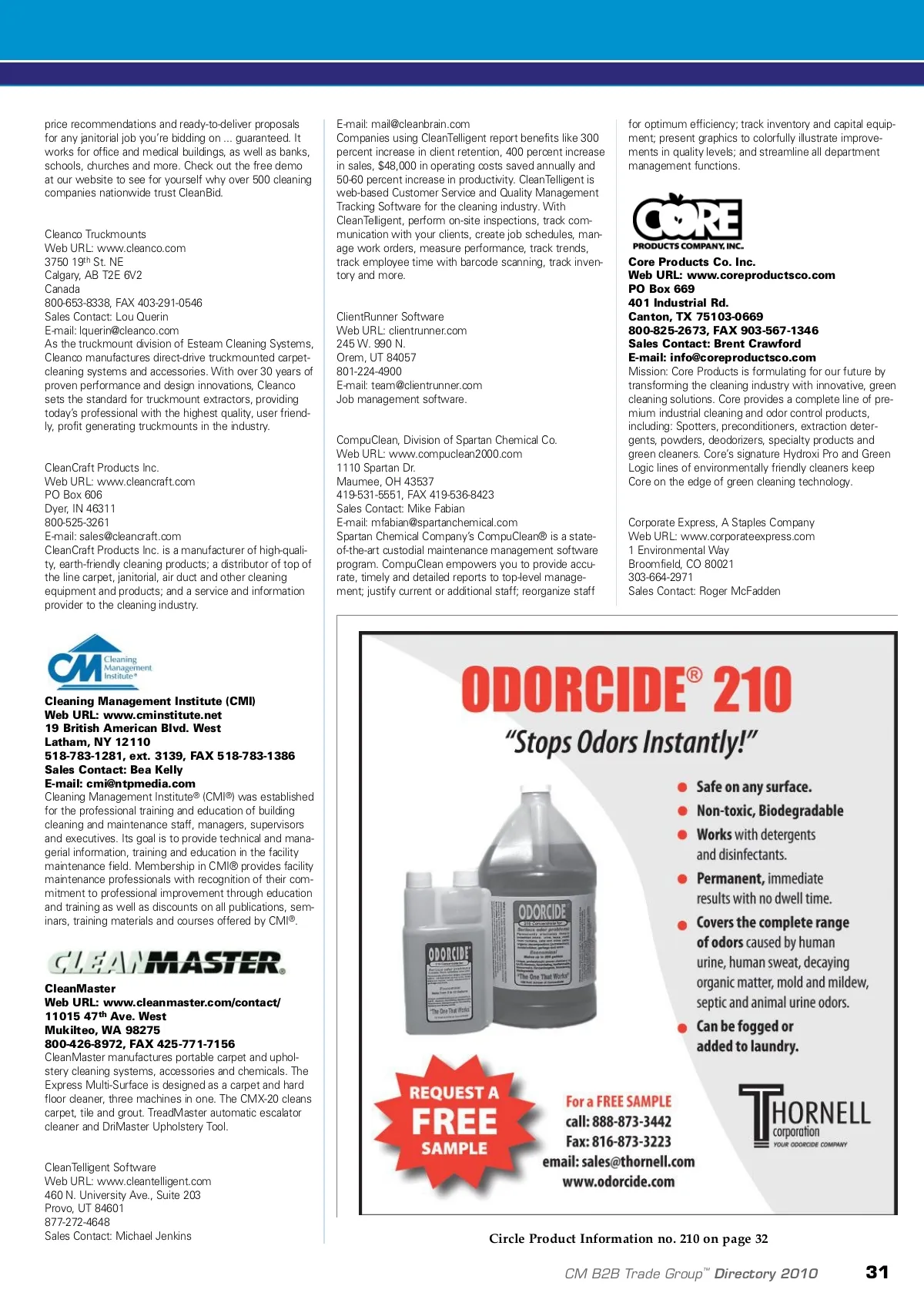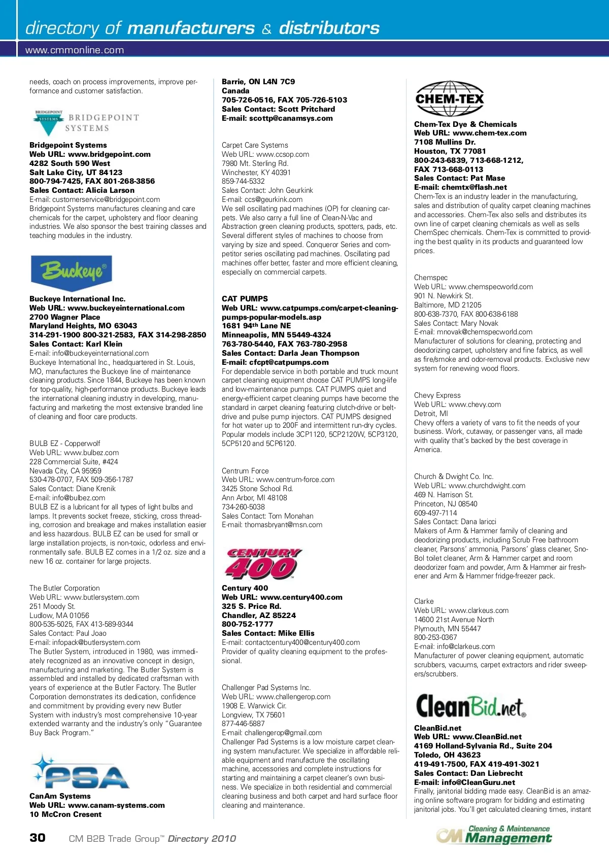 directory of manufacturers www.cmmonline.com needs, coach on process improvements, improve per-formance and customer satisfaction. & distributors Barrie, ON L4N 7C9 Canada 705-726-0516, FAX 705-726-5103 Sales Contact: Scott Pritchard E-mail: [email protected] Bridgepoint Systems Web URL: www.bridgepoint.com 4282 South 590 West Salt Lake City, UT 84123 800-794-7425, FAX 801-268-3856 Sales Contact: Alicia Larson E-mail: [email protected] Bridgepoint Systems manufactures cleaning and care chemicals for the carpet, upholstery and floor cleaning industries. We also sponsor the best training classes and teaching modules in the industry. Carpet Care Systems Web URL: www.ccsop.com 7980 Mt. Sterling Rd. Winchester, KY 40391 859-744-5332 Sales Contact: John Geurkink E-mail: [email protected] We sell oscillating pad machines (OP) for cleaning car-pets. We also carry a full line of Clean-N-Vac and Abstraction green cleaning products, spotters, pads, etc. Several different styles of machines to choose from varying by size and speed. Conqueror Series and com-petitor series oscillating pad machines. Oscillating pad machines offer better, faster and more efficient cleaning, especially on commercial carpets. Chem-Tex Dye & Chemicals Web URL: www.chem-tex.com 7108 Mullins Dr. Houston, TX 77081 800-243-6839, 713-668-1212, FAX 713-668-0113 Sales Contact: Pat Mase E-mail: [email protected] Chem-Tex is an industry leader in the manufacturing, sales and distribution of quality carpet cleaning machines and accessories. Chem-Tex also sells and distributes its own line of carpet cleaning chemicals as well as sells ChemSpec chemicals. Chem-Tex is committed to provid-ing the best quality in its products and guaranteed low prices. Buckeye International Inc. Web URL: www.buckeyeinternational.com 2700 Wagner Place Maryland Heights, MO 63043 314-291-1900 800-321-2583, FAX 314-298-2850 Sales Contact: Karl Klein E-mail: [email protected] Buckeye International Inc., headquartered in St. Louis, MO, manufactures the Buckeye line of maintenance cleaning products. Since 1844, Buckeye has been known for top-quality, high-performance products. Buckeye leads the international cleaning industry in developing, manu-facturing and marketing the most extensive branded line of cleaning and floor care products. BULB EZ -Copperwolf Web URL: www.bulbez.com 228 Commercial Suite, #424 Nevada City, CA 95959 530-478-0707, FAX 509-356-1787 Sales Contact: Diane Krenik E-mail: [email protected] BULB EZ is a lubricant for all types of light bulbs and lamps. It prevents socket freeze, sticking, cross thread-ing, corrosion and breakage and makes installation easier and less hazardous. BULB EZ can be used for small or large installation projects, is non-toxic, odorless and envi-ronmentally safe. BULB EZ comes in a 1/2 oz. size and a new 16 oz. container for large projects. CAT PUMPS Web URL: www.catpumps.com/carpet-cleaning-pumps-popular-models.asp 1681 94 th Lane NE Minneapolis, MN 55449-4324 763-780-5440, FAX 763-780-2958 Sales Contact: Darla Jean Thompson E-mail: [email protected] For dependable service in both portable and truck mount carpet cleaning equipment choose CAT PUMPS long-life and low-maintenance pumps. CAT PUMPS quiet and energy-efficient carpet cleaning pumps have become the standard in carpet cleaning featuring clutch-drive or belt-drive and pulse pump injectors. CAT PUMPS designed for hot water up to 200F and intermittent run-dry cycles. Popular models include 3CP1120, 5CP2120W, 5CP3120, 5CP5120 and 5CP6120. Chemspec Web URL: www.chemspecworld.com 901 N. Newkirk St. Baltimore, MD 21205 800-638-7370, FAX 800-638-6188 Sales Contact: Mary Novak E-mail: [email protected] Manufacturer of solutions for cleaning, protecting and deodorizing carpet, upholstery and fine fabrics, as well as fire/smoke and odor-removal products. Exclusive new system for renewing wood floors. Chevy Express Web URL: www.chevy.com Detroit, MI Chevy offers a variety of vans to fit the needs of your business. Work, cutaway, or passenger vans, all made with quality that’s backed by the best coverage in America. Centrum Force Web URL: www.centrum-force.com 3425 Stone School Rd. Ann Arbor, MI 48108 734-260-5038 Sales Contact: Tom Monahan E-mail: [email protected] Church & Dwight Co. Inc. Web URL: www.churchdwight.com 469 N. Harrison St. Princeton, NJ 08540 609-497-7114 Sales Contact: Dana Iaricci Makers of Arm & Hammer family of cleaning and deodorizing products, including Scrub Free bathroom cleaner, Parsons’ ammonia, Parsons’ glass cleaner, Sno-Bol toilet cleaner, Arm & Hammer carpet and room deodorizer foam and powder, Arm & Hammer air fresh-ener and Arm & Hammer fridge-freezer pack. Clarke Web URL: www.clarkeus.com 14600 21st Avenue North Plymouth, MN 55447 800-253-0367 E-mail: [email protected] Manufacturer of power cleaning equipment, automatic scrubbers, vacuums, carpet extractors and rider sweep-ers/scrubbers. The Butler Corporation Web URL: www.butlersystem.com 251 Moody St. Ludlow, MA 01056 800-535-5025, FAX 413-589-9344 Sales Contact: Paul Joao E-mail: [email protected] The Butler System, introduced in 1980, was immedi-ately recognized as an innovative concept in design, manufacturing and marketing. The Butler System is assembled and installed by dedicated craftsman with years of experience at the Butler Factory. The Butler Corporation demonstrates its dedication, confidence and commitment by providing every new Butler System with industry’s most comprehensive 10-year extended warranty and the industry’s only “Guarantee Buy Back Program.” Century 400 Web URL: www.century400.com 325 S. Price Rd. Chandler, AZ 85224 800-752-1777 Sales Contact: Mike Ellis E-mail: [email protected] Provider of quality cleaning equipment to the profes-sional. CanAm Systems Web URL: www.canam-systems.com 10 McCron Cresent Challenger Pad Systems Inc. Web URL: www.challengerop.com 1908 E. Warwick Cir. Longview, TX 75601 877-446-5887 E-mail: [email protected] Challenge